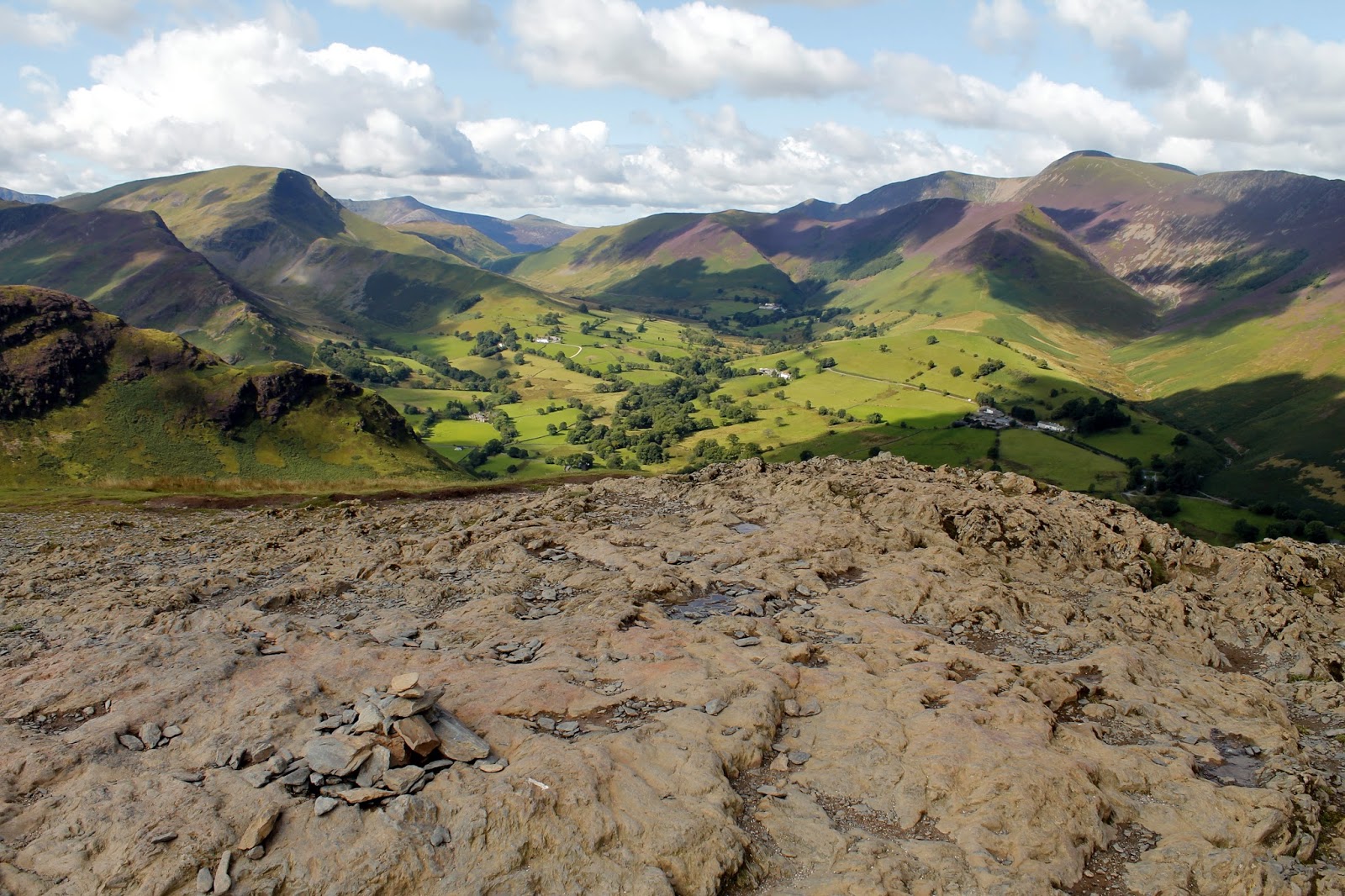 The summit is all rock with many loose stones lying amid the small outcrops. The view from the top of Catbells gives a fine panorama which is dominated by the aerial view of Derwentwater.