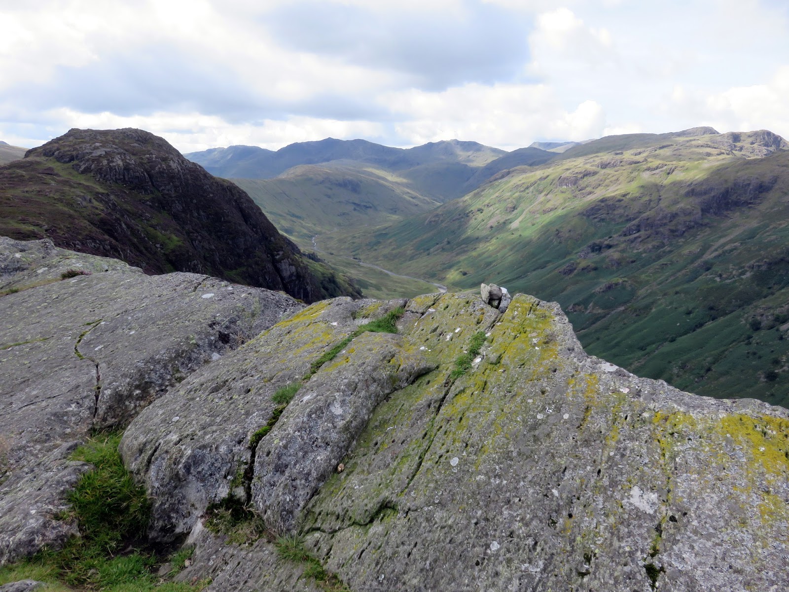 A small cairn marks the summit, balanced on a tilted slab of rock, with crags a few yards distant to west and north. The view from the top of the fell is best to the north and west with Borrowdale and the Langstrath valley clearly in view.