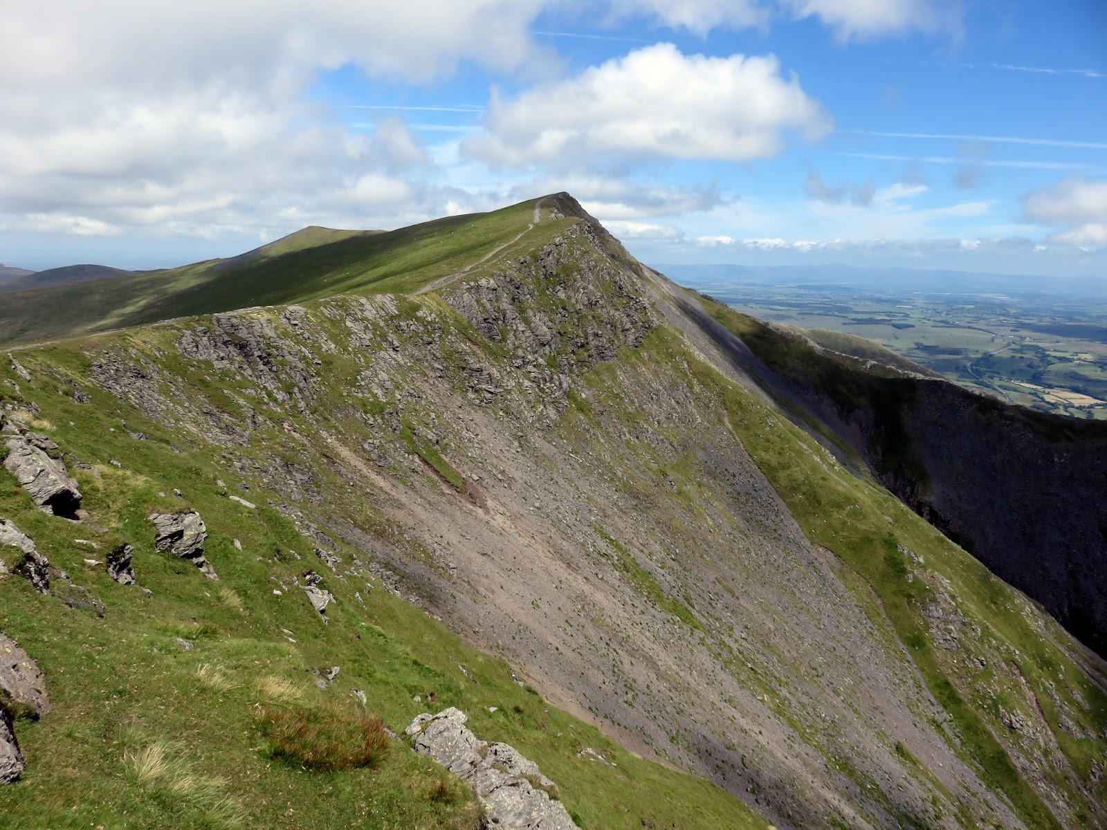 Wainwright recorded more routes of ascent for Blencathra than any other fell. Blease Fell and Scales Fell provided easy walking on grass and fast routes of descent. Gategill Fell he noted as dull until the final arête is reached, while Hallsfell and Doddick Fell both received praise.