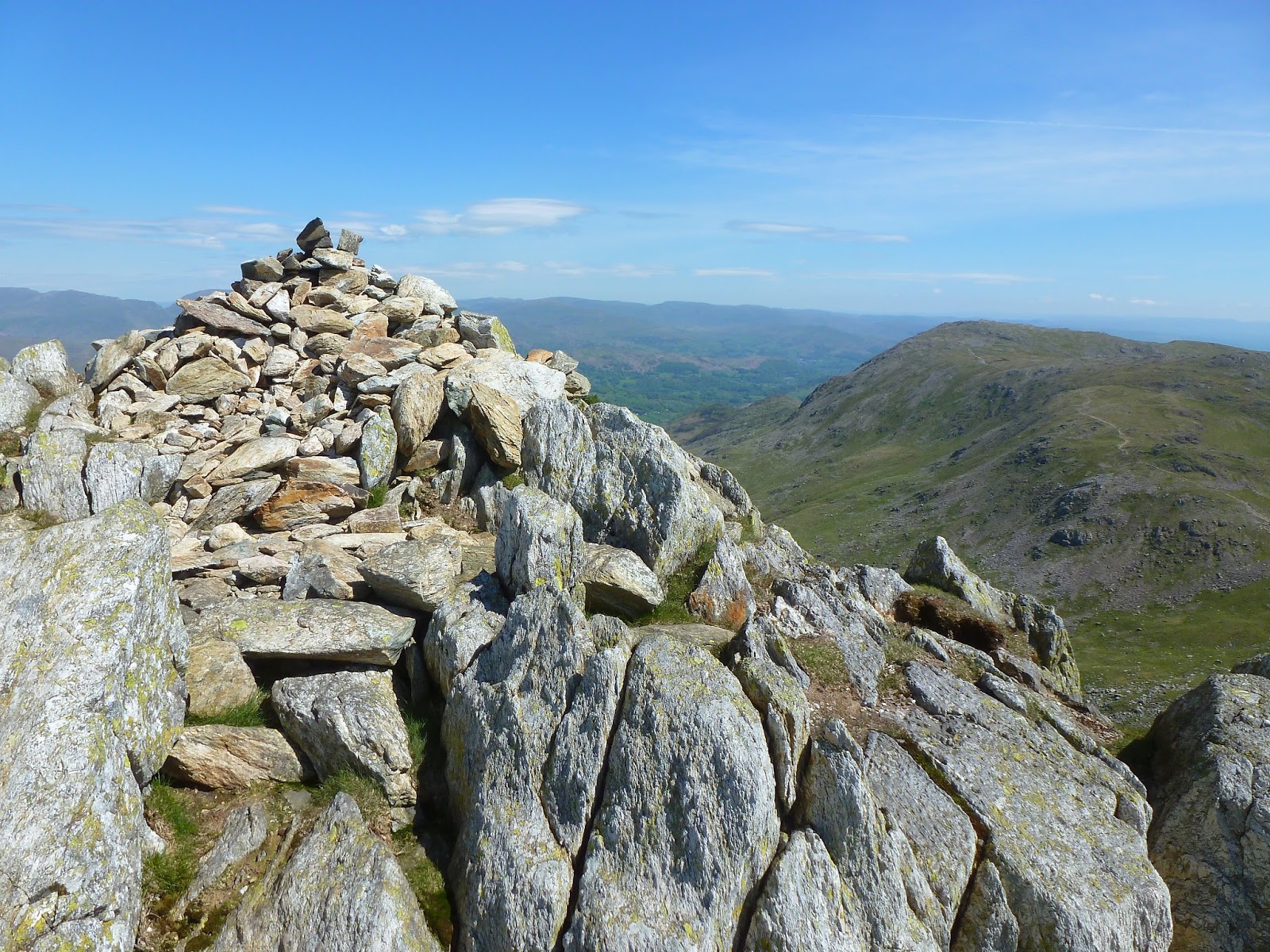 The summit of Great Carrs is marked by a small cairn on grass, perched above the rocky abyss of the head of Greenburn. The view to the north takes in serried ranks of fells while in other directions the Isle of Man and Pennines can be seen.