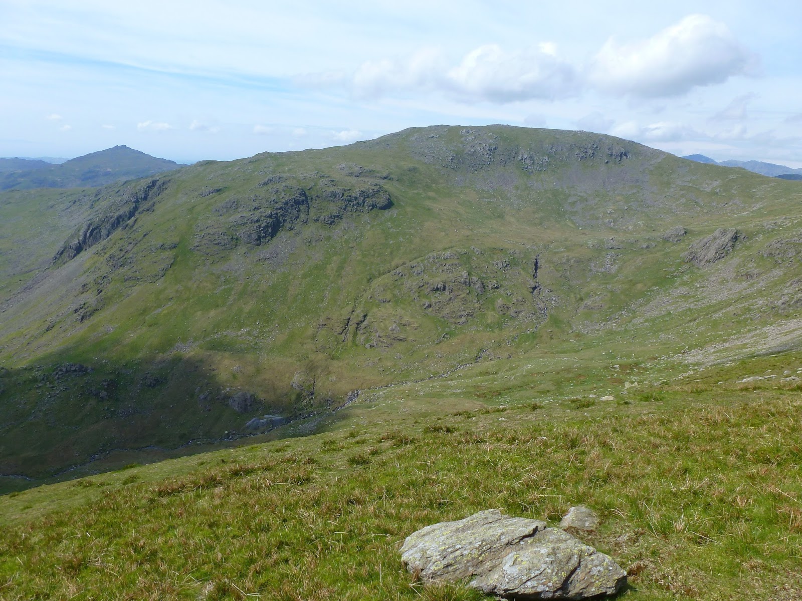 The summit of the fell is stony with two cairned rock outcrops, the southeasterly is the higher while the northwesterly offers the better view. There is a good view of the Scafell massif and the other Coniston fells are well seen along the ridge to the south.