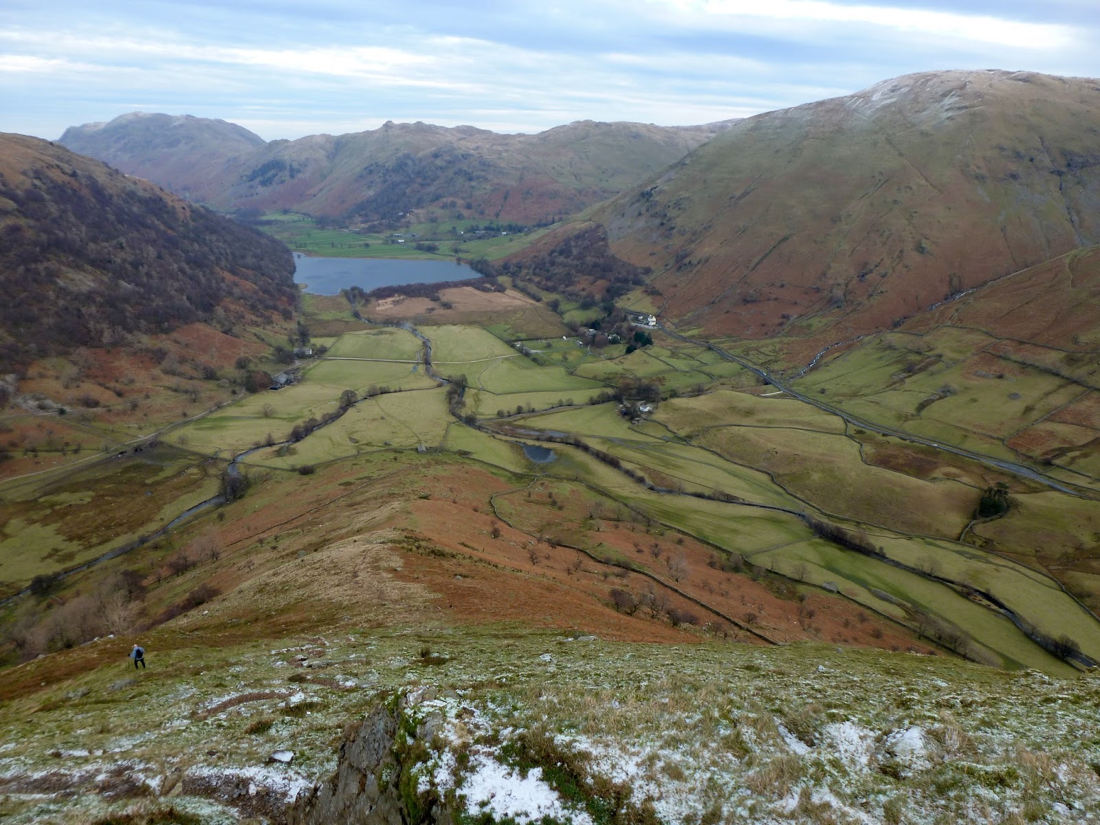 The summit is home to a small cairn at the point where the ridge briefly levels out. The view is limited due the higher fells surrounding, but many of these are seen in close detail. Looking north, however, provides an excellent view of the Hartsop valley and the southern end of Ullswater.
