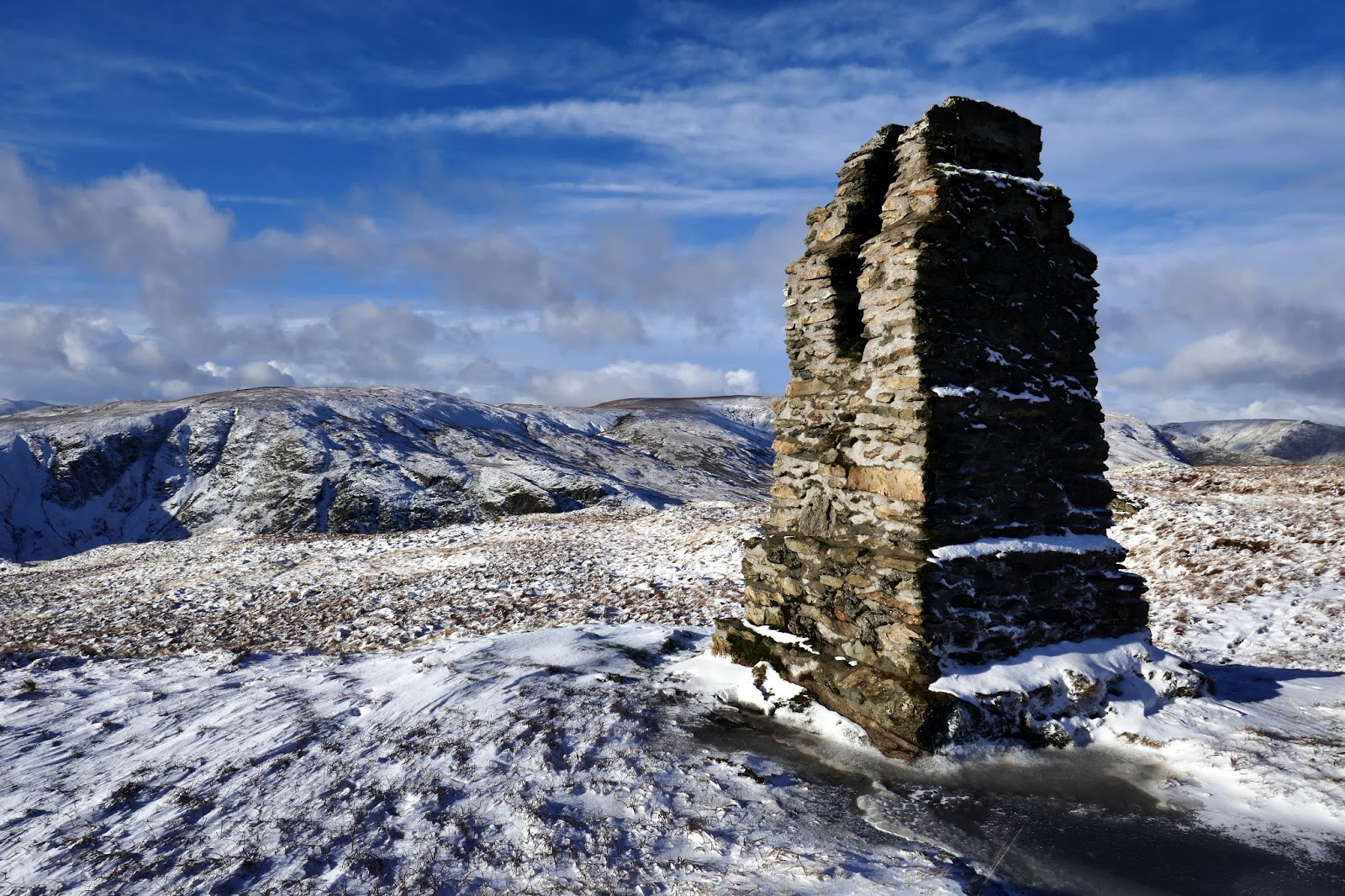 A man-made feature near to the summit is the remains of a surveying pillar. This unusual stone and concrete construction is cleft at the top to provide a sight line and was originally surrounded by a wooden frame, now decayed. This is one of four such pillars built during the construction of the Haweswater aqueduct.
