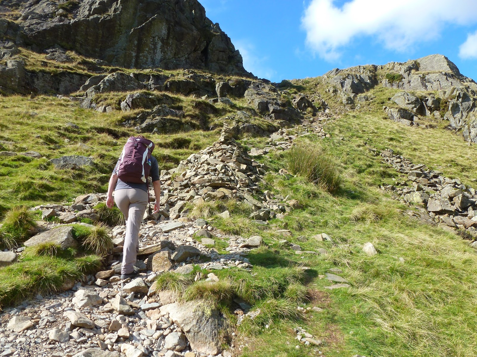 | Sara, sans outer layer now, starts the climb up alongside Stickle Ghyll |