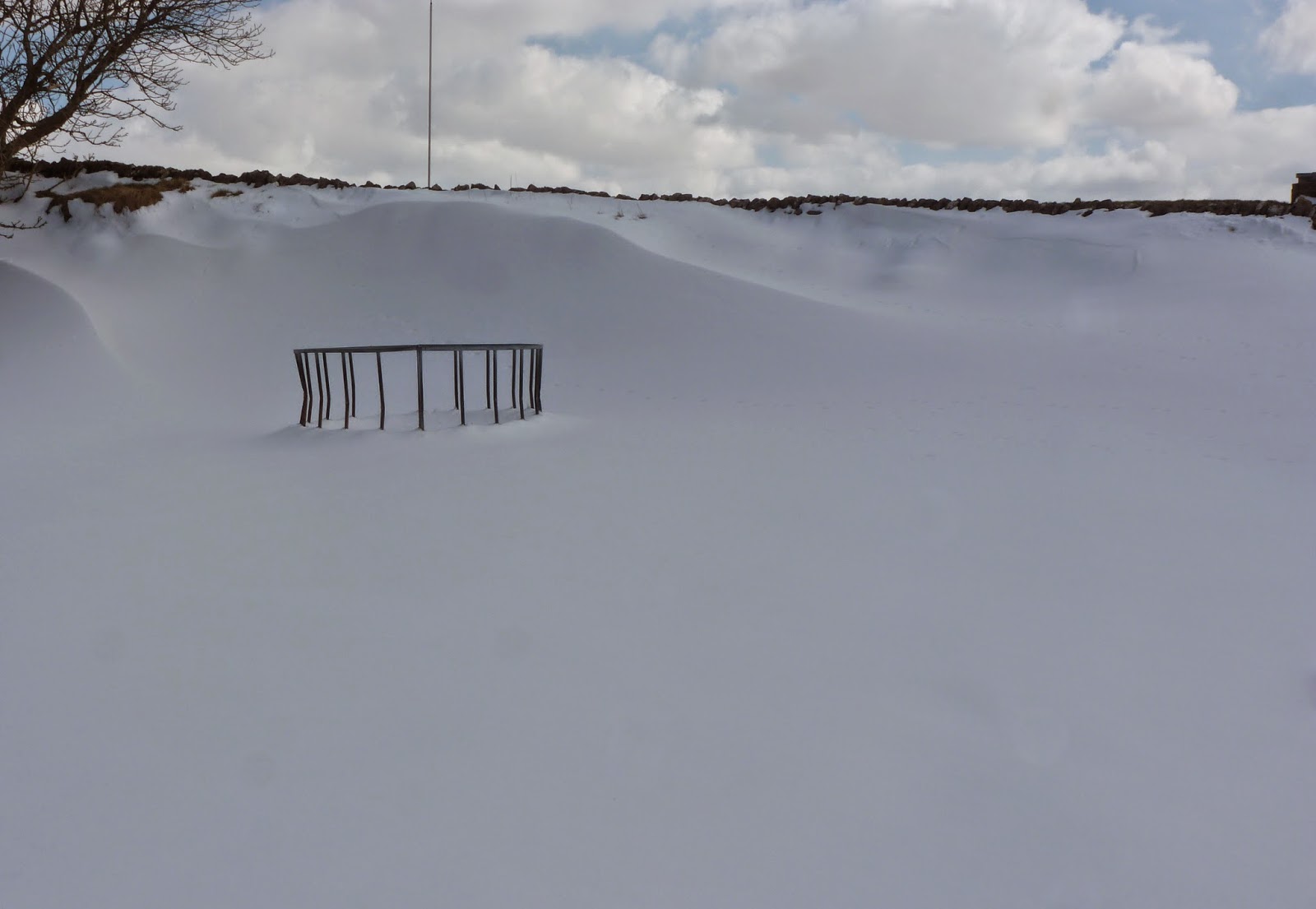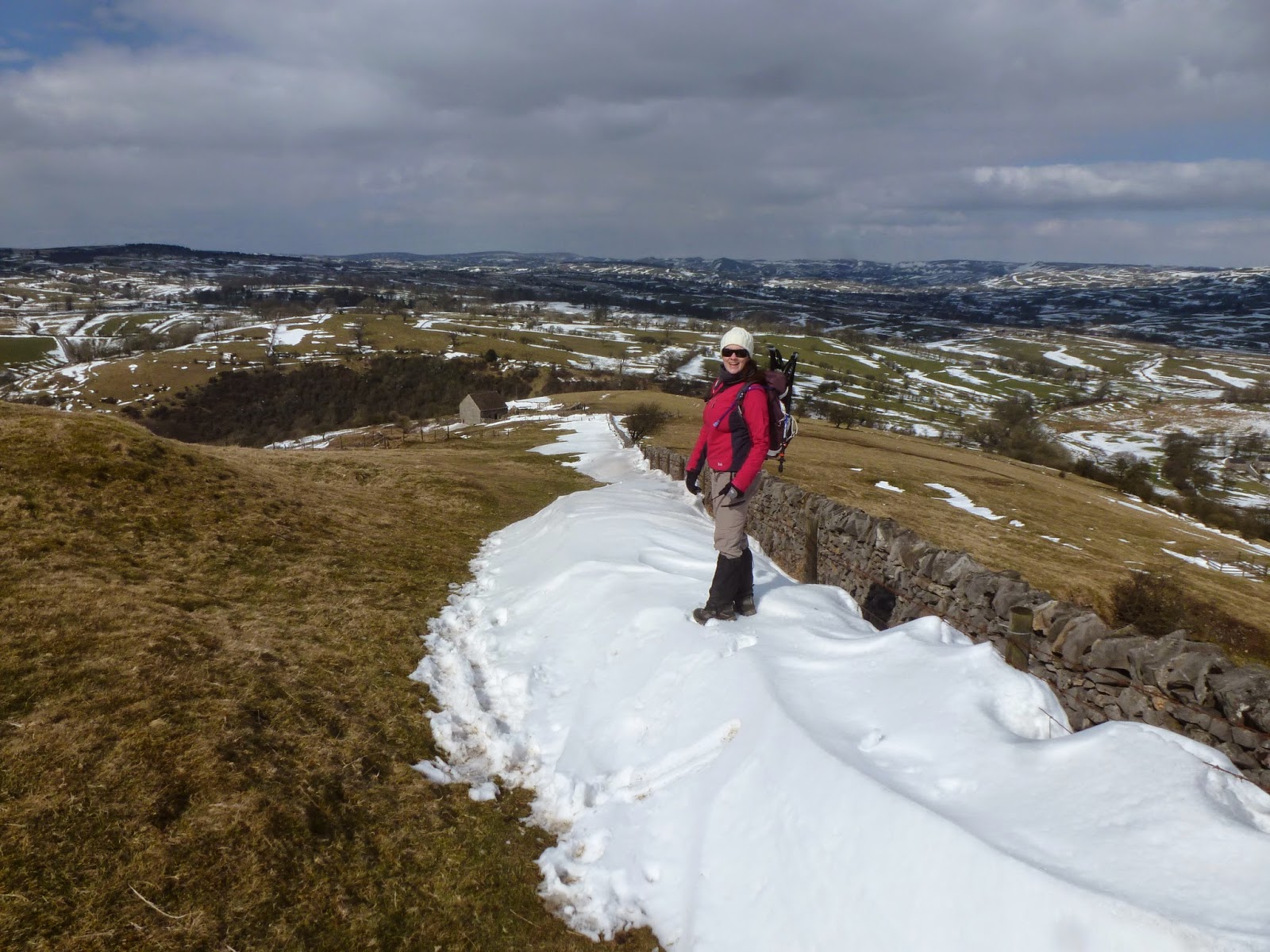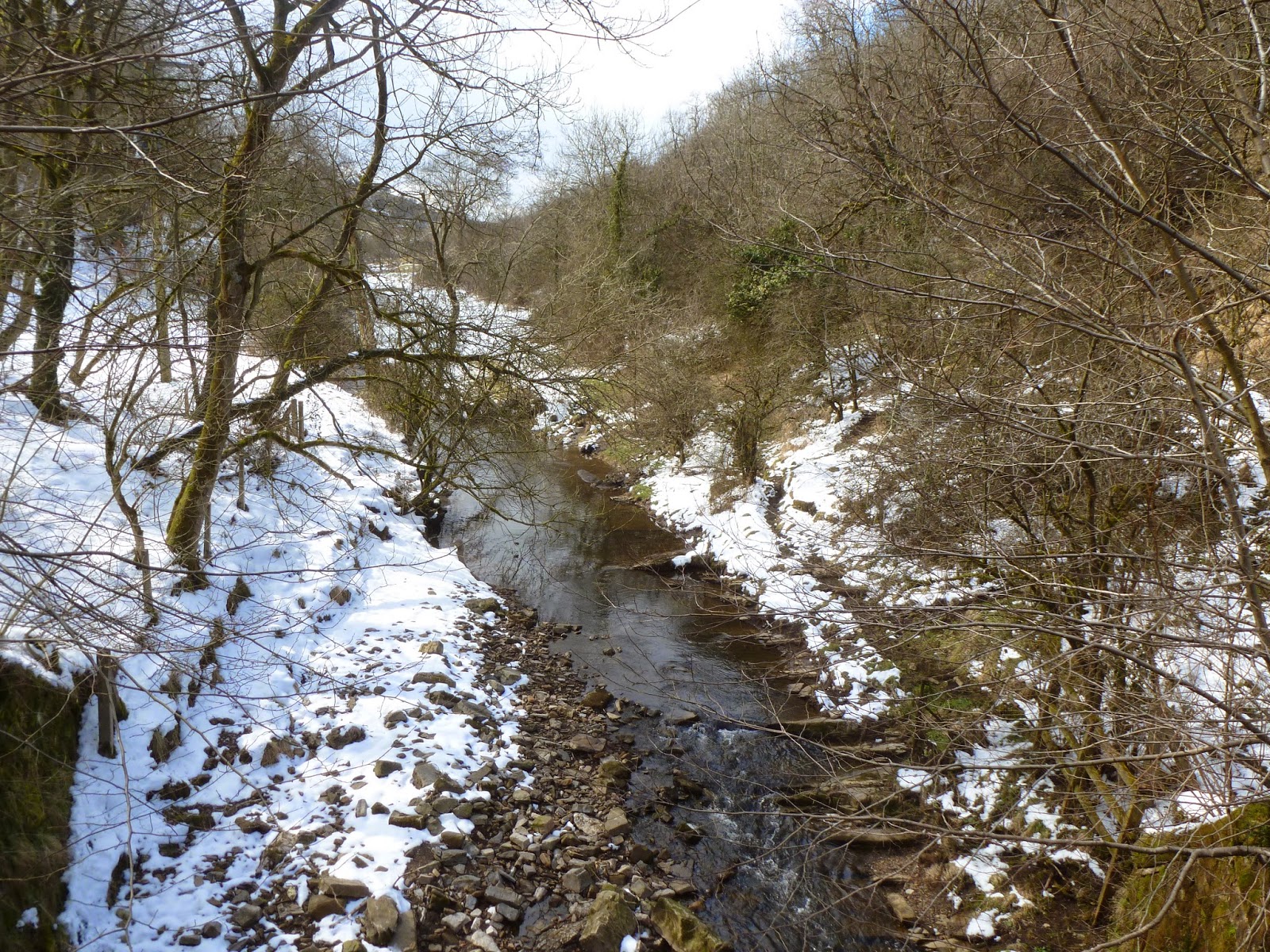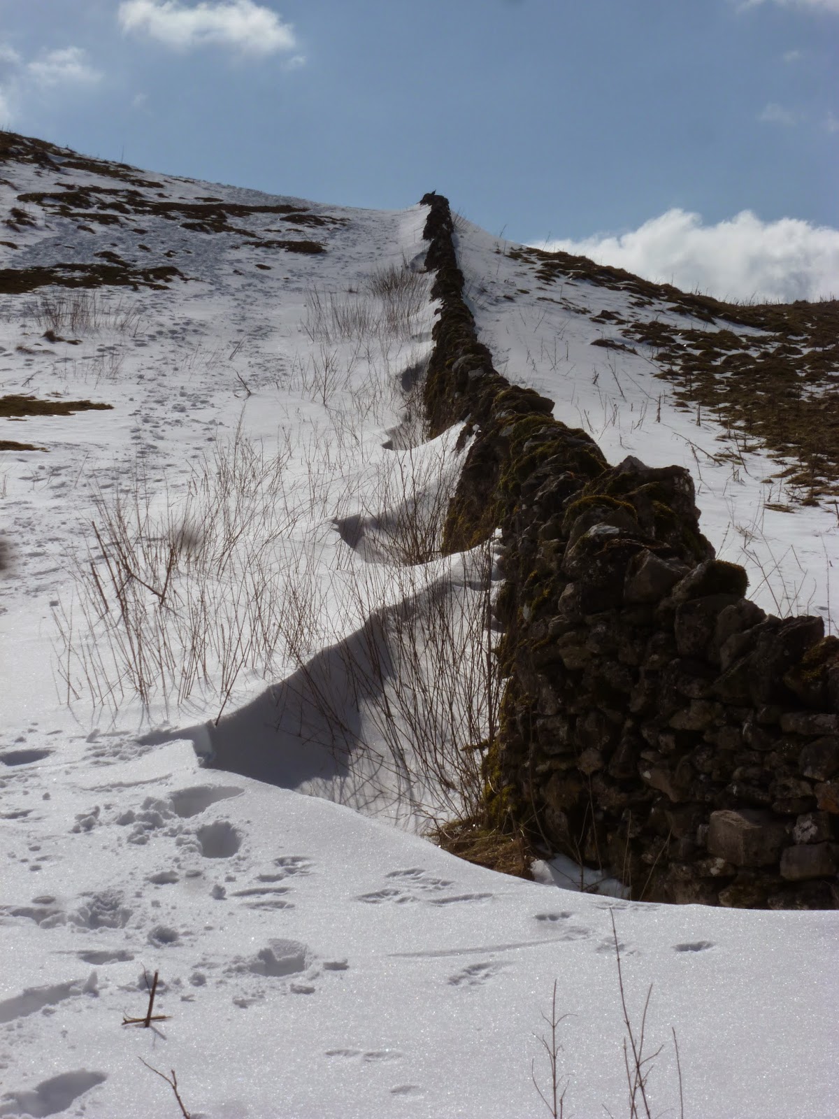 We followed the drystone wall down the valley, keen to have a good tramp around in the snow that had piled up alongside it. The wall drops into the valley of a small stream before it begins a climb up the flanks of Ecton Hill, an historically important area for mining.