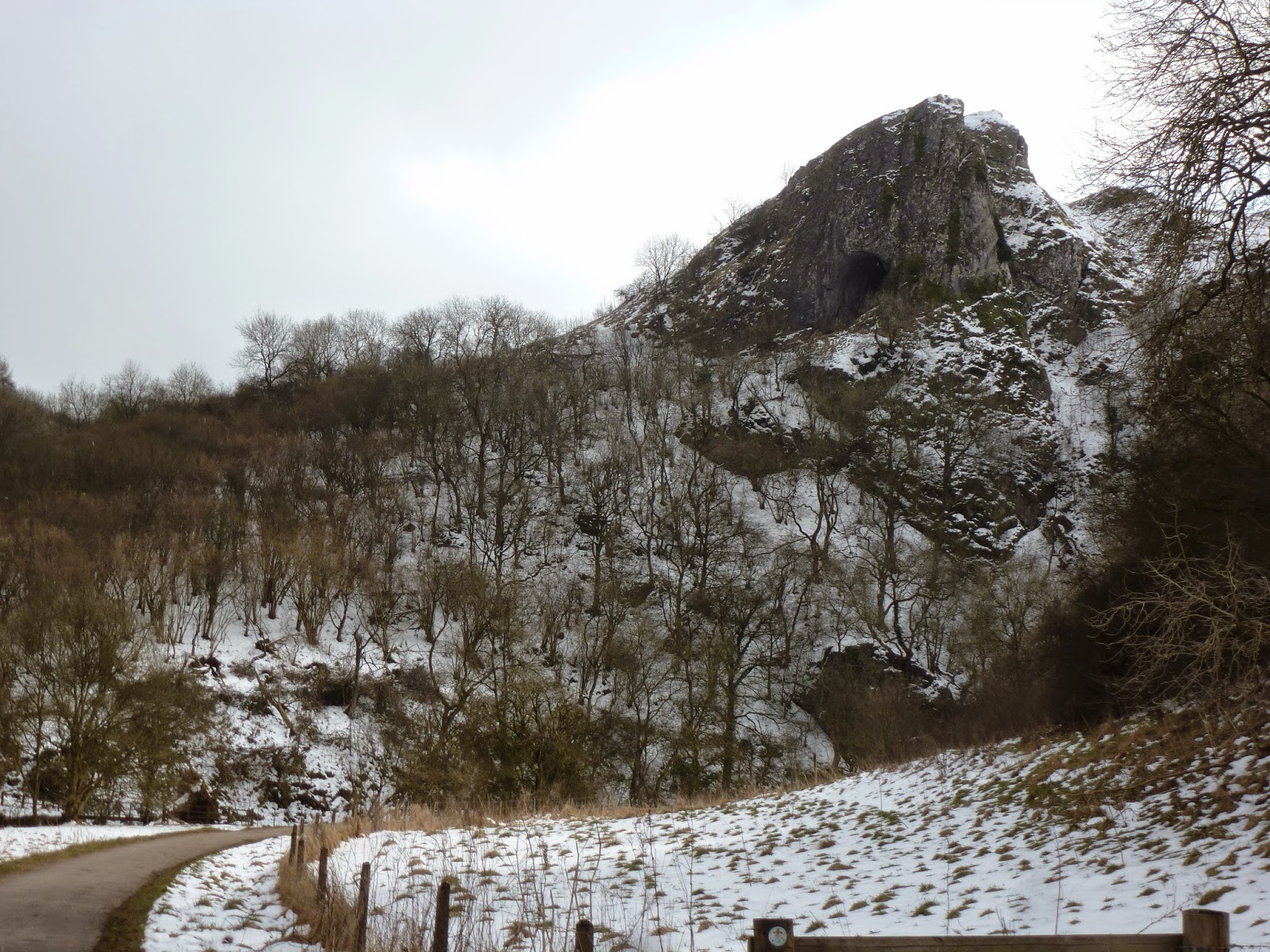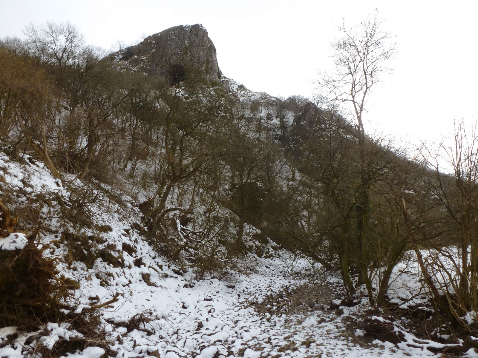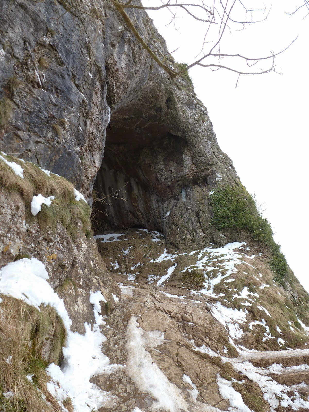 A path heading up a narrow valley towards Wetton has a well marked junction which gives access to the stepped path through the woods to Thor’s Cave. It is quite a steep climb in places, made marginally more difficult on this occasion by the ice and snow that had gathered. Towards the top of the path, the trees open up revealing the huge cave entrance.