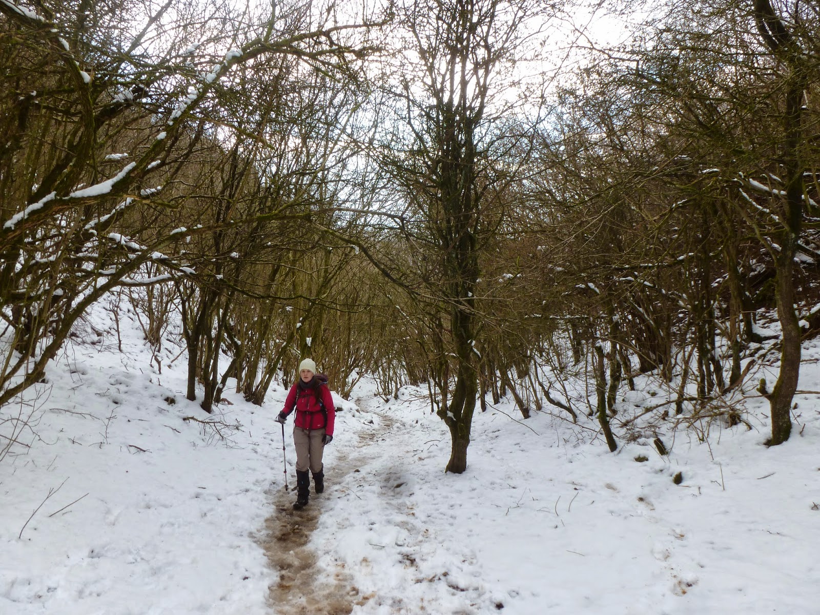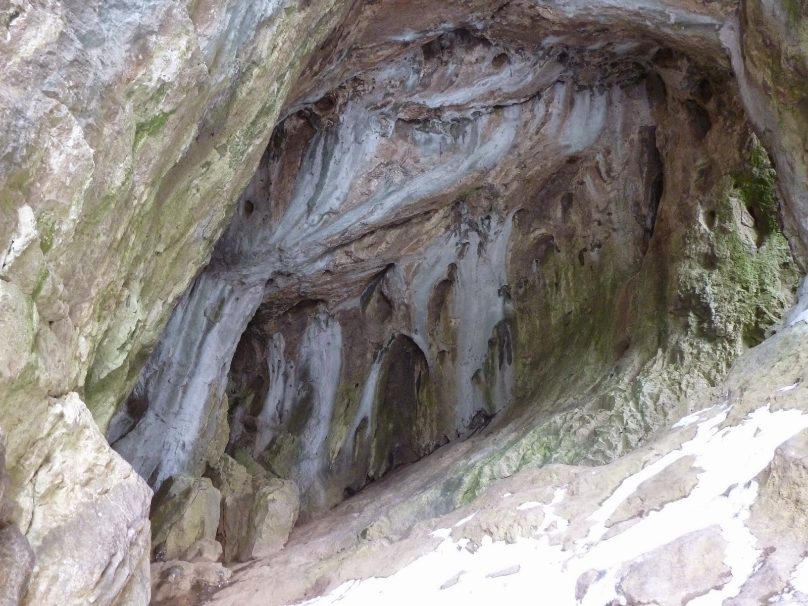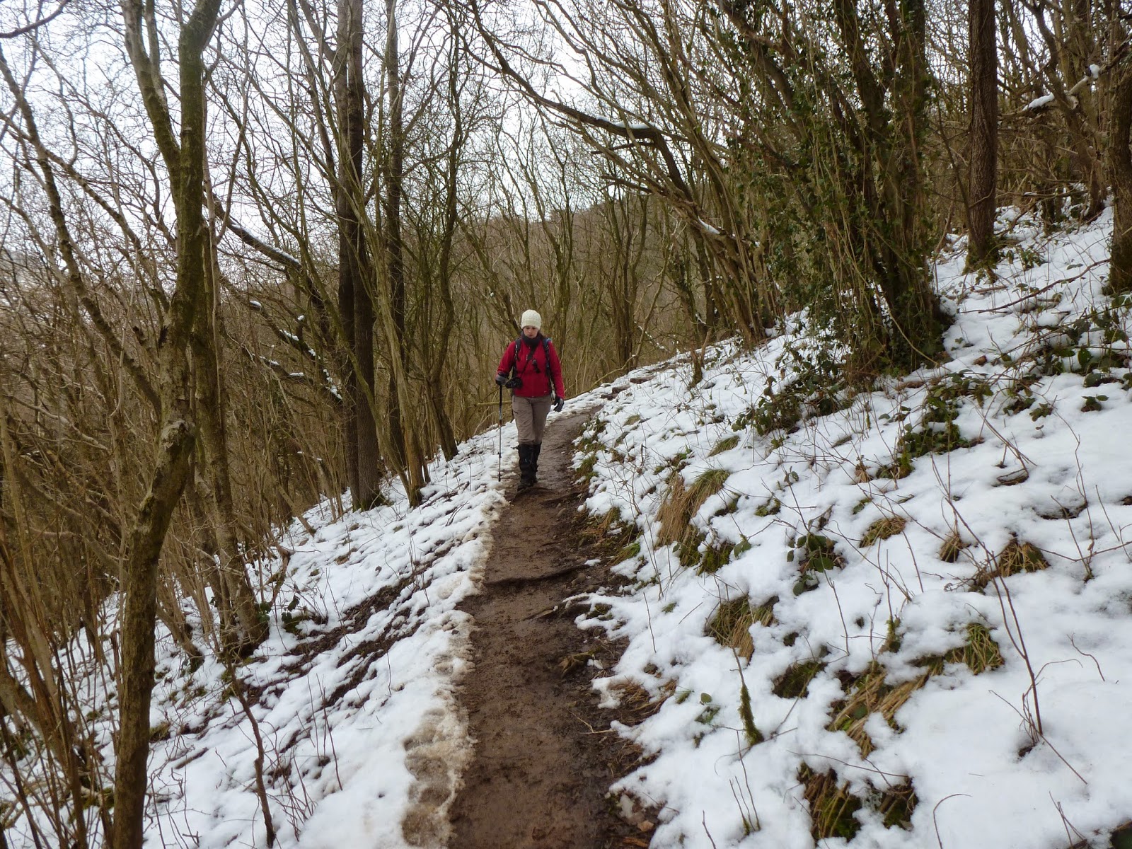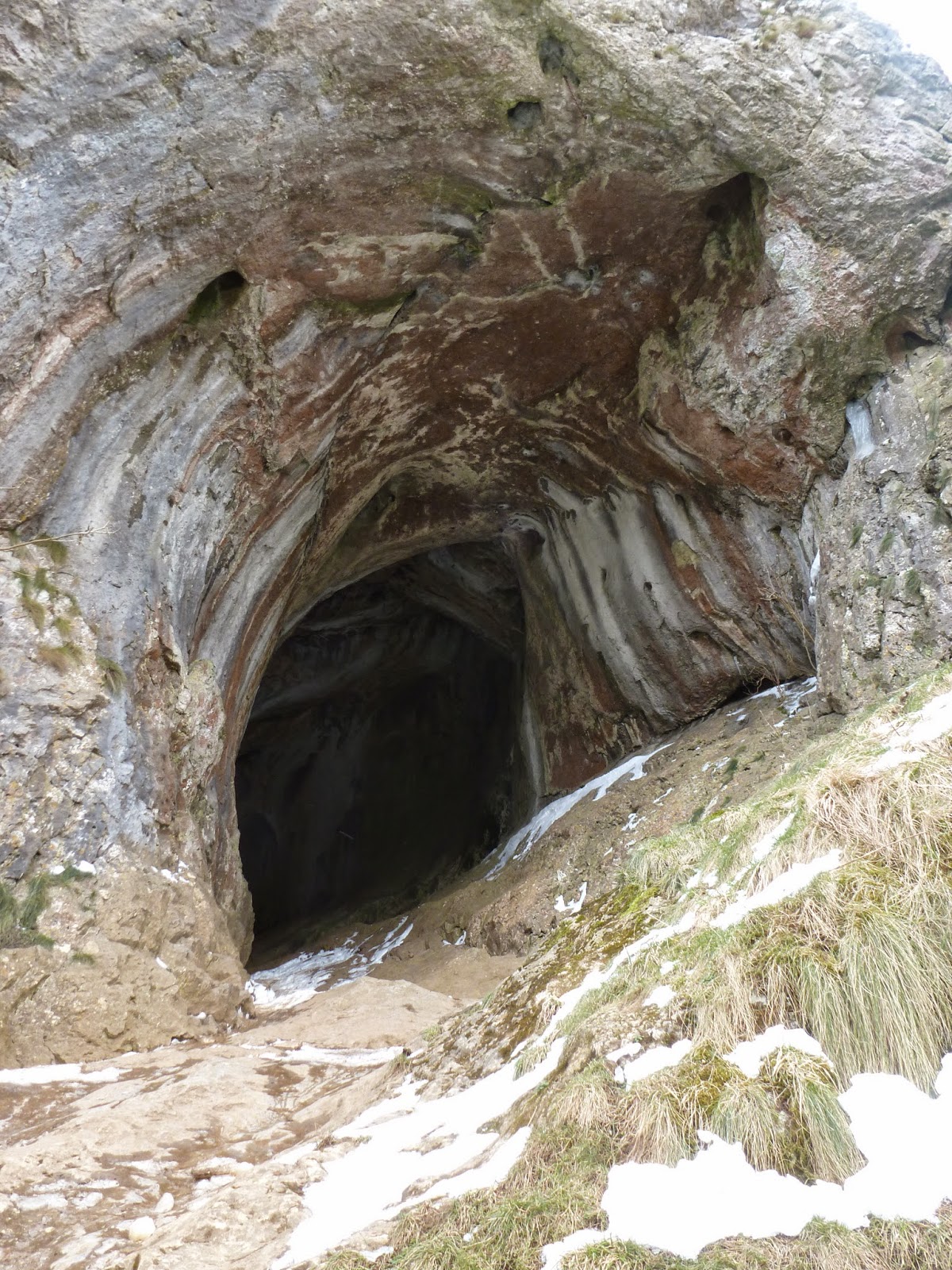 A path heading up a narrow valley towards Wetton has a well marked junction which gives access to the stepped path through the woods to Thor’s Cave. It is quite a steep climb in places, made marginally more difficult on this occasion by the ice and snow that had gathered. Towards the top of the path, the trees open up revealing the huge cave entrance.