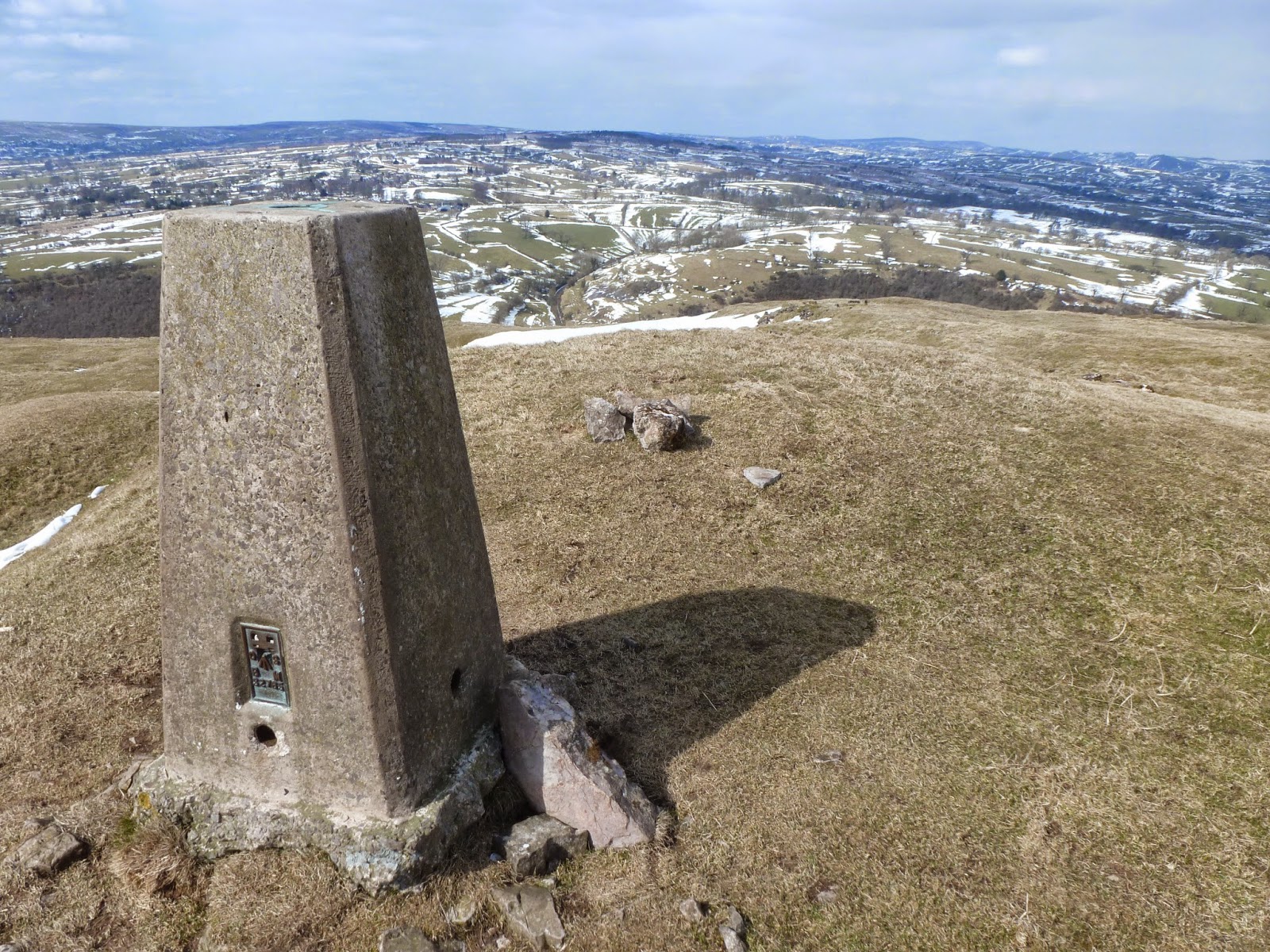It was a short climb to the summit of Ecton Hill, along the road adjacent to Lees Farm where it joins a path running along the crest of the hill. The highest point is marked by a trig pillar. Despite a modest height, Ecton Hill sits on the edge of the valleys of both the Manifold and Dove rivers and, given the steep sides of the northern slopes, affords an expansive view across the countryside.