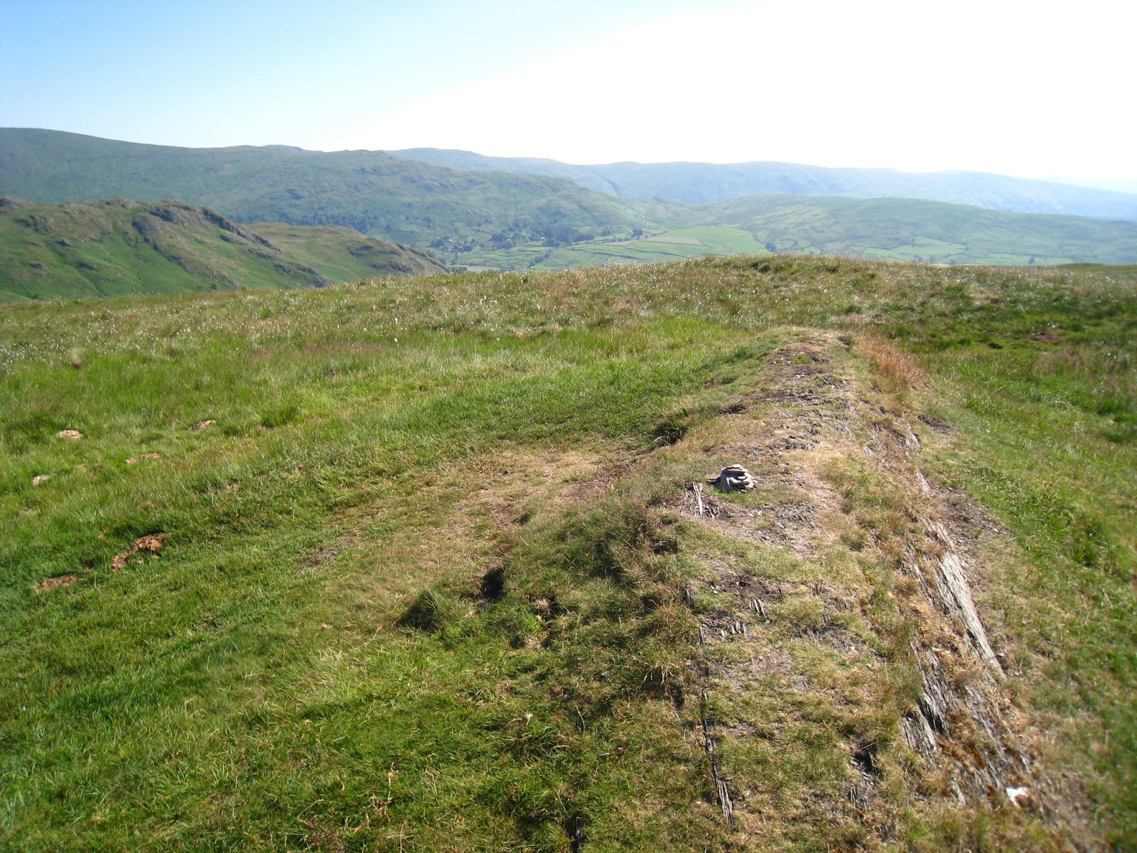 Feeling tired, we opted to exploit the Access Land and, instead of following the path towards Brockstones, we cut straight down the hillside to meet the path that leads to Hallow Bank. Back in the valley, the temperature was again apparent and our water supplies had now started to run out. Thankfully a pleasant stroll through the farmland in the valley along Low Lane led us back to the church in Kentmere and the reward of a sit-down.