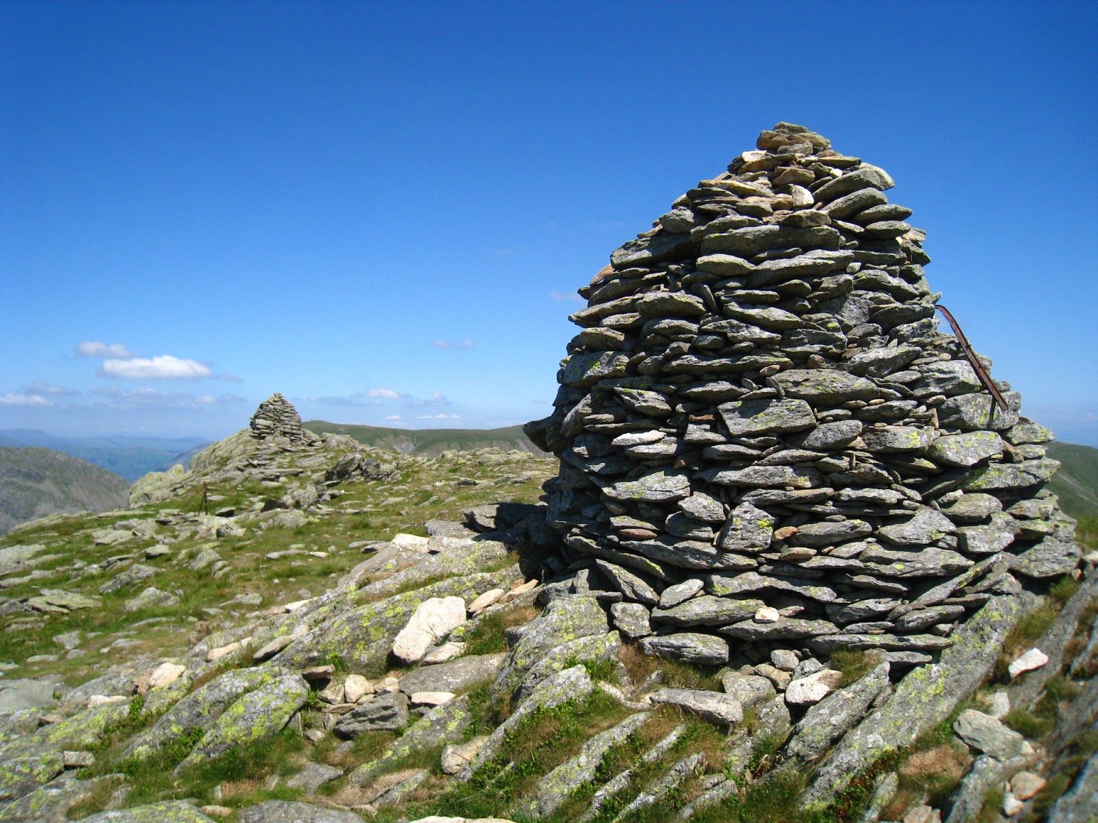 Thornthwaite Crag, we got our first real sight of one of the features I was looking forward to seeing, Thornthwaite Beacon. A 14ft columnar cairn that makes you wonder how they built it in the first place. A perfect spot to stop for lunch and air some hot feet.
