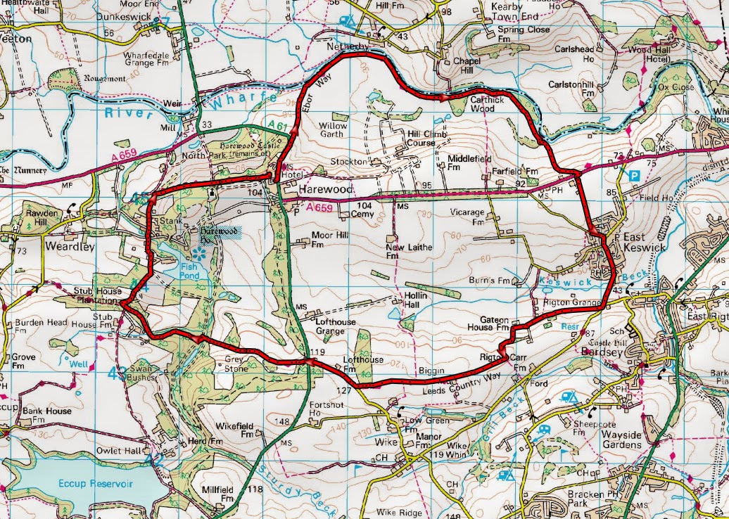 Route: Harewood, Fitts Lane, Ebor Way, Carthick Wood, Ebor Way, East Keswick, Gateon House Lane, Leeds Country Way, Lofthouse Farm, Harewood Estate, Stank, North Park
