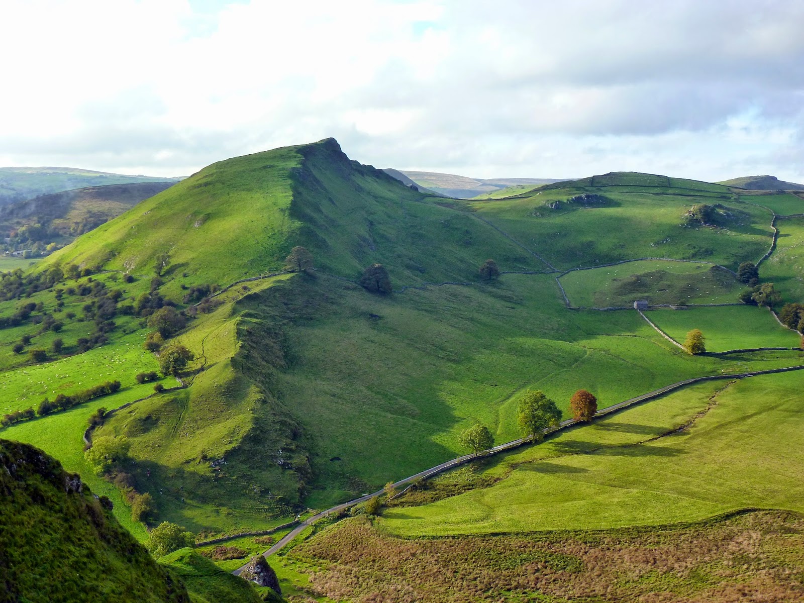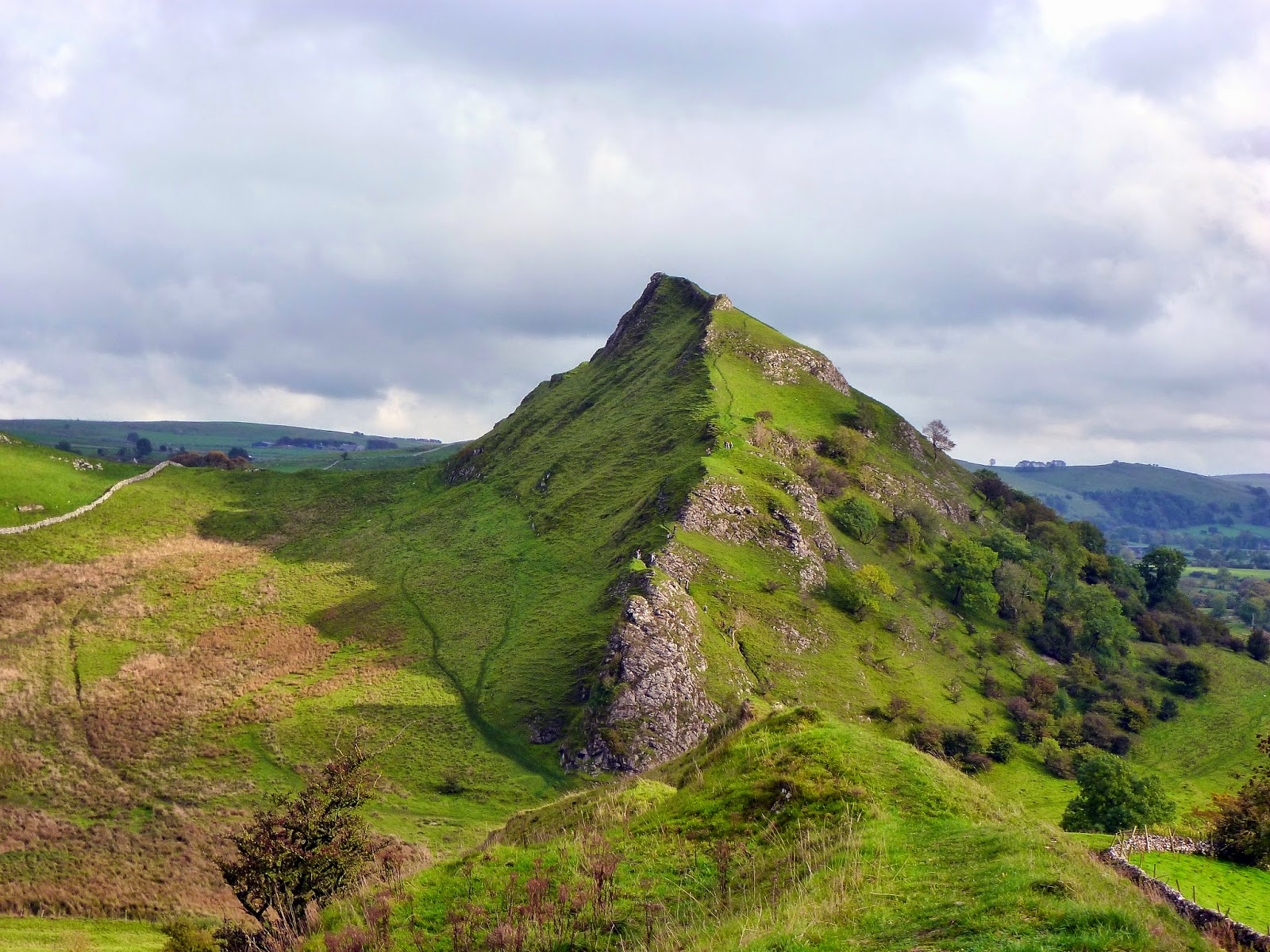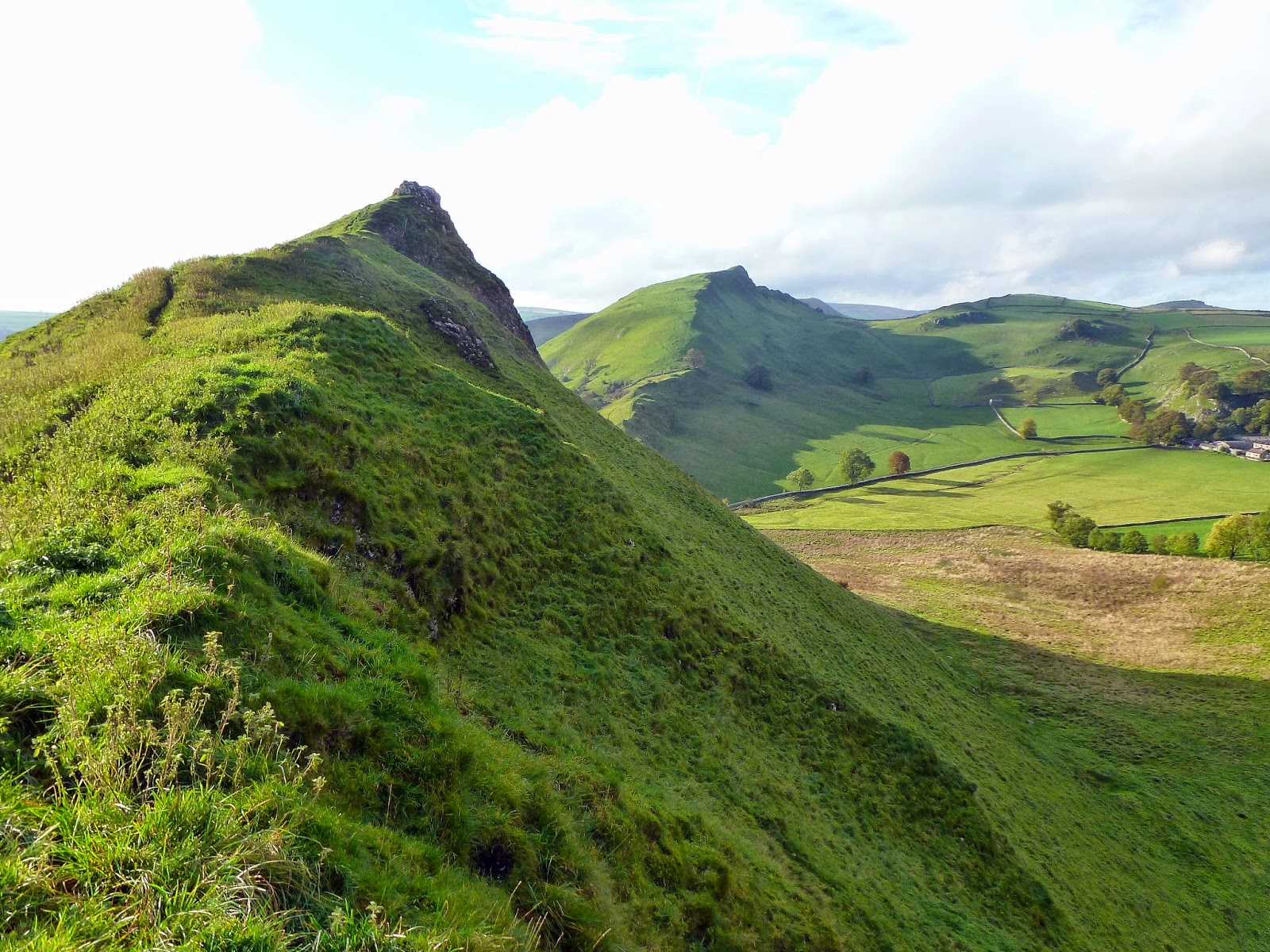 The summit of Chrome Hill has a great sweeping view of valleys of both the River Manifold and the River Dove. The highlight though is the sharp profile of its distinctive neighbour, Parkhouse Hill. Like its larger brother, Parkhouse Hill follows the same lines as Chrome Hill albeit on a smaller, more compact scale. The sharp limestone ridge is even more evident as you descend Chrome Hill.