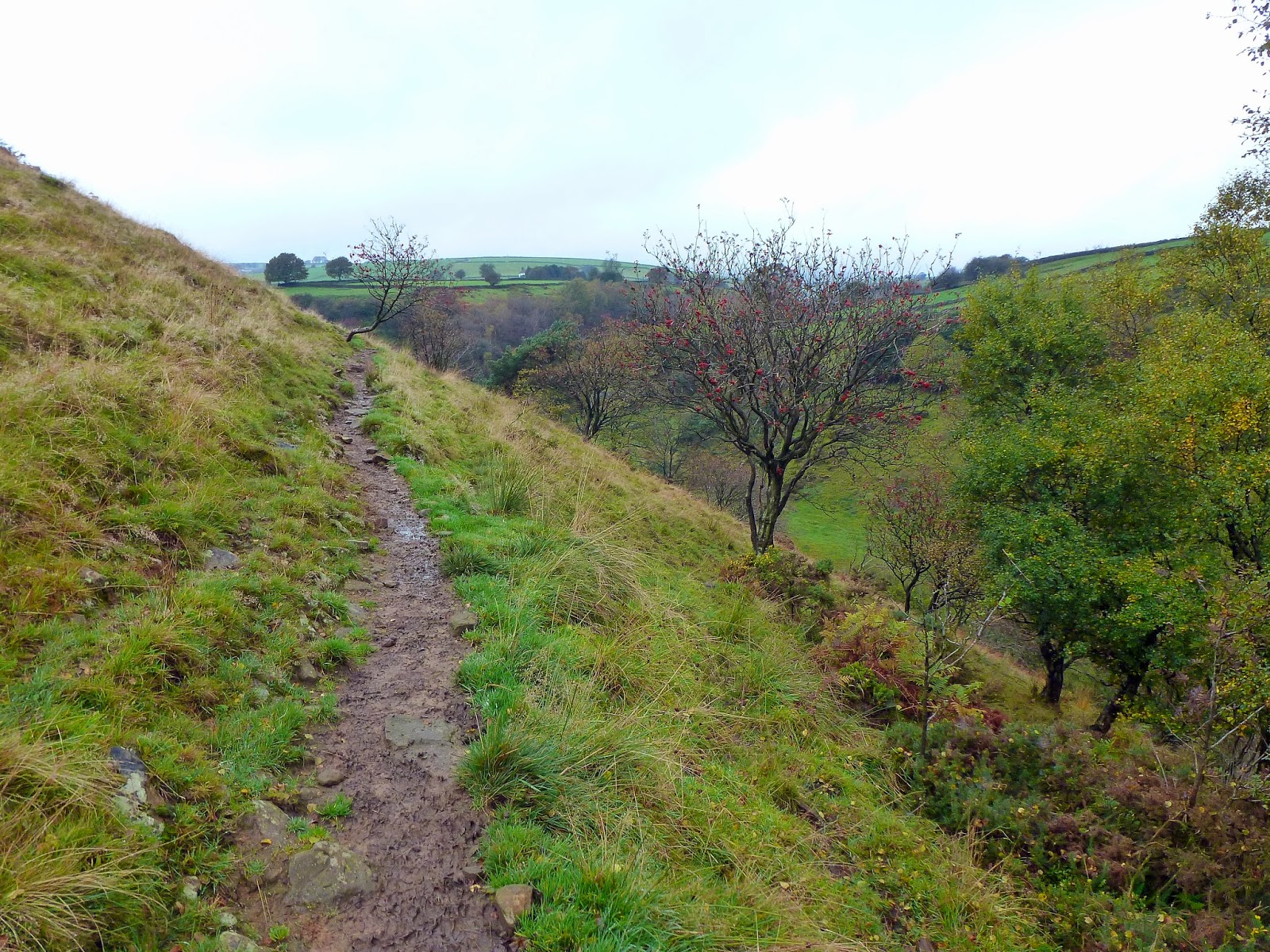 With spirits raised once again, we ploughed on, this time taking a path along the steep valley side and then heading north up to Brand End. Again, the path was difficult to follow in the first instance due to the growth of ferns on the valley side but, once out, its easy enough to follow to the farm at Brand End. A word of note here though, according to our maps, the path heads through the yard of the farm to the south of the buildings yet, recent changes to the property have made this inaccessible now. Instead, the path continues to the west of the buildings and then follows the fence around the north side back to the track where we should have been.