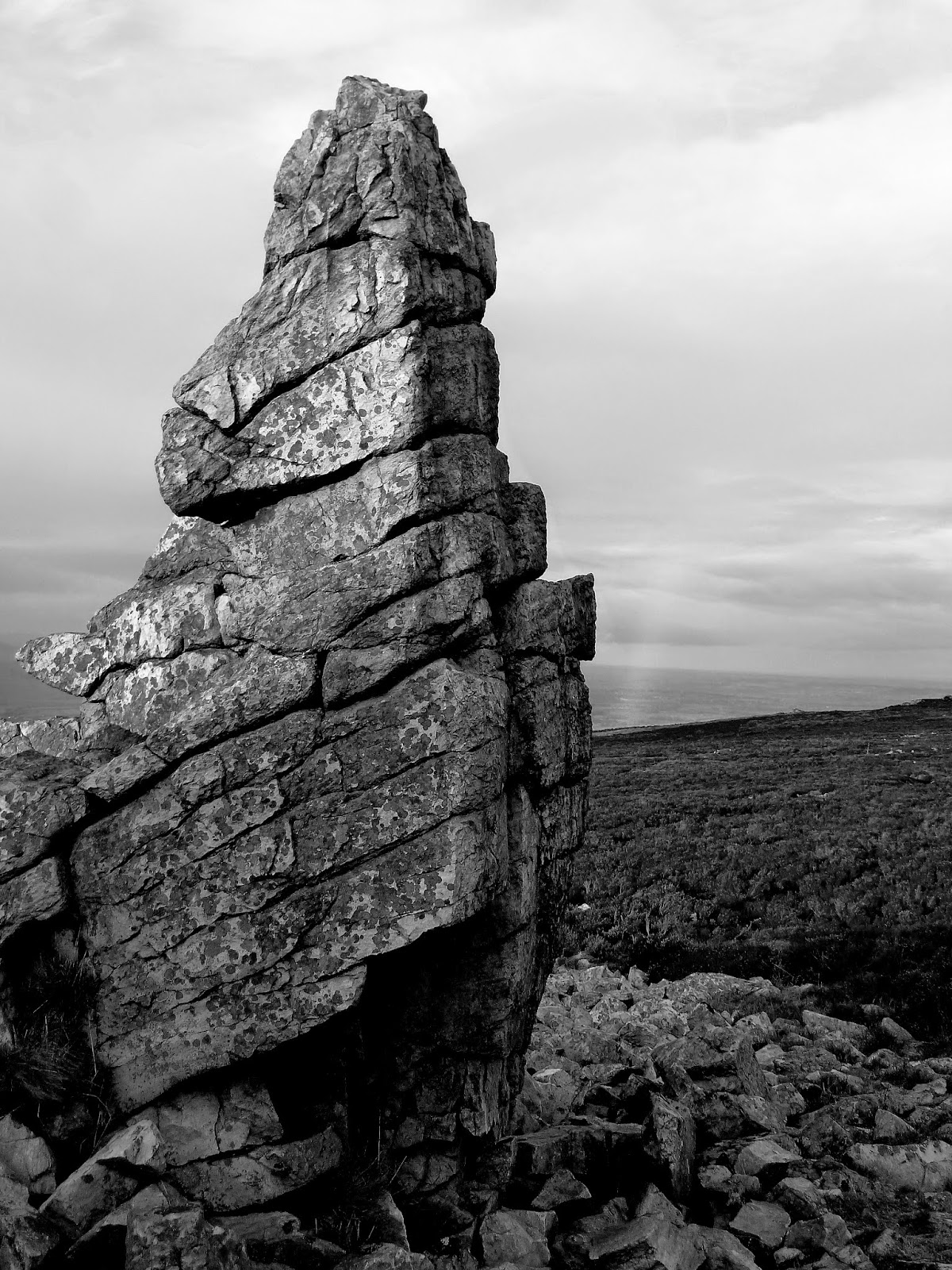 After a quick bite to eat, a cheeky half pint and a reorganising of the boot laces, we were on our way again to make the arduous climb out of the valley towards the Stiperstones. The only marked way between us and the Stiperstones ridge was to follow the Shropshire Way as it climbed along the access road to Stiperstones car park, a fairly uninteresting two mile uphill slog, though it would definitely be worth the effort. The rocky tors of the Stiperstones were growing larger and larger, cast a foreboding grey by the afternoon cloud.