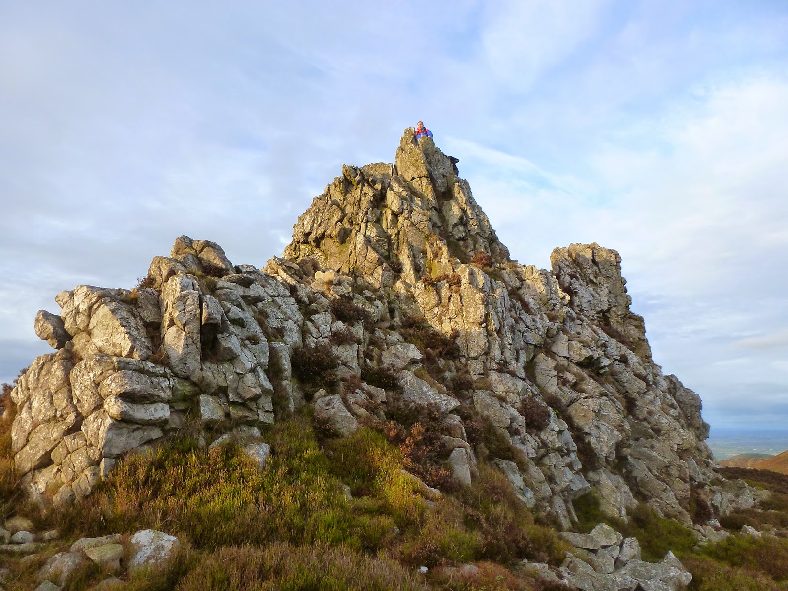 Greeting you like a geological adventure playground, the distinctive rocky tors of the Stiperstones ridge form a stark contrast to the smooth, rounded hills of the Long Mynd. The quartzite rock is nationally significant, the result of the rocks poking out of the last great ice sheet and being shattered by a constant freezing and thawing cycle. There are a number of named outcrops, the most significant being Cranberry Rock, Manstone Rock (the highest), Devil’s Chair (the largest) and Shepherd’s Rock. As we reached the foot of Cranberry Rock, that familiar feeling of wanting to climb was unable to resist and we scrambled to the top. As we crossed the ridge, heading to the north east, this urge to clamber around on the rocks was repeated on each tor until we seemed to resemble an army of ants, swarming across the rocks. An OS pillar marks the top of Manstone Rock and the highest point of the Stiperstones at 536m.