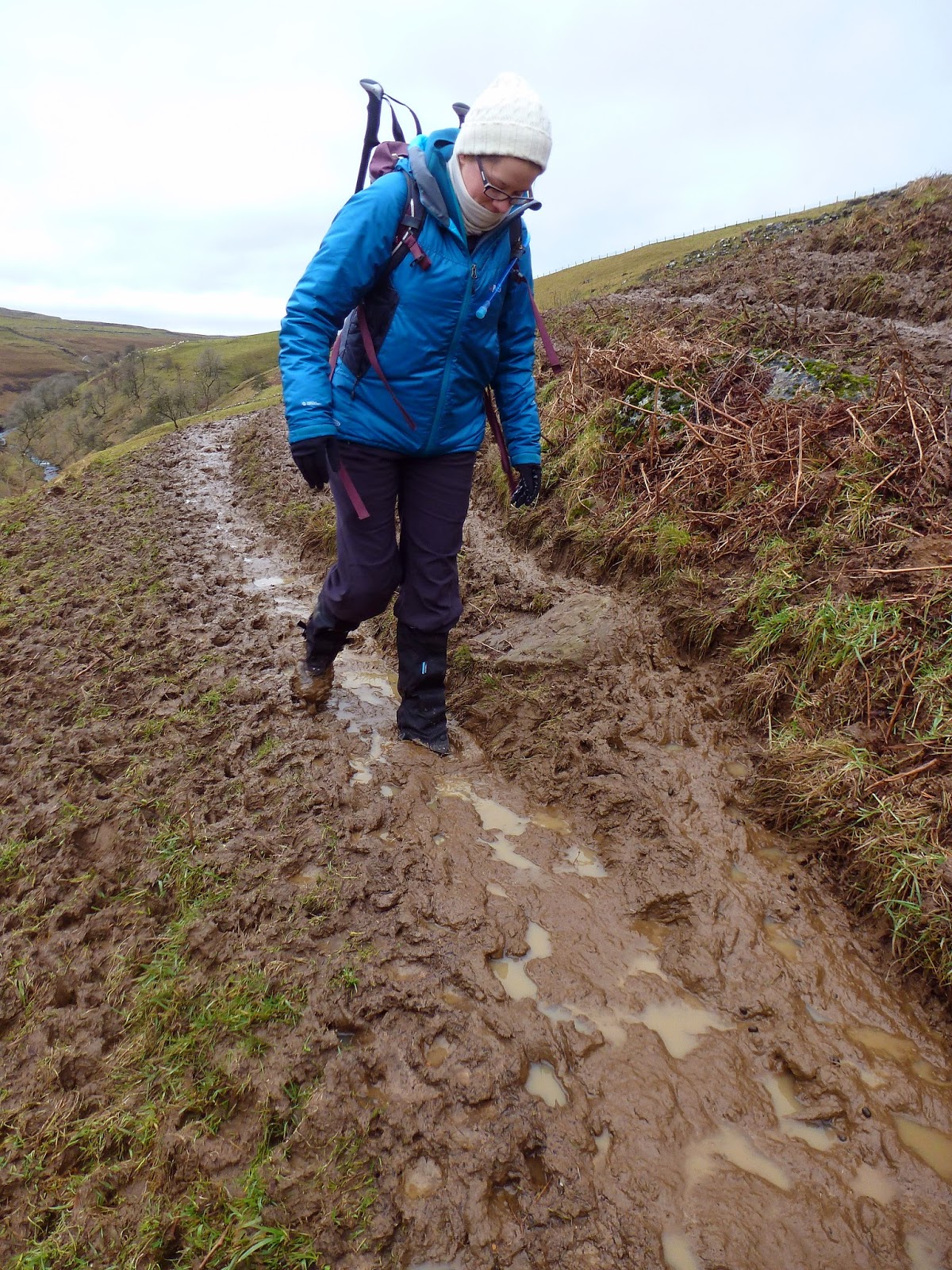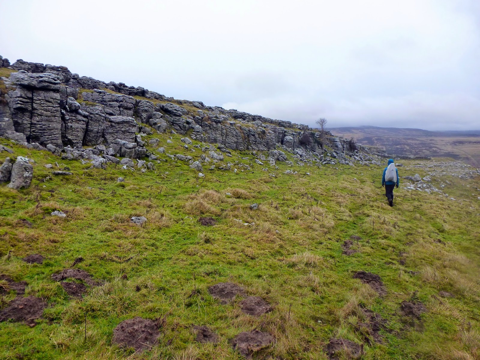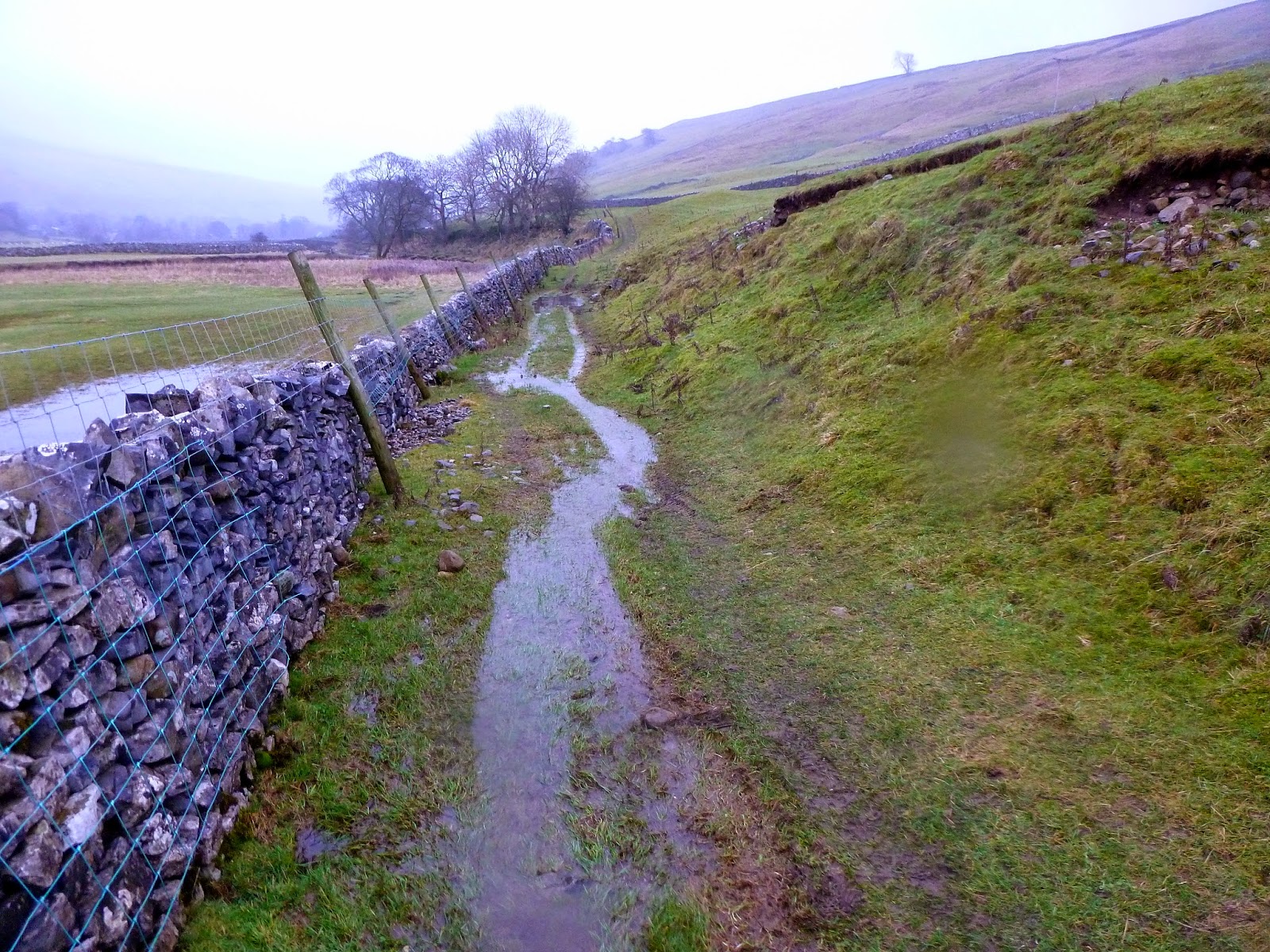 We paused for a quick food break that allowed me a quick exploration of the limestone terraces before we continued on, following the increasingly muddy path as it travels just under the lip of the valley. For those who are feeling a bit adventurous, a trip down the slope to the gill reveals a stunning, if not slightly stunted, limestone ravine with the large stream flowing unopposed along its floor. This does, however, require a steep climb back up to reach the path, but it was definitely worth it. After a challenging two-mile stretch of path, which threatened to pitch either one of us down the hillside at any moment, we reached Silverdale Road, a single track road that links Littondale to Settle some 10 miles away. It was time, as foretold by the weather predicting men and women at the Met Office, to dig out the waterproofs as a spell of prolonged rain began to set in.