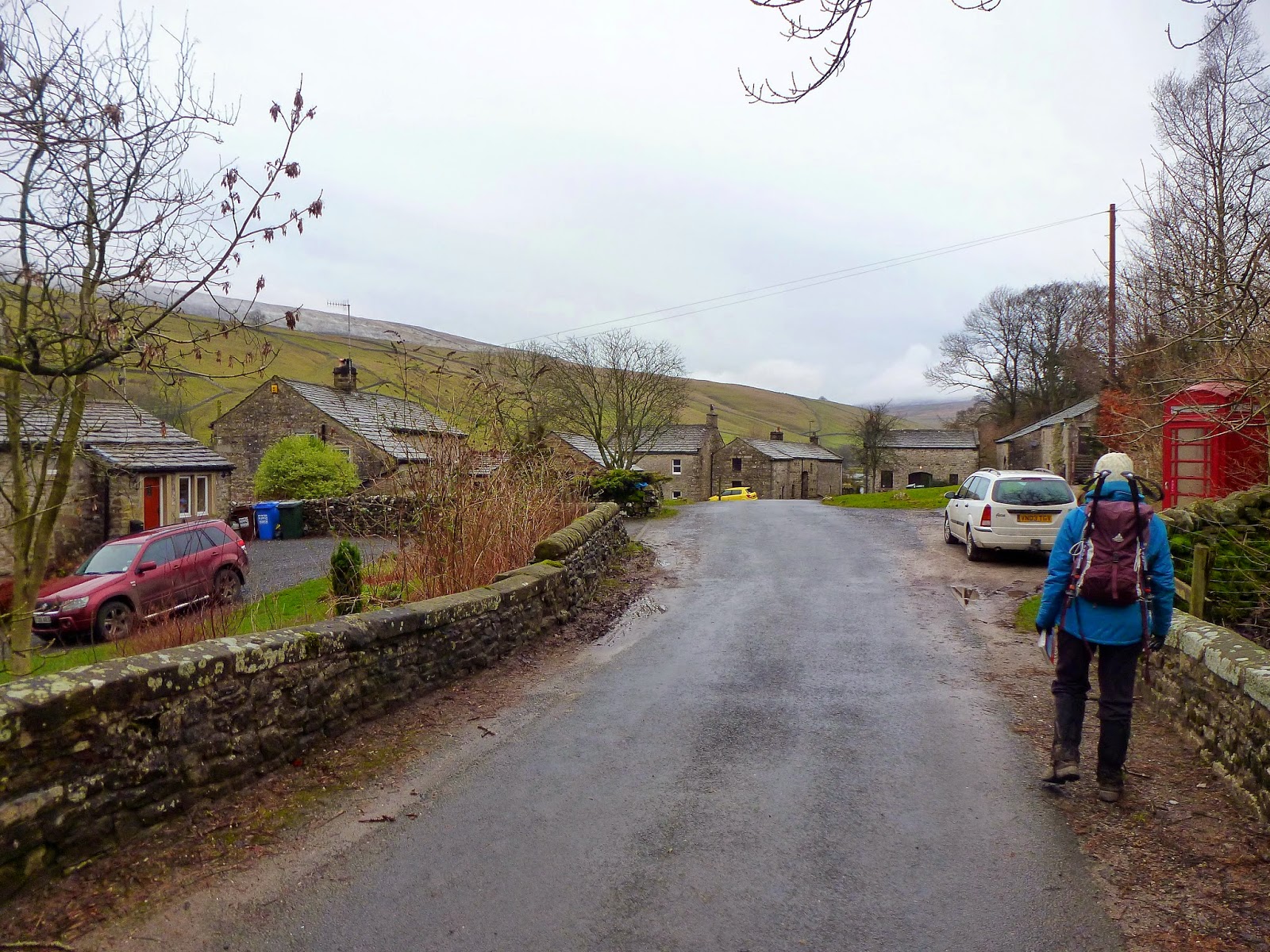 | The hamlet of Litton. The phone box marks the point where the path can be found to the left of the road |