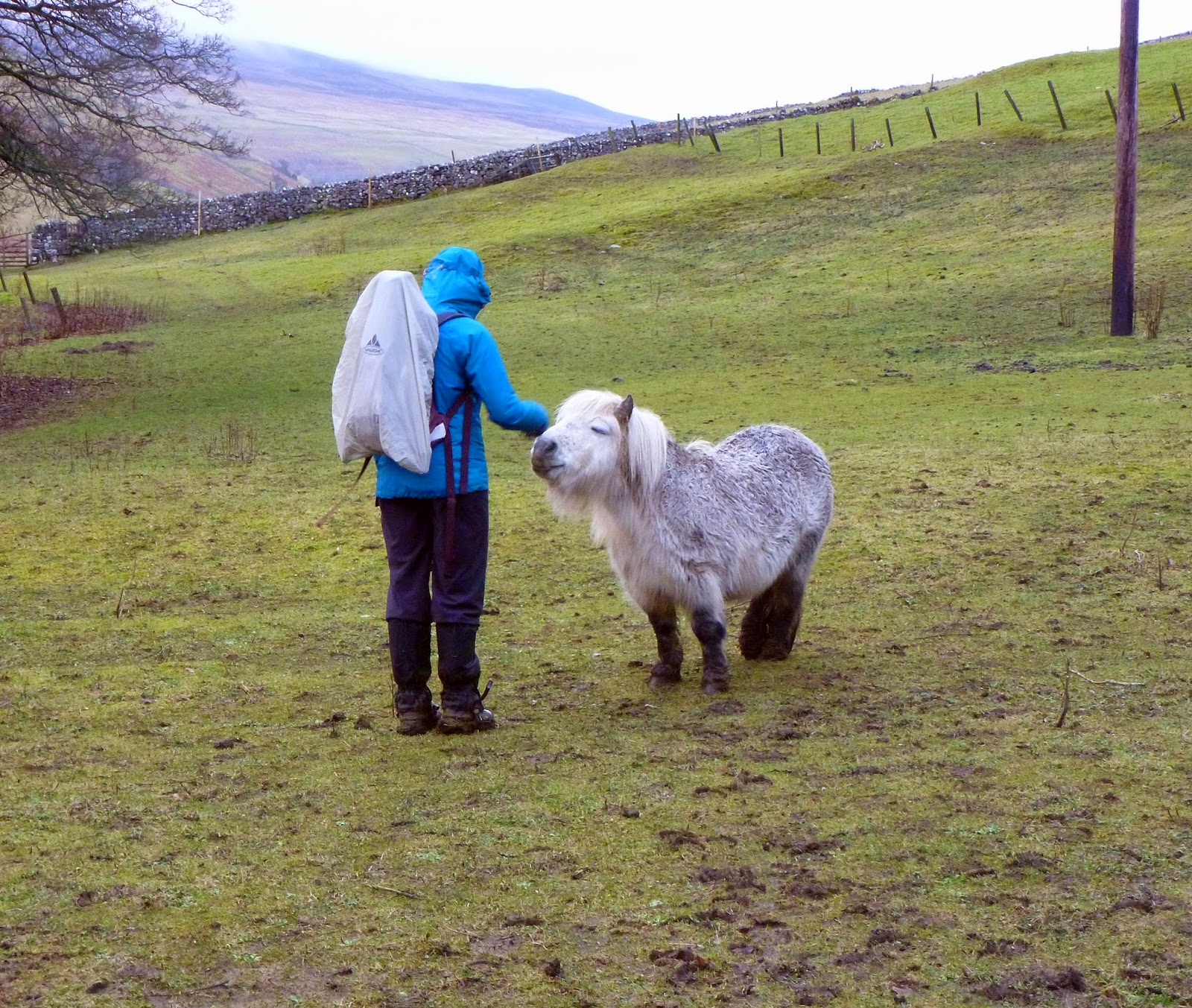 As we dropped down into the valley towards Nether Hesleden, we passed an impressive limestone scar, unnamed on the maps. We had kept the option of increasing the length of the walk by heading towards Foxup but with the rain falling and the car calling, we decided to press on down to the valley floor in an attempt to get home before we got too wet. As we reached the farm at Nether Hesleden, we found something I hadn’t seen for a long time. Something that Sara enjoyed very much. A tiny little horse.