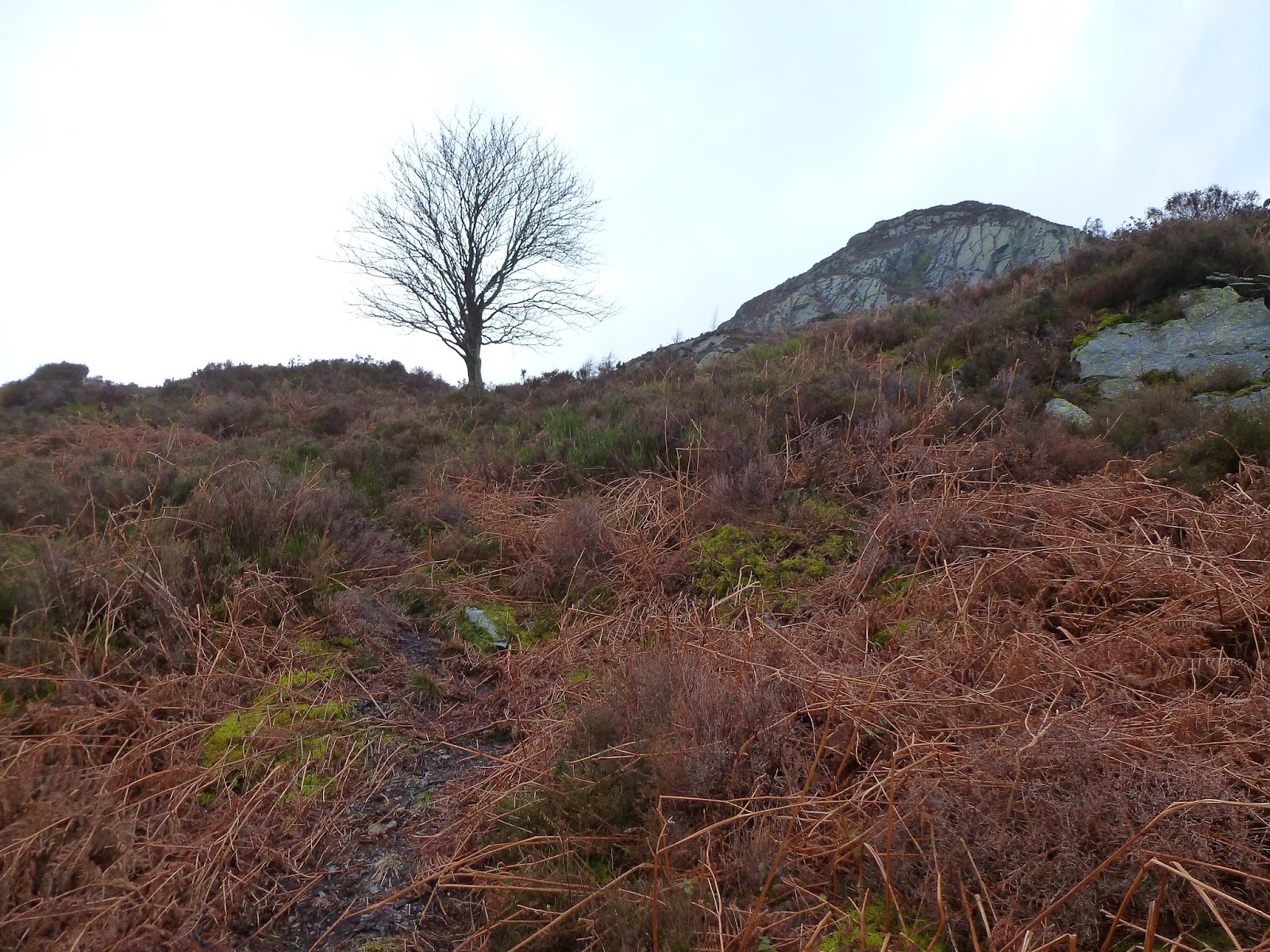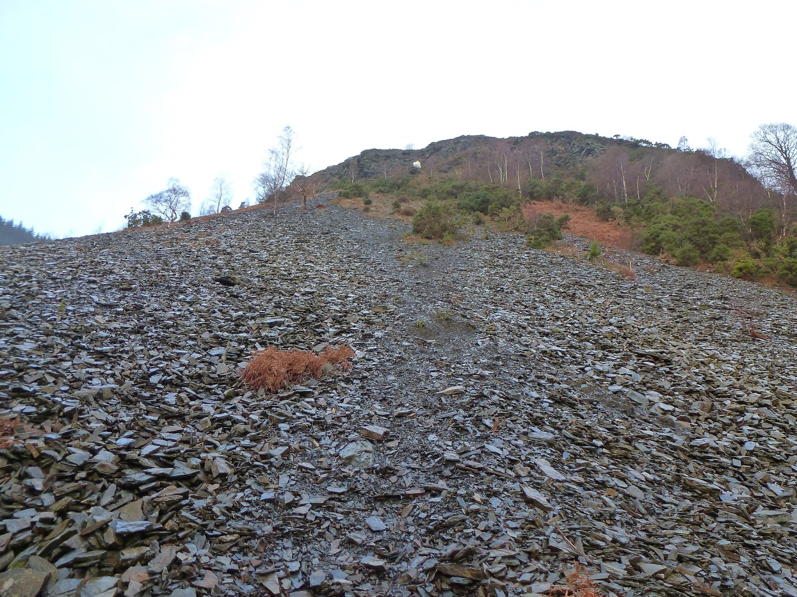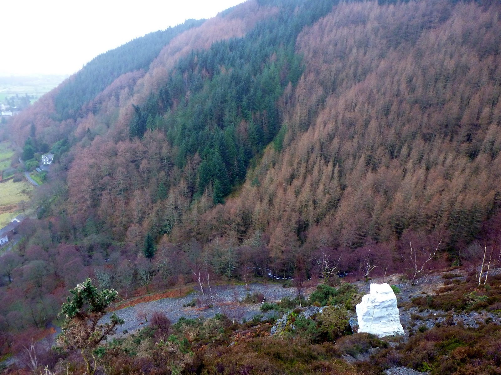 After pausing for a much needed breather at the Bishop, we ploughed steadily on, climbing up towards the seemingly insurmountable Slape Crag. As the weather men and women had suggested, the wind was starting to pick up, though we were reasonably sheltered from it by the mass of Whinlatter. It had also started to sleet making everything that bit more slippery and perhaps perilous, especially the short, exposed scramble that’s required to breach Slape Crag.