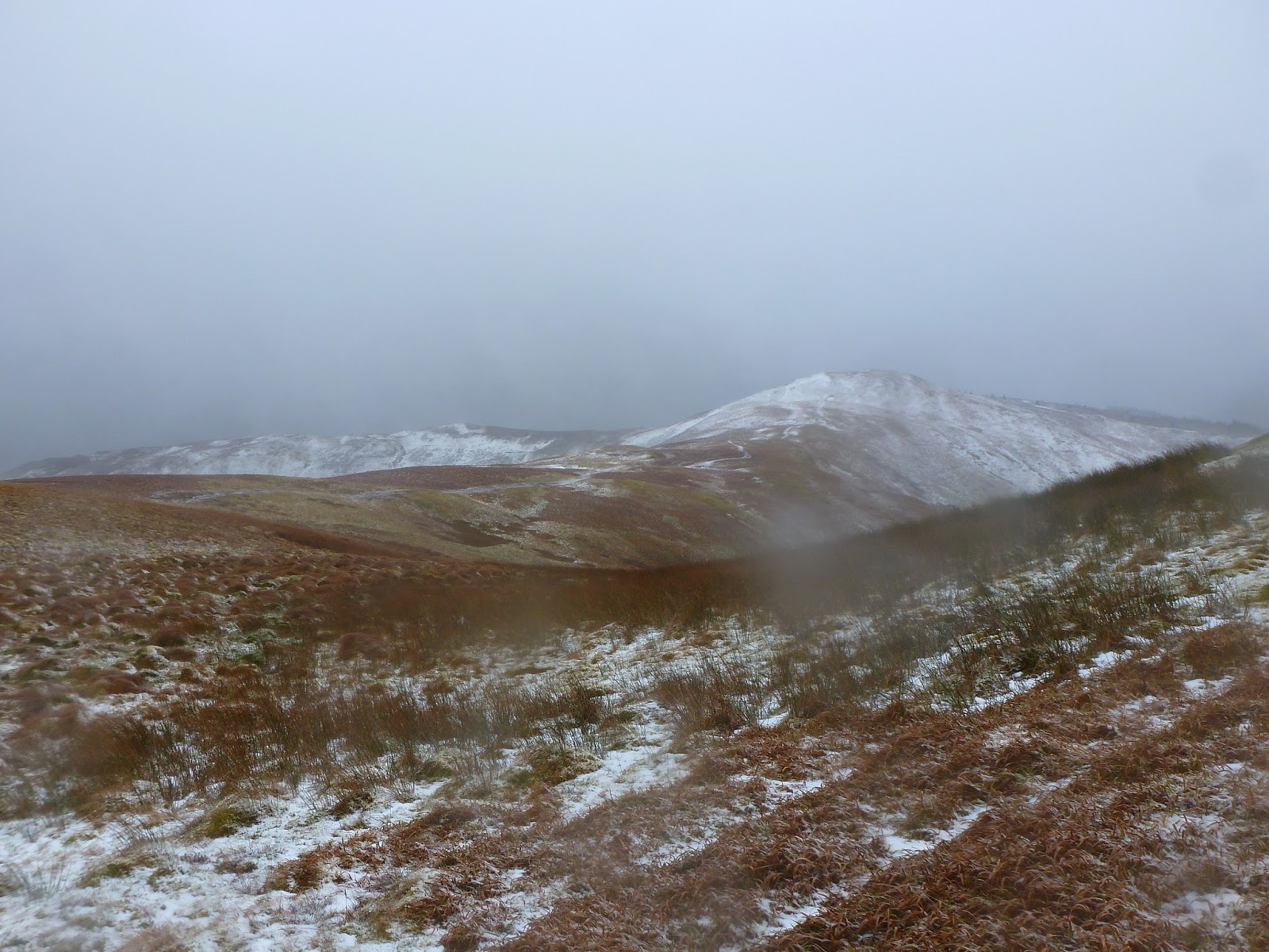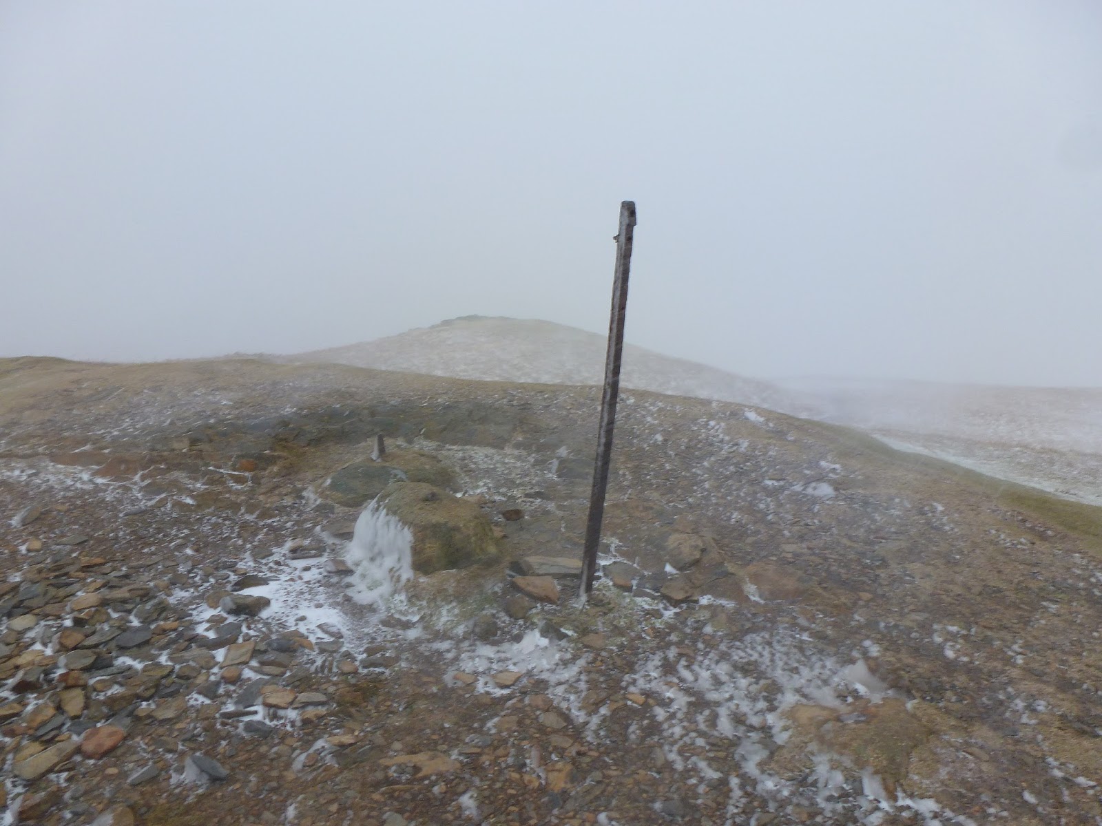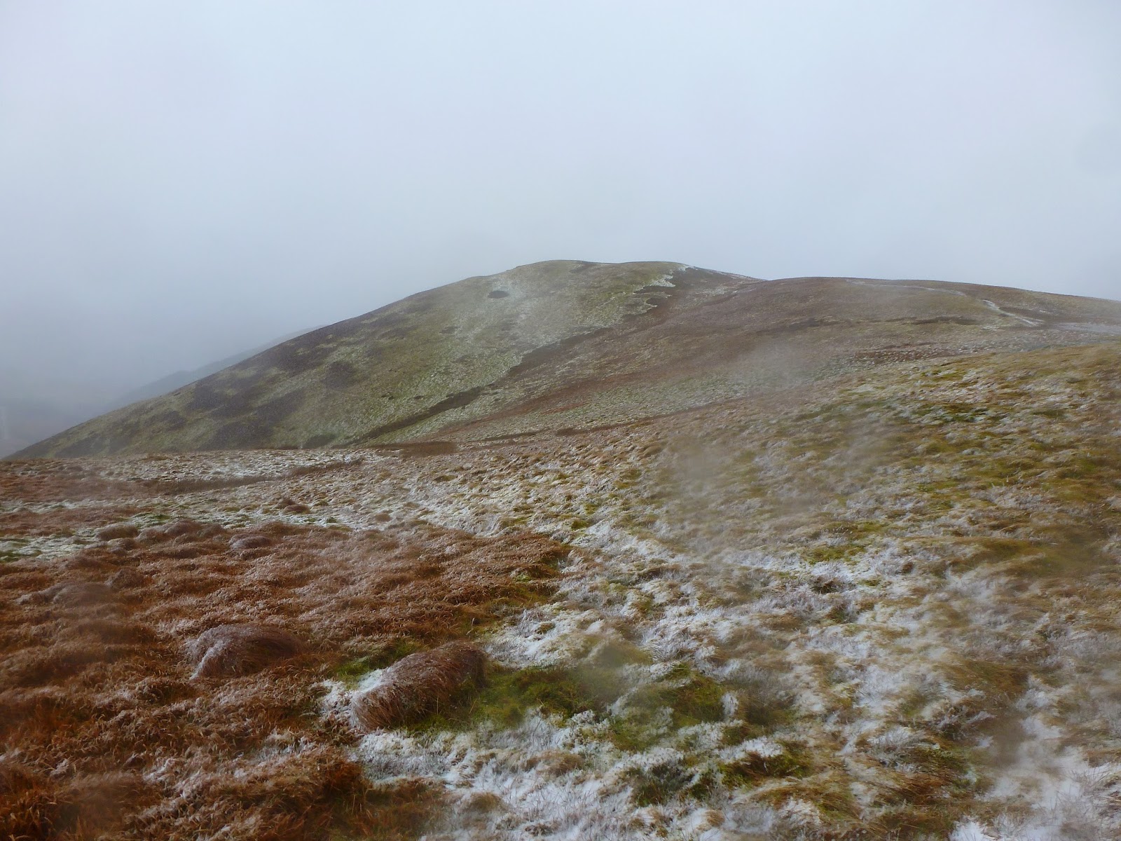Lord’s Seat stands just 1 short kilometre from Barf, across an undulating ridge though strictly speaking, Barf is an outlier to Lord’s Seat. Approaching the summit, the wind was noticeably strengthening and walking was, as predicted by the MWIS, becoming extremely difficult. So much so that I decided to put my crampons on to get more purchase on the increasingly icy approaches.