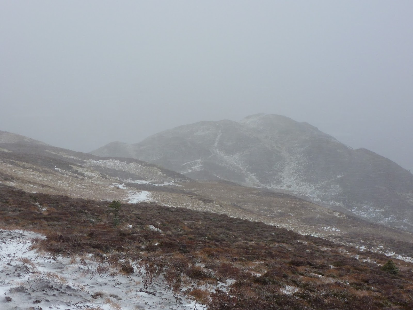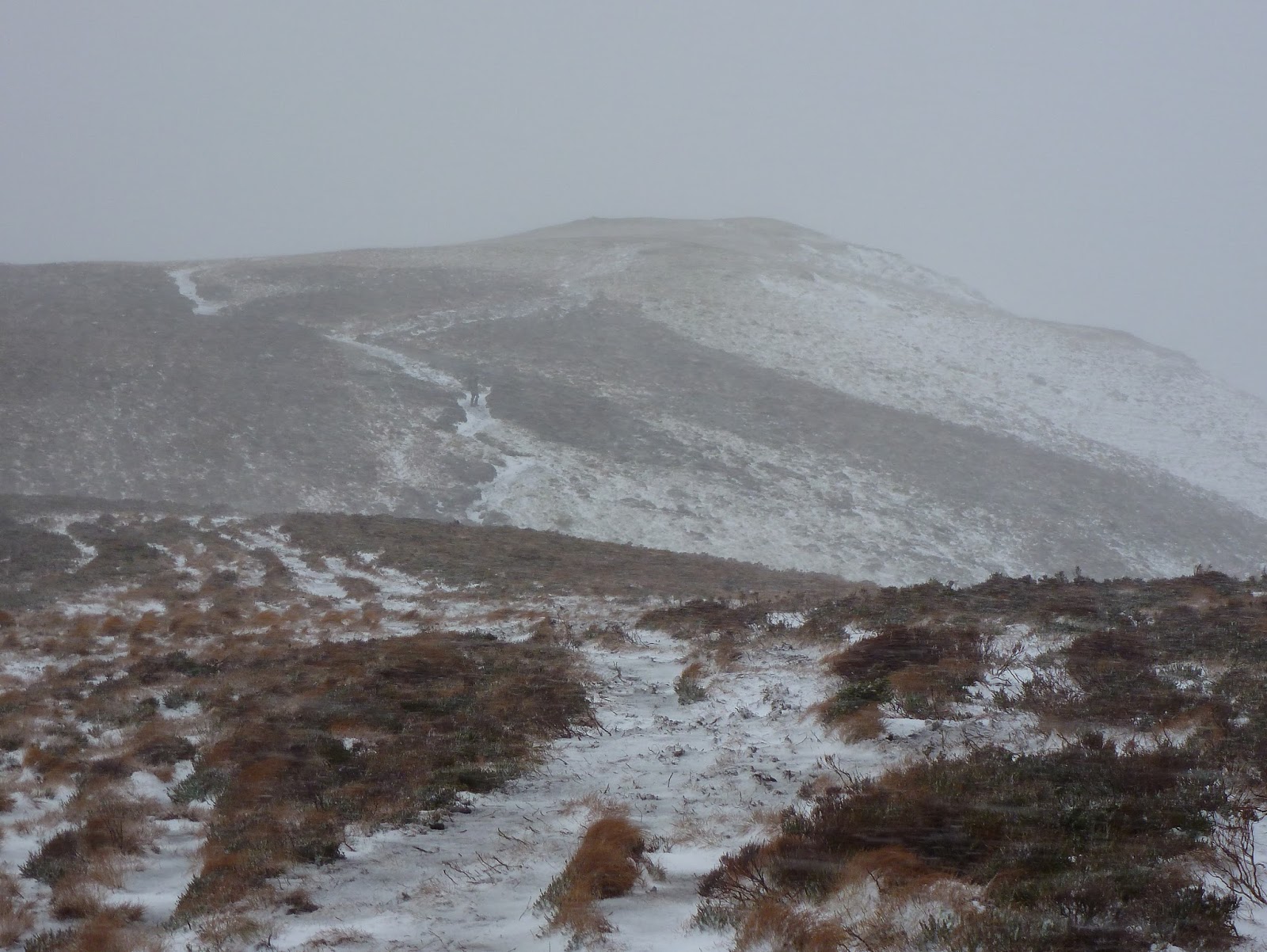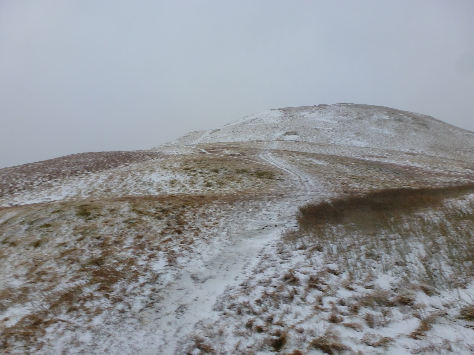 Lord’s Seat stands just 1 short kilometre from Barf, across an undulating ridge though strictly speaking, Barf is an outlier to Lord’s Seat. Approaching the summit, the wind was noticeably strengthening and walking was, as predicted by the MWIS, becoming extremely difficult. So much so that I decided to put my crampons on to get more purchase on the increasingly icy approaches.