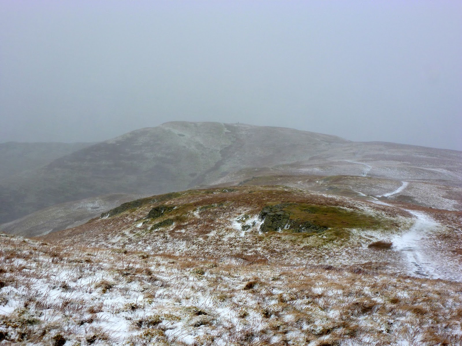 Lord’s Seat lies at the very heart of the fells that its name is associated with. A number of ridges branch off in all directions; some crossing other, known fells and some ending at small, subsidiary features like Aiken and Ullister Hill. We didn’t have much time on the summit, the wind making just standing still a severe chore so, after a quick picture, we dropped down to a slightly more sheltered location to consider our options.