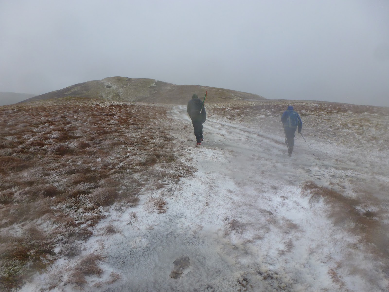 We decided we’d try for Broom Fell, the penultimate fell on the ridge and see how we’d get on en-route. Visibility was still reasonably good (as in, we could see our objective) but the wind and sleet made for a very slow, tiring slog along the ridge top head first into the wind. We were pretty knackered by the time we reached Broom Fell and barely (an I really mean barely) made it to the summit, such was the strength of the wind. We decided enough was enough. The wind had had the better of us.