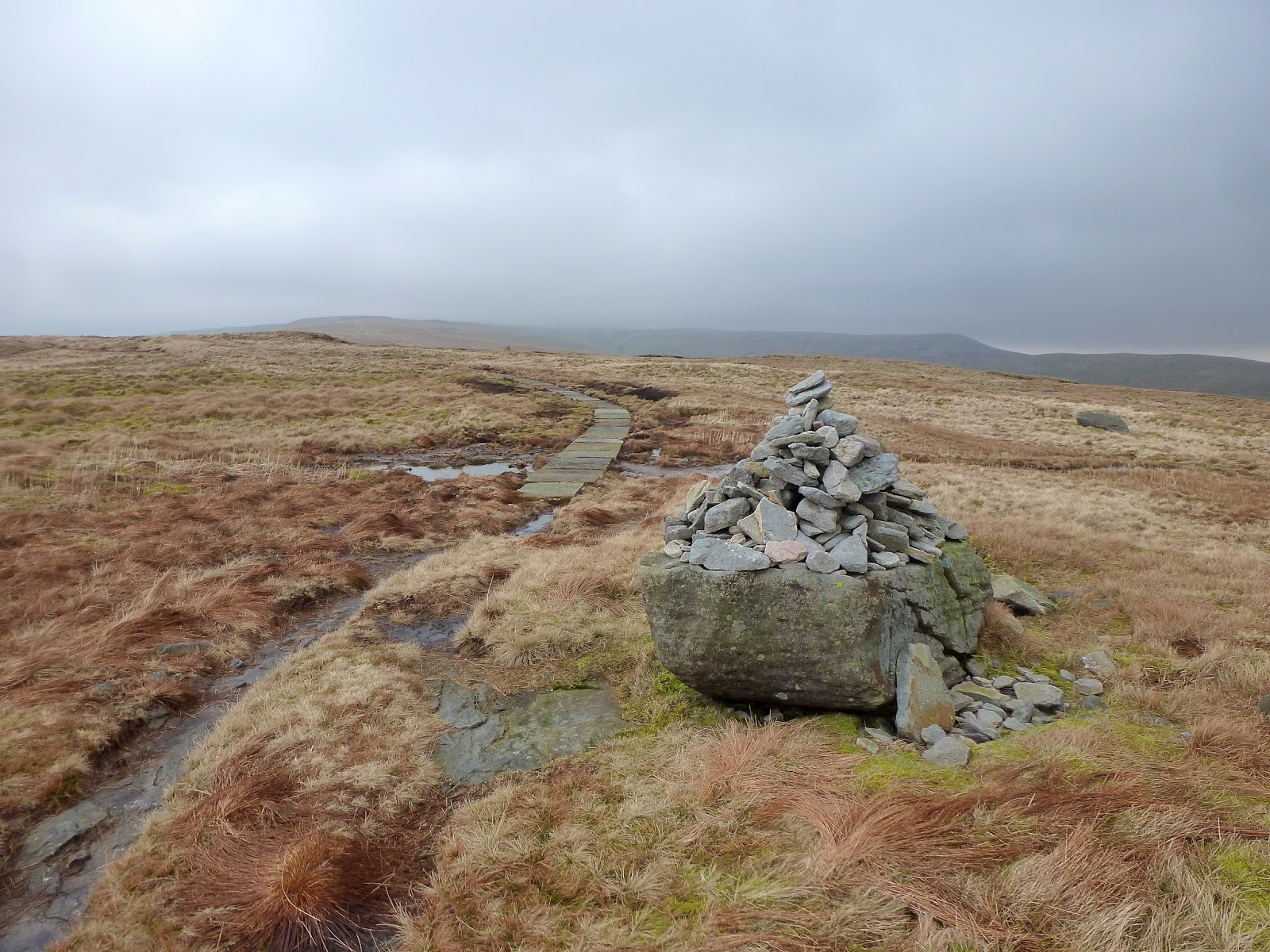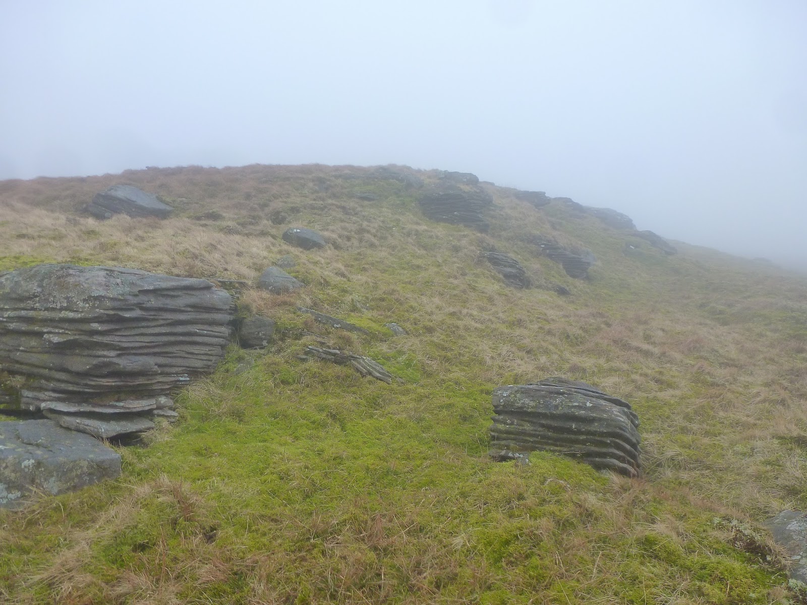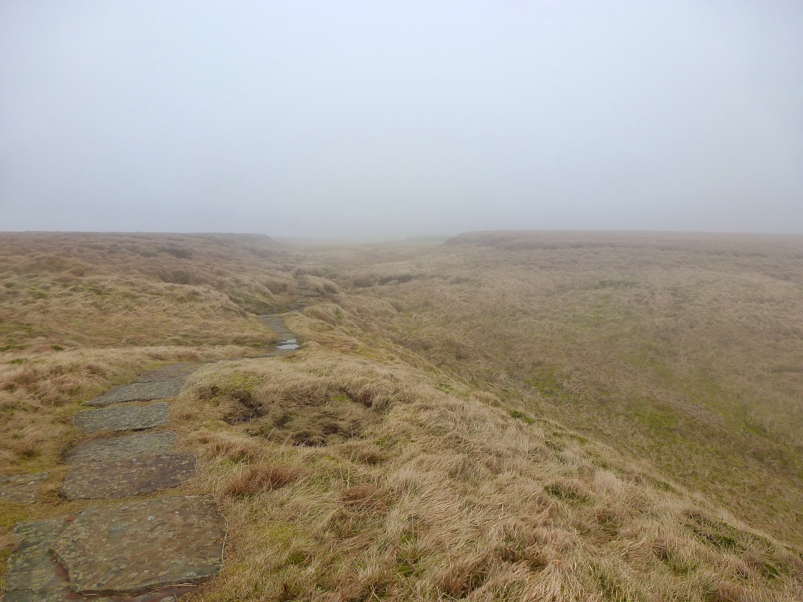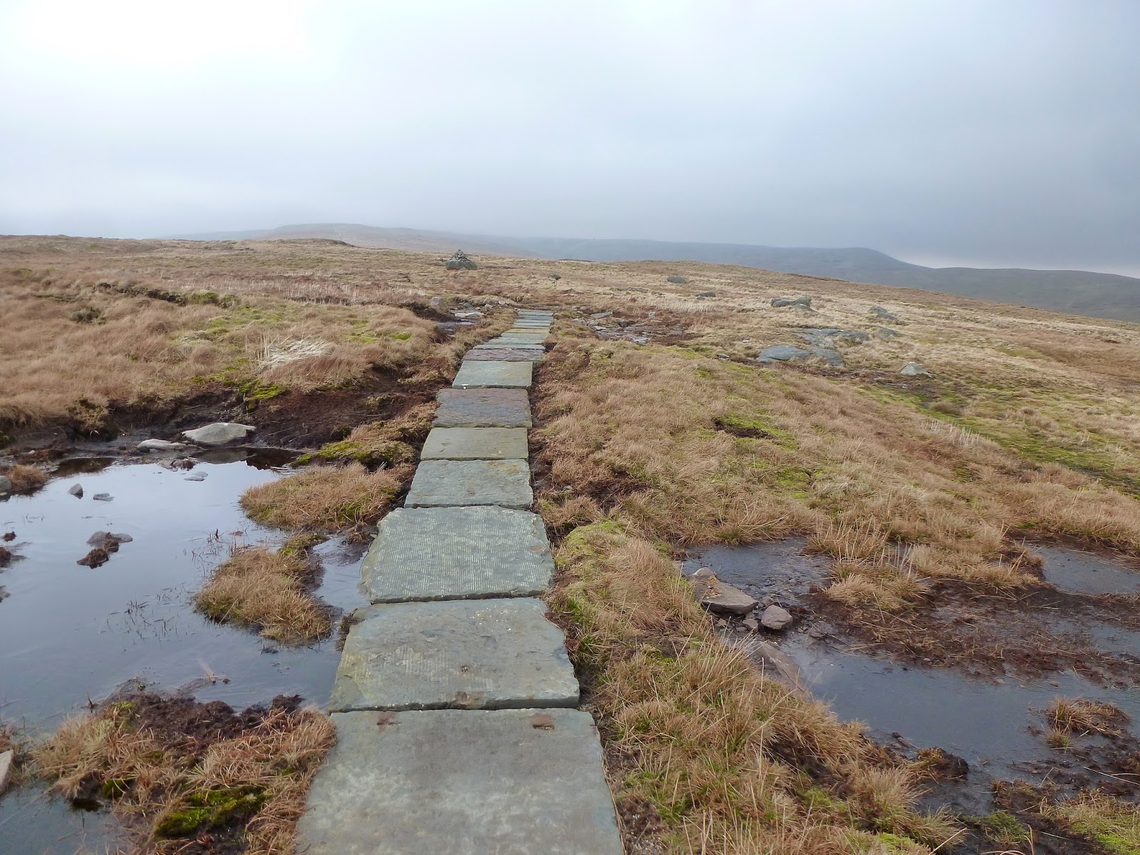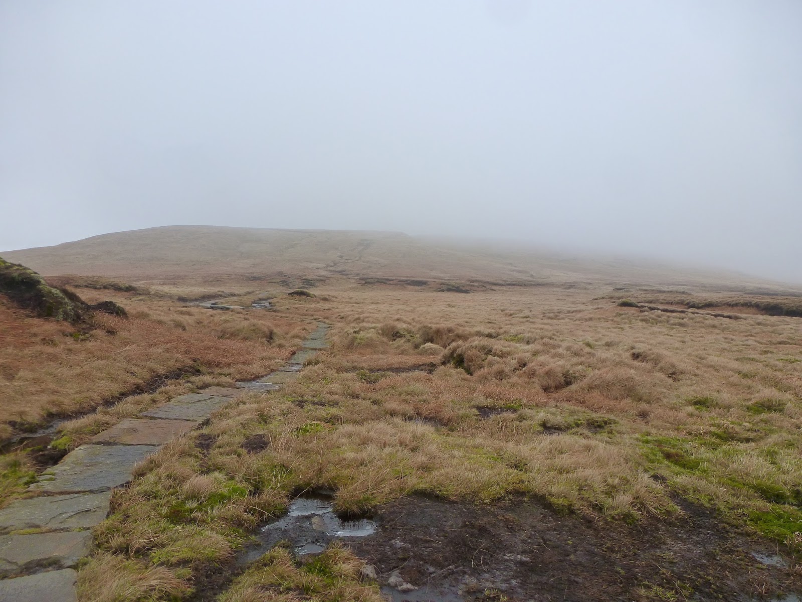 Climbing still, I was rapidly starting to approach a lingering murk shrouding the summit that had been visible from the very beginning of the walk. In addition, the wind had started to bite and the odd frozen puddle was a reminder that winter hasn’t quite relinquished its grip just yet. In fact, an icy surface on intermittent flagstones did make for some interesting high-level dancing on ice type movements. Still, it was pleasant it not being too windy and ultimately it was dry which has been a rarity so far in 2014.