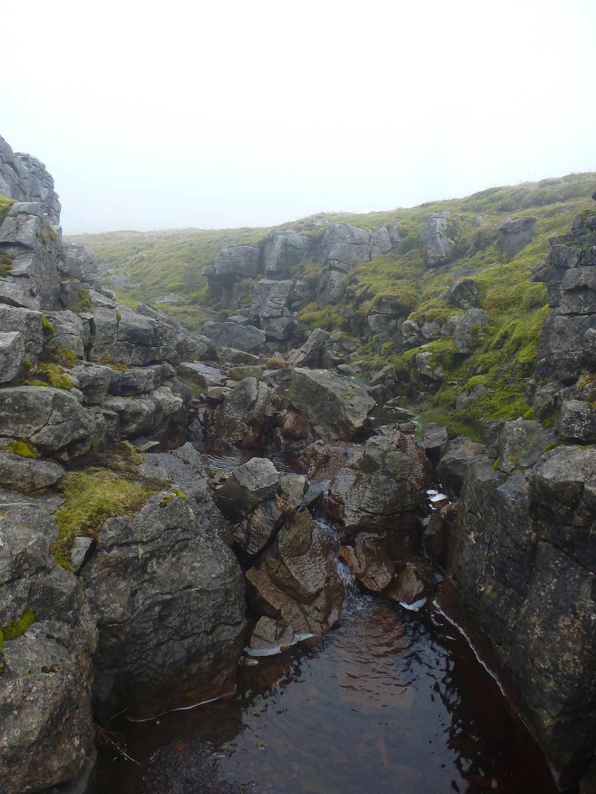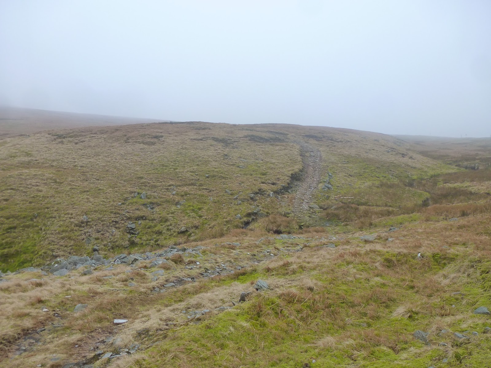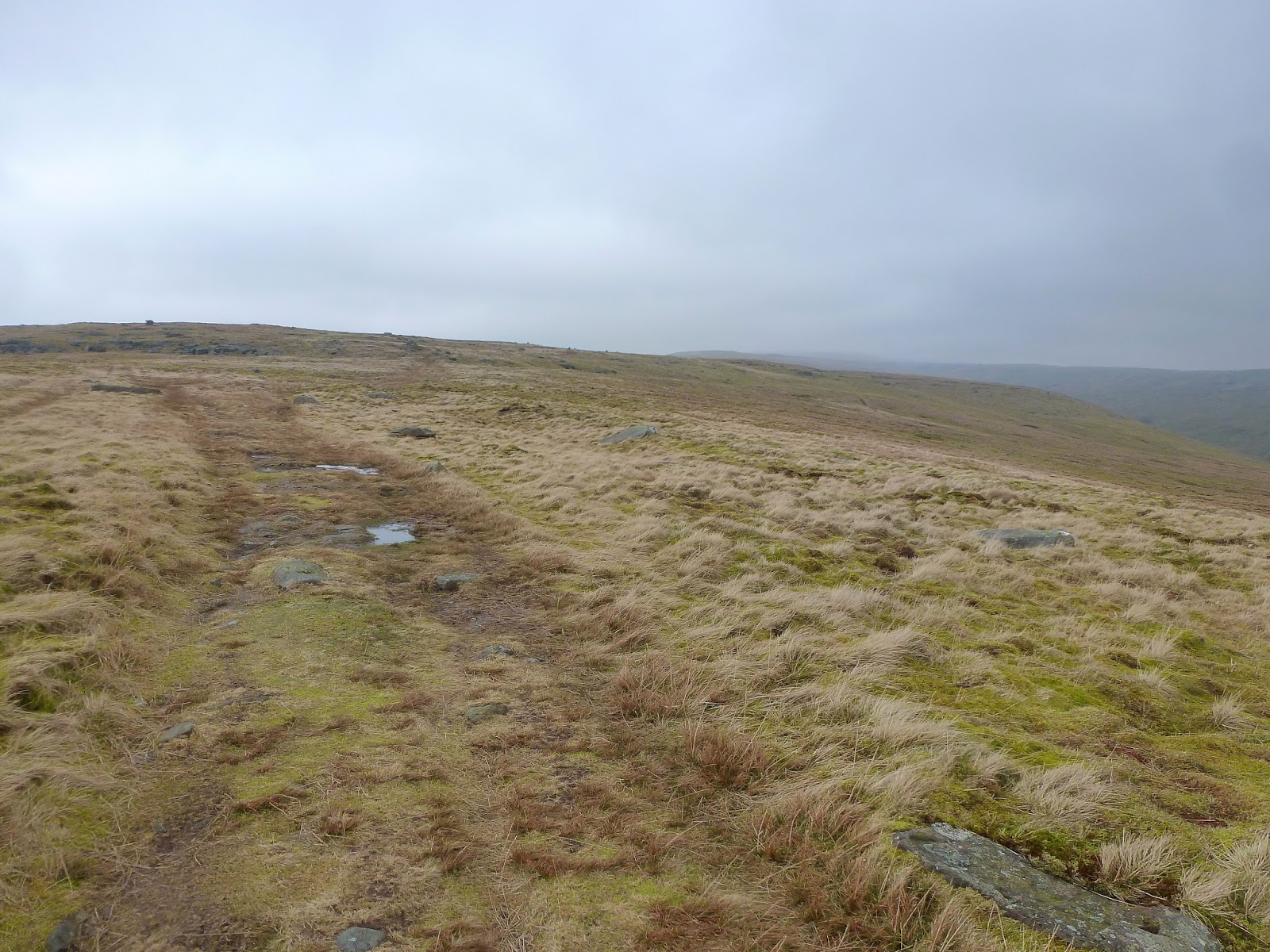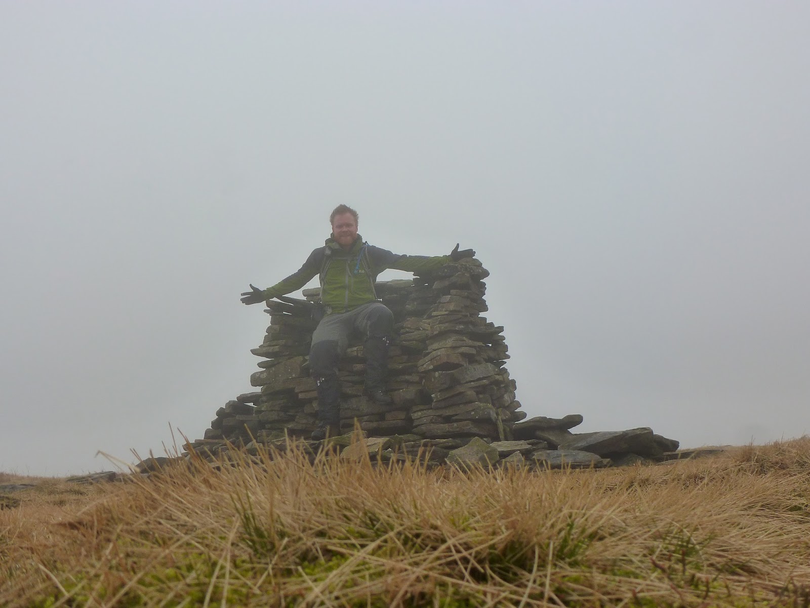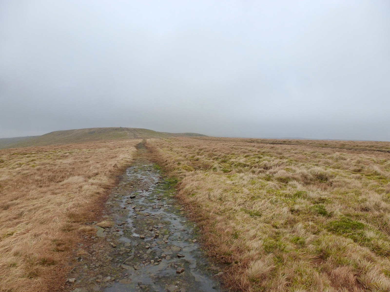 Climbing still, I was rapidly starting to approach a lingering murk shrouding the summit that had been visible from the very beginning of the walk. In addition, the wind had started to bite and the odd frozen puddle was a reminder that winter hasn’t quite relinquished its grip just yet. In fact, an icy surface on intermittent flagstones did make for some interesting high-level dancing on ice type movements. Still, it was pleasant it not being too windy and ultimately it was dry which has been a rarity so far in 2014.