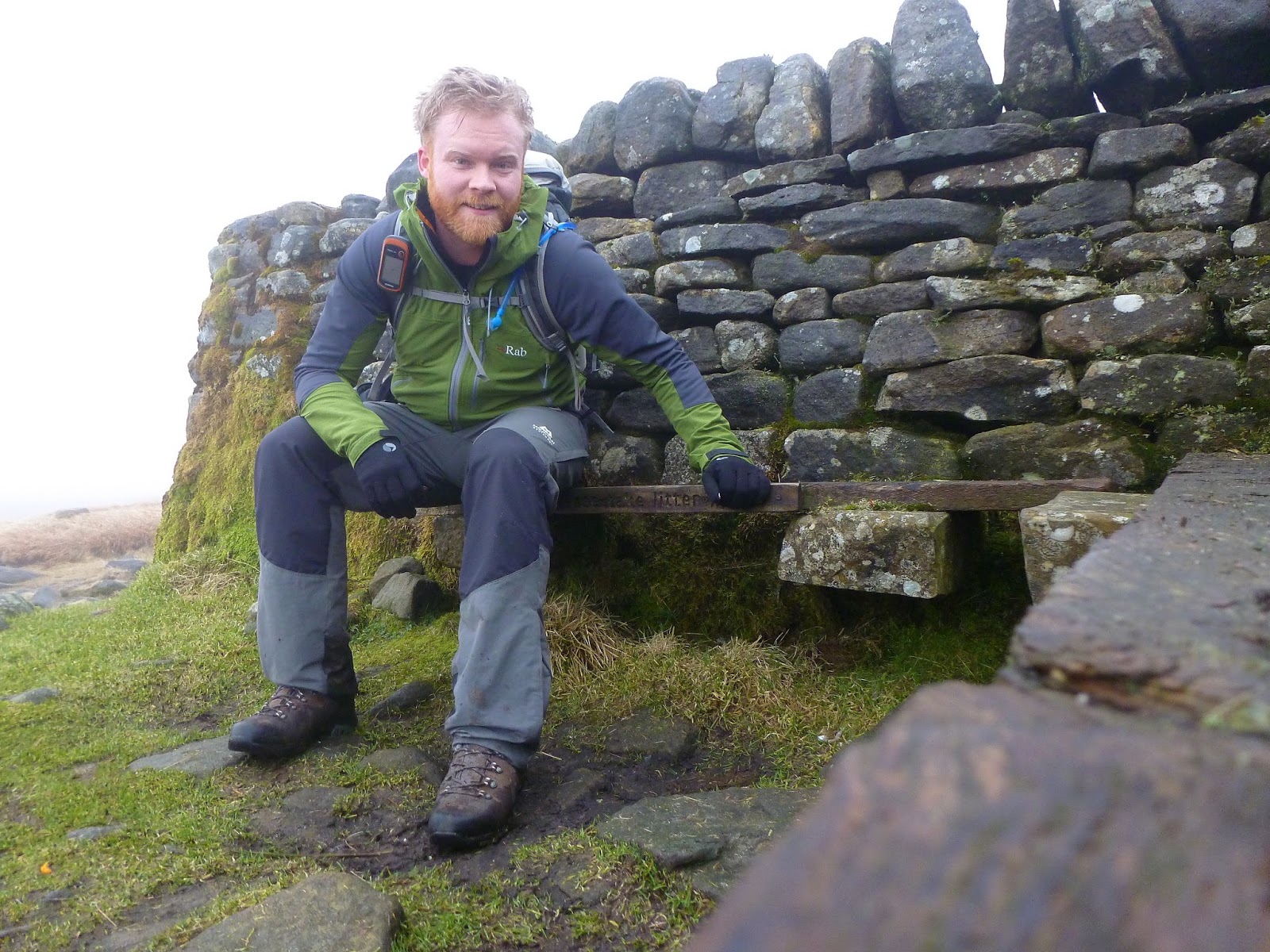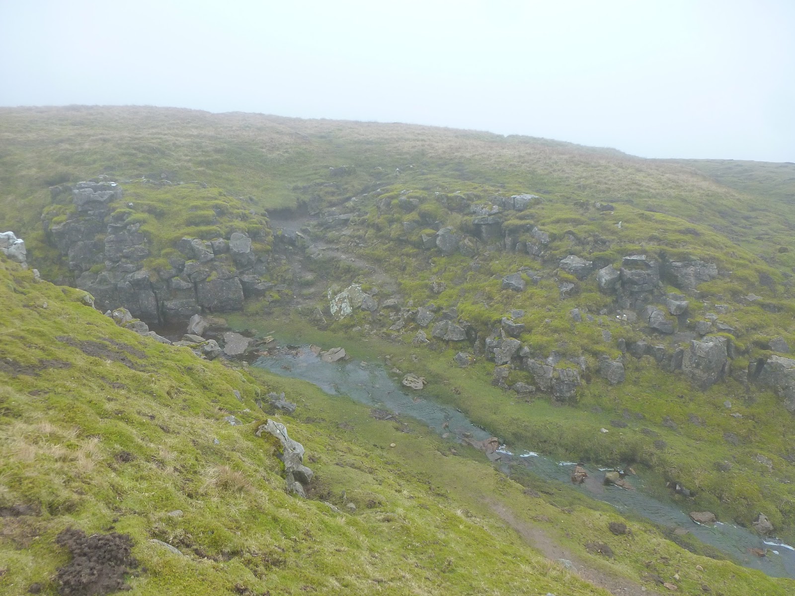Using a couple of bearings and following the compass on the GPS, I slowly made my way through the mist down the slopes of Abbotside Common, becoming the victim of a watery hole just the once. Luckily, the gaiters took the worst of dousing and kept the water out of my boots. After a pretty tiring 20 minutes, I reached High Millstones, a millstone outcrop that adorns the side of the moor. Another bearing would take me down to the track at Shivery Gill, one of the many streams that join to form Hardraw Beck that tumbles over England’s highest unbroken waterfall; Hardraw Force.