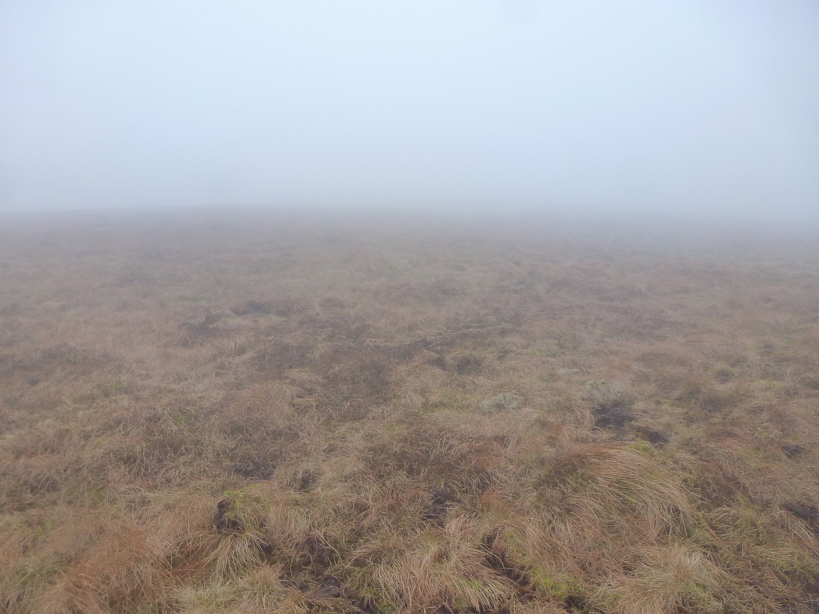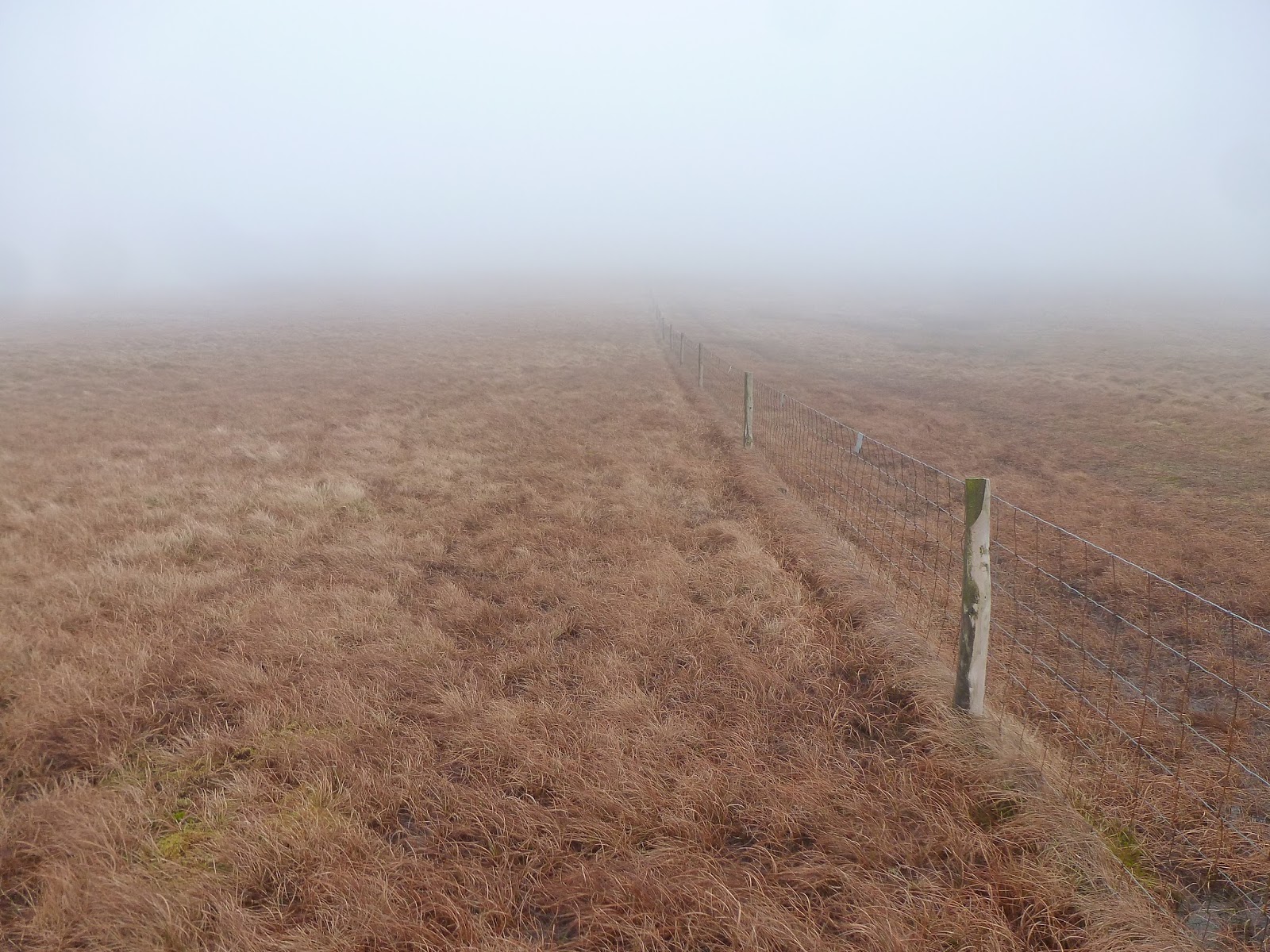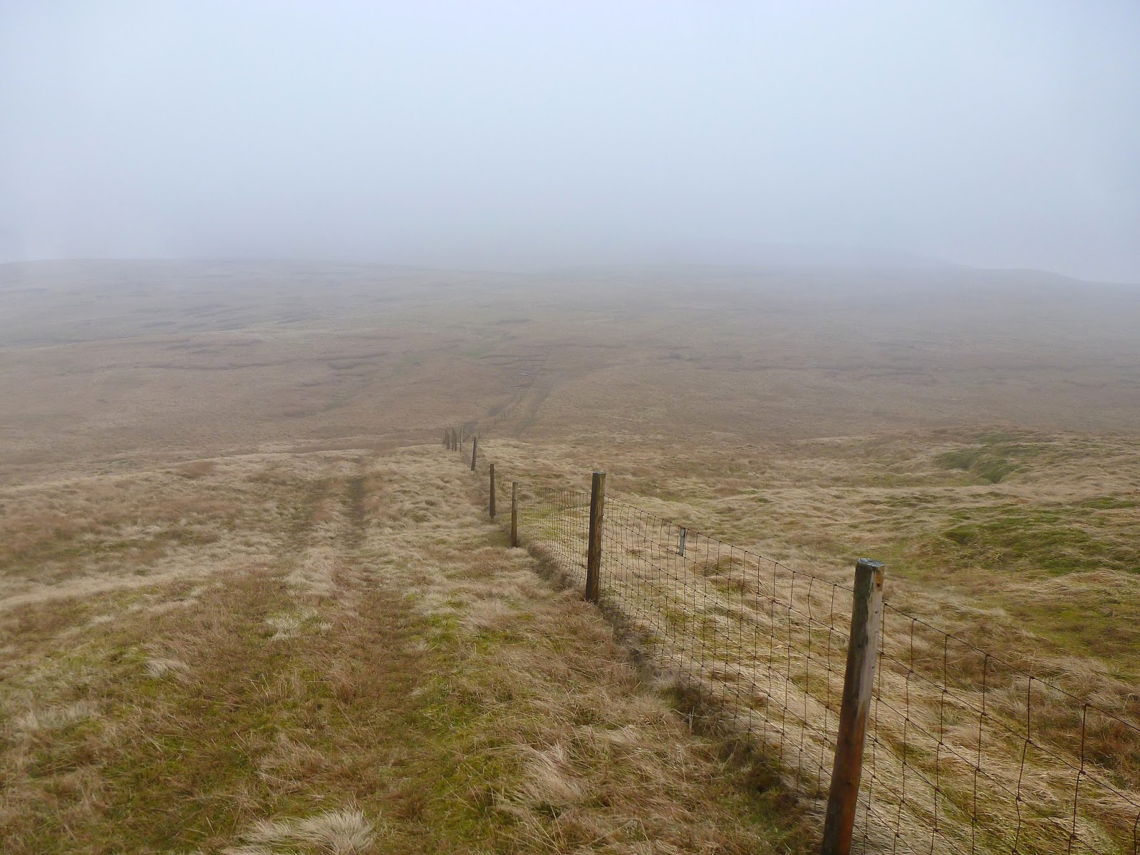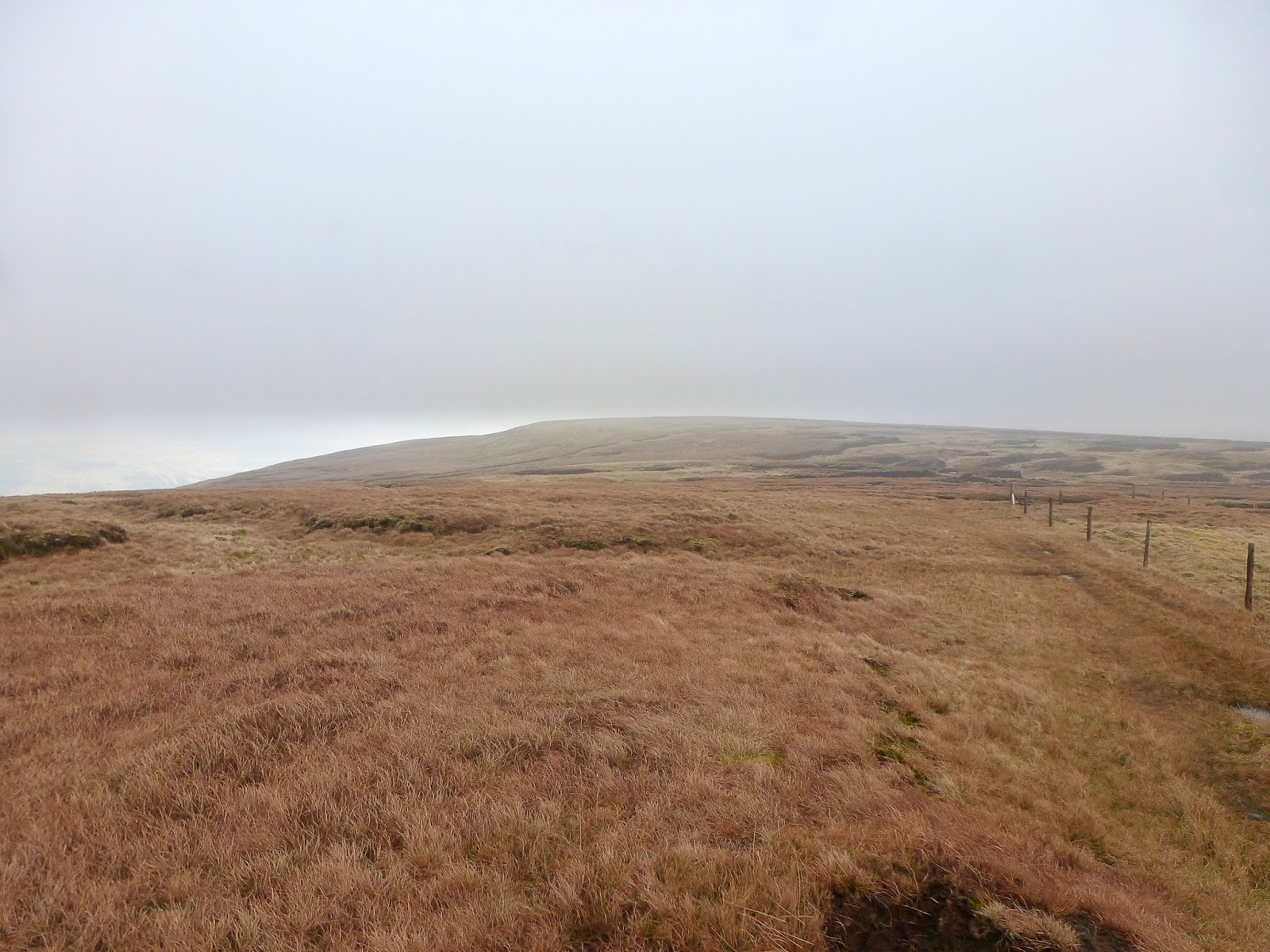 After a decent nose around and a quick sandwich, I was back on my feet again to make my own King of the Mountain climb back up to the high point of the pass. It here that our trusty fence from earlier crosses the road and climbs up to the summit of Lovely Seat. Once again, there are no paths marked so you could go any which way you pleased however, given the rather featureless moorland, following the fence is your safest bet. As such, that’s exactly the route I took, cutting across Black Bogs before making the climb. There are a couple of steep-gradual combinations before the ground flattens considerably at the summit. I had to use the trusty GPS to guide me to the very top with the cloud obscuring everything around.