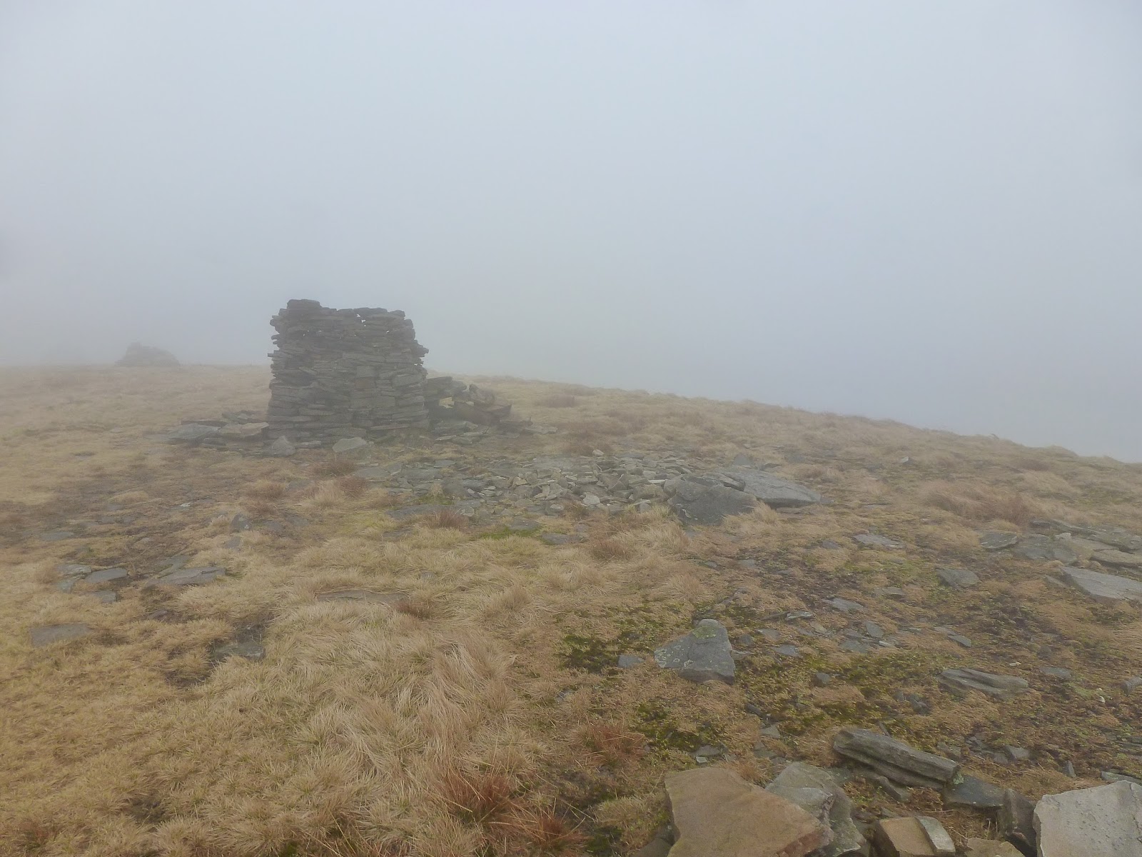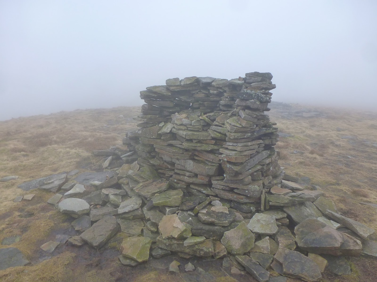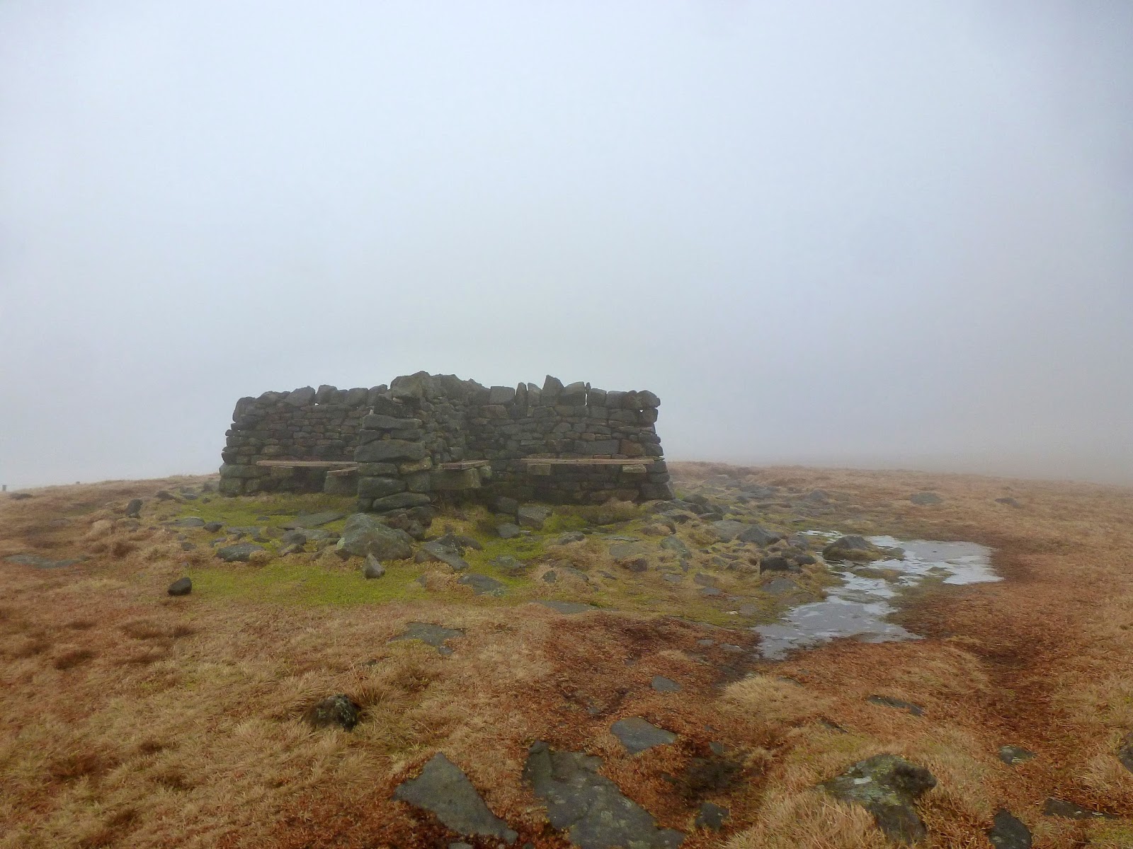After crossing Black Hill Moss and reaching Crag End Beacon (more a cairn than a true beacon), the path flattens considerably for a kilometre before the final 60m climb up to the summit. By now, the height gain had put me into the clouds and the walk took a bit of an eerie turn with many odd shapes and features looming out of the gloom. One of those, thankfully, was the summit cross shelter which provided a welcome break from the wind and a moment for a brief sit down.