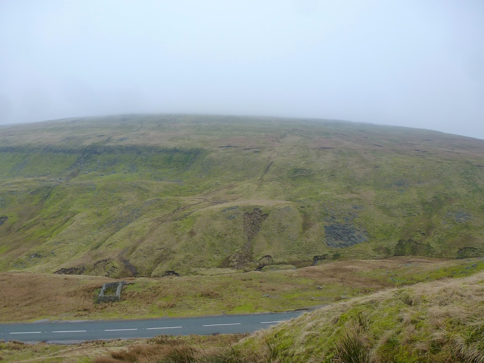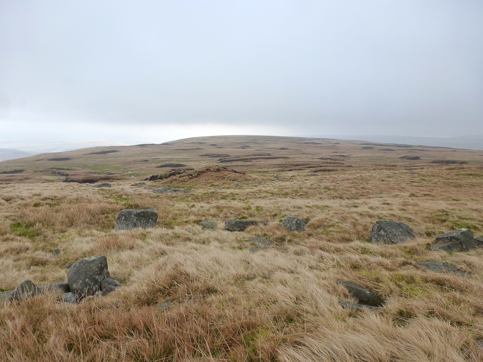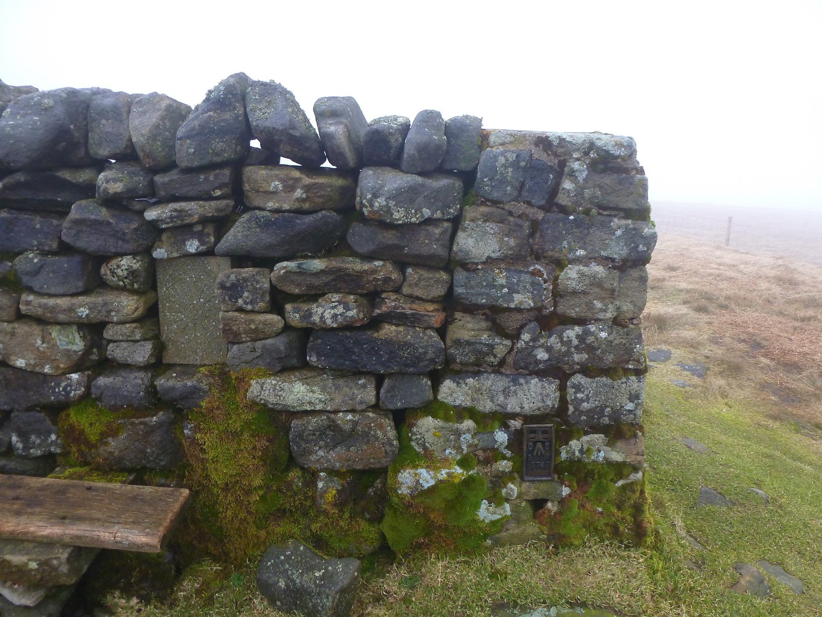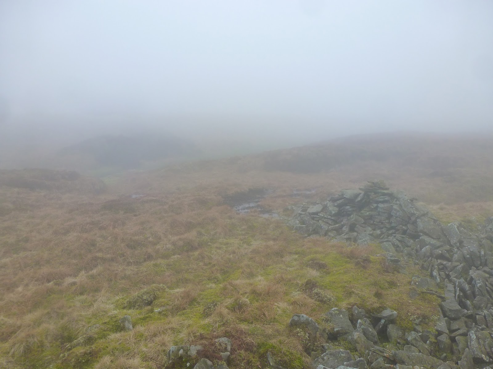 After crossing Black Hill Moss and reaching Crag End Beacon (more a cairn than a true beacon), the path flattens considerably for a kilometre before the final 60m climb up to the summit. By now, the height gain had put me into the clouds and the walk took a bit of an eerie turn with many odd shapes and features looming out of the gloom. One of those, thankfully, was the summit cross shelter which provided a welcome break from the wind and a moment for a brief sit down.