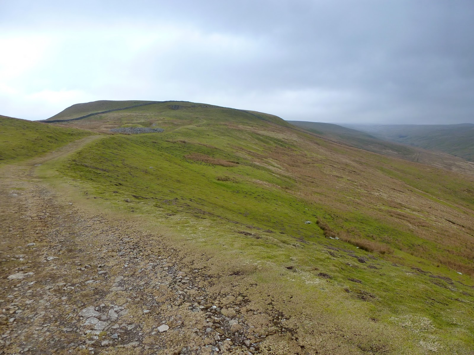 As I started up along the main track, the weather was as predicted, cool and cloudy with a light breeze; perfect conditions for a hump up the Pennine Way. The climb to the summit of Great Shunner Fell is along a very long ridge that climbs from 250m to the final height of 716m over around 6.5 kilometres, an almost continuous gradient of just 10%. In addition, as I’ve just mentioned, the route to the summit consists entirely of a very popular stretch of the Pennine Way that links Hawes to Thwaite. That means that the path is easy to follow, well maintained and well signposted, a stark contrast to the neighbouring Lovely Seat.
