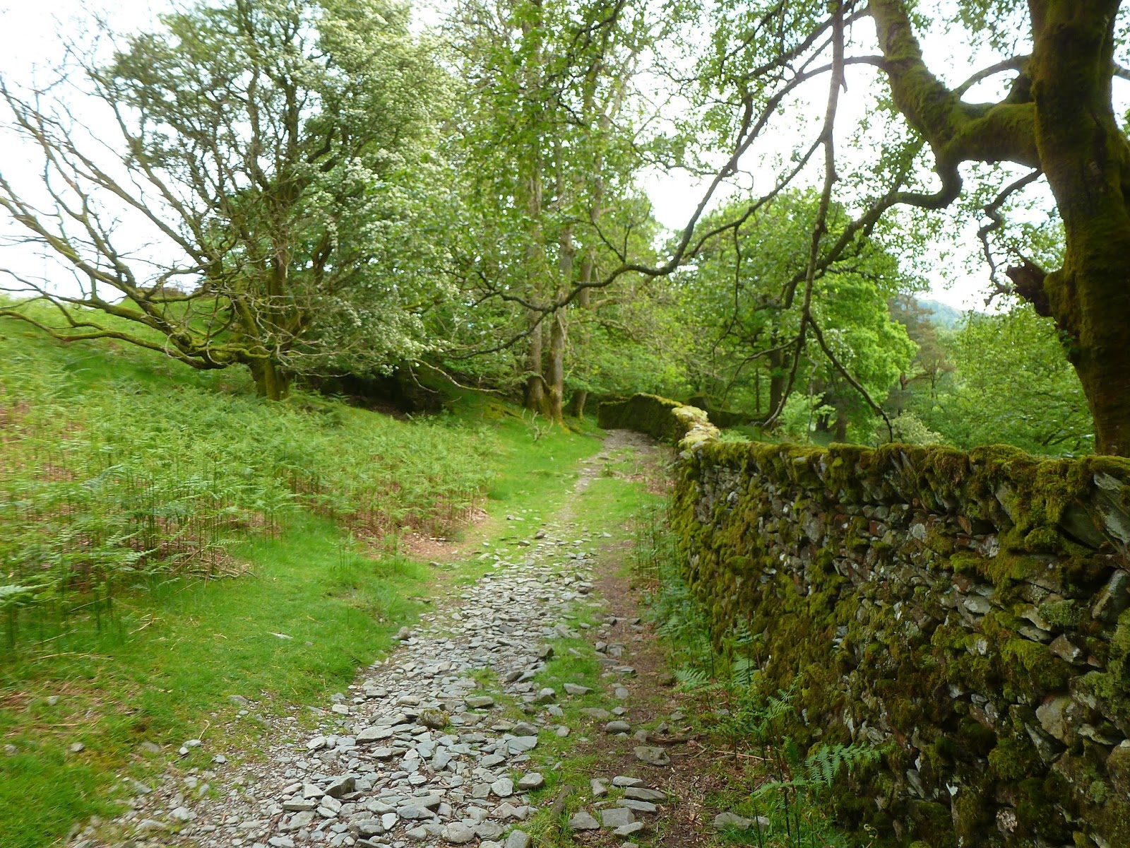 The corpse road, as its name suggests, is generally a wide undulating track, easy to follow though lacking in any real interest. Trees and dry stone walls often hide the best of the views though there are a few tantalising glimpses down to Rydal Water and across to Loughrigg Fell. The path eventually reaches Rydal Mount (Wordsworth’s home from 1813 until he died in 1850) and the busy main road between Ambleside and Grasmere, it’s quite a challenge to cross thanks to a series of bends that hide any oncoming traffic. Once successfully negotiated, a small footbridge crosses the infant River Rothay to the lower slopes of Loughrigg Fell at the moss covered tree roots at Steps End.