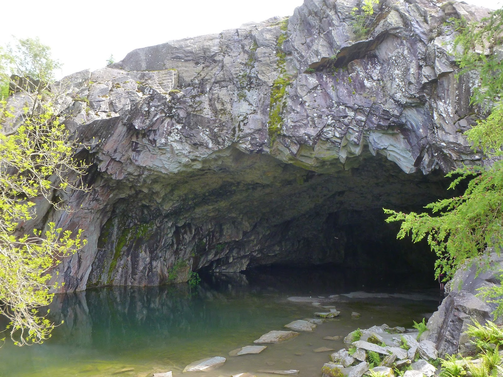 Throngs of people were out in force by now, it’s great to see so many people enjoying the great outdoors, especially those with younger children. Loughrigg Fell provides the ideal opportunity for parents to take the first tentative steps into rearing a brood of new mountaineers. I used to hate walking. How times have changed. Being careful not to take the path to Loughrigg Terrace, we found our way to the vast and imposing Rydal Cave. Though not strictly a cave (it was formerly a slate quarry), the opening forms a dramatic mini amphitheatre, much of which is now flooded by a stagnant pool, which teems with small fish and insect life.