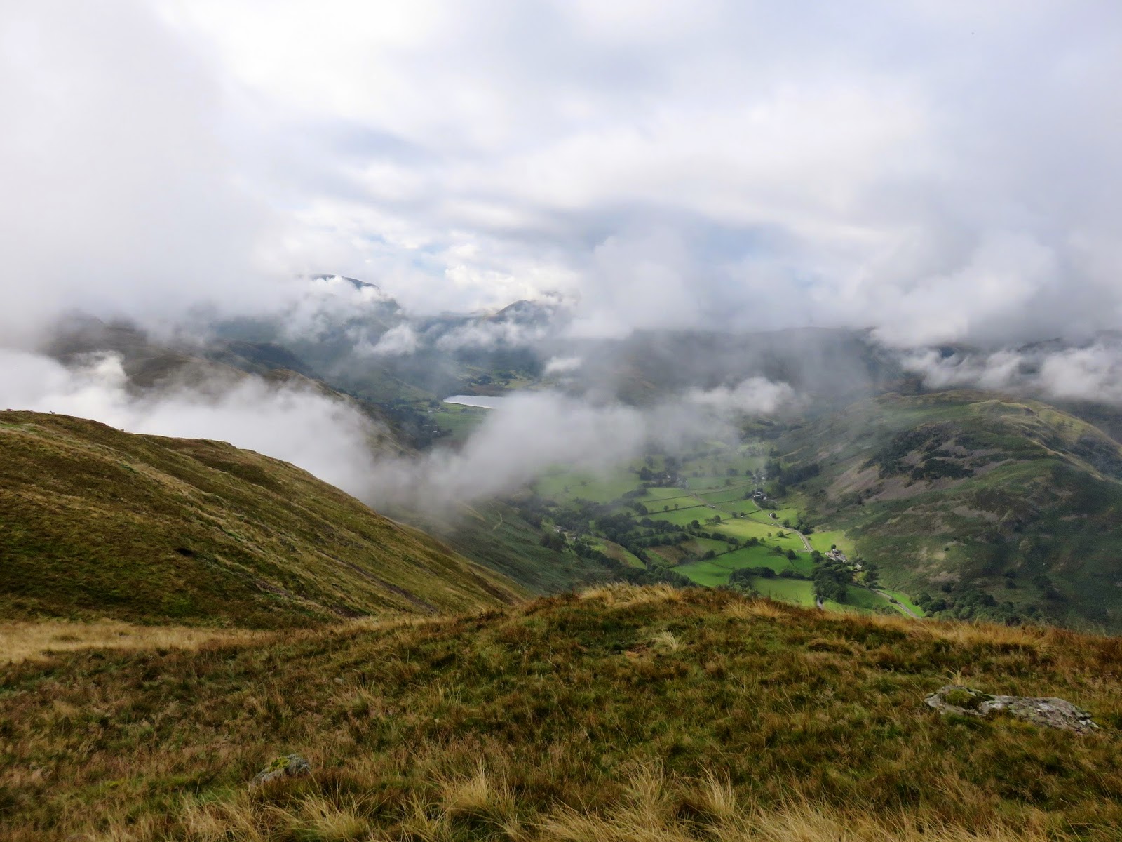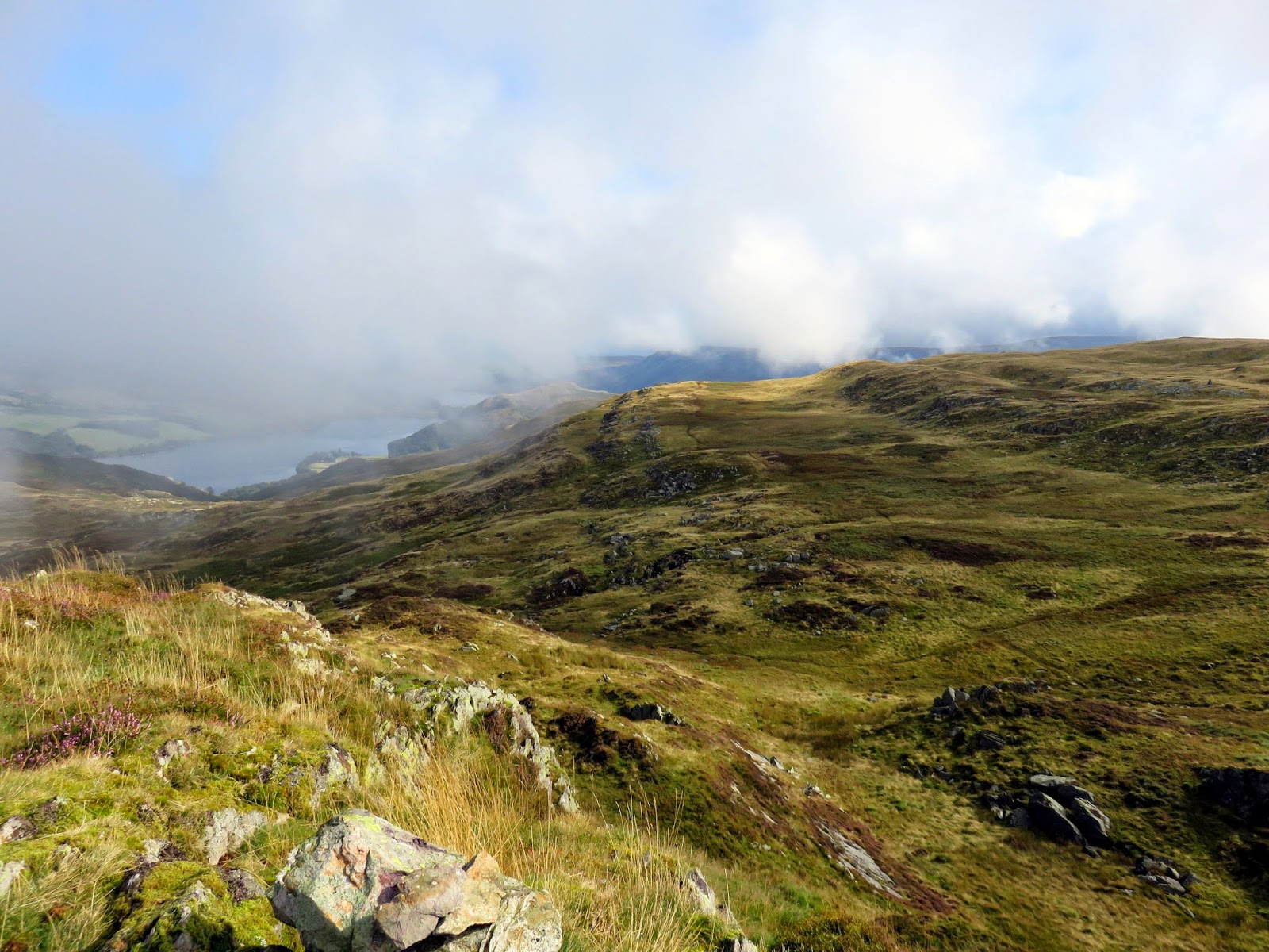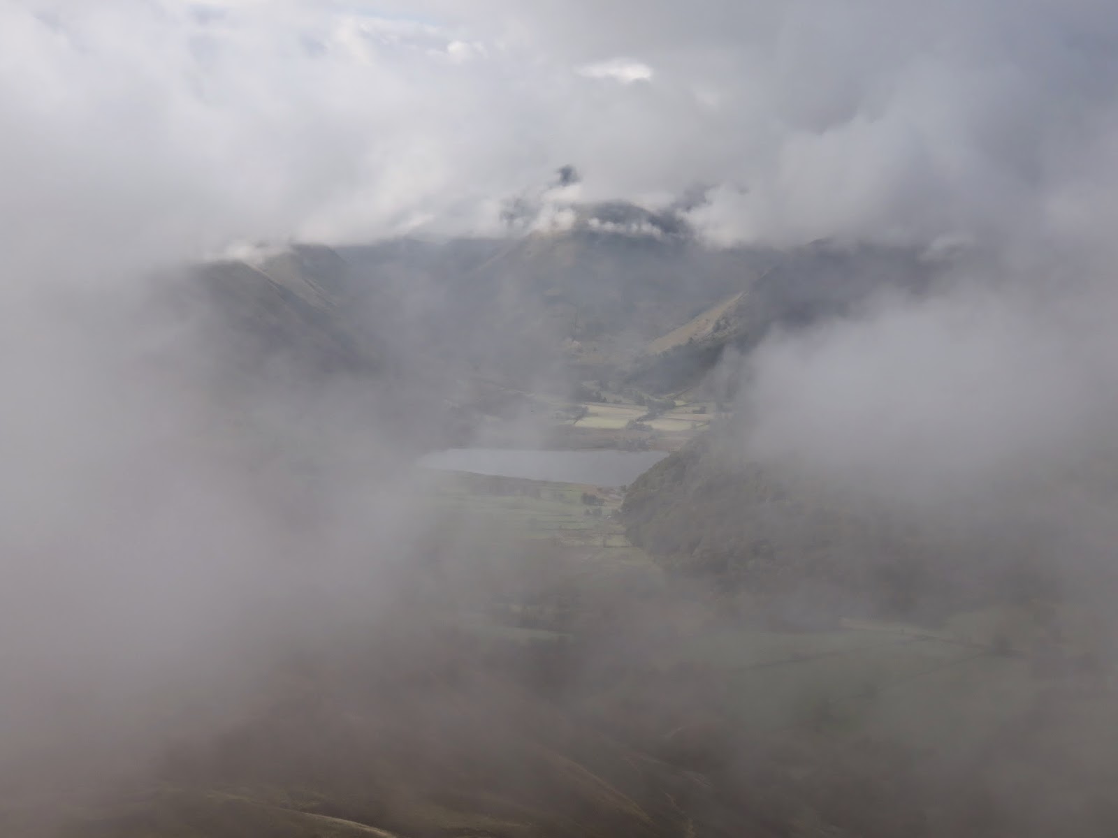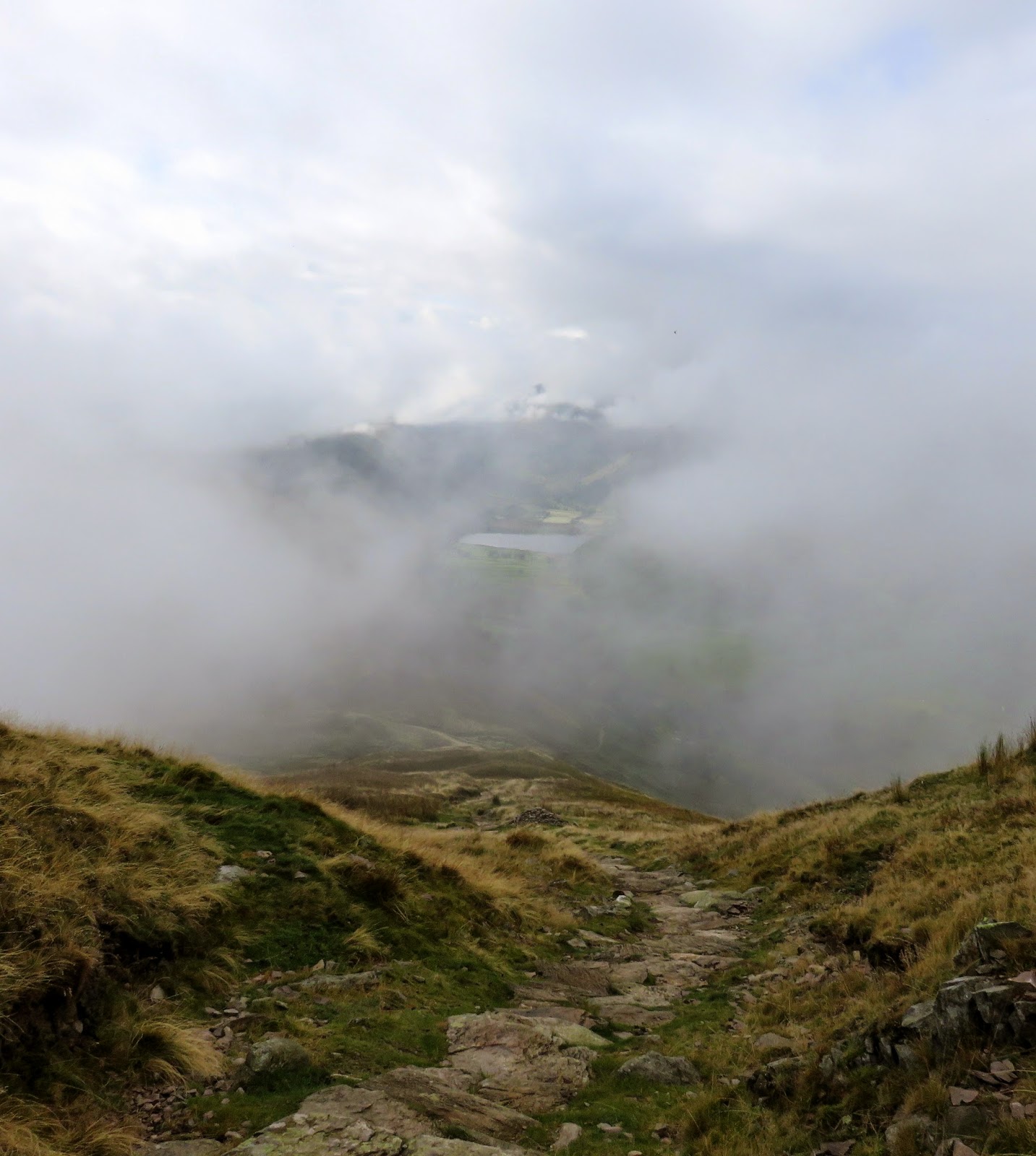 The clouds were well and truly breaking up now creating an arresting scene ahead of me. I spent a while watching them swirl around, hoping to catch a view across to Helvellyn but they held on to their grip of its summit. In fact, one rather large one decided to rise up out of the valley directly towards me, signalling my time to crack on and complete the final section of the walk.