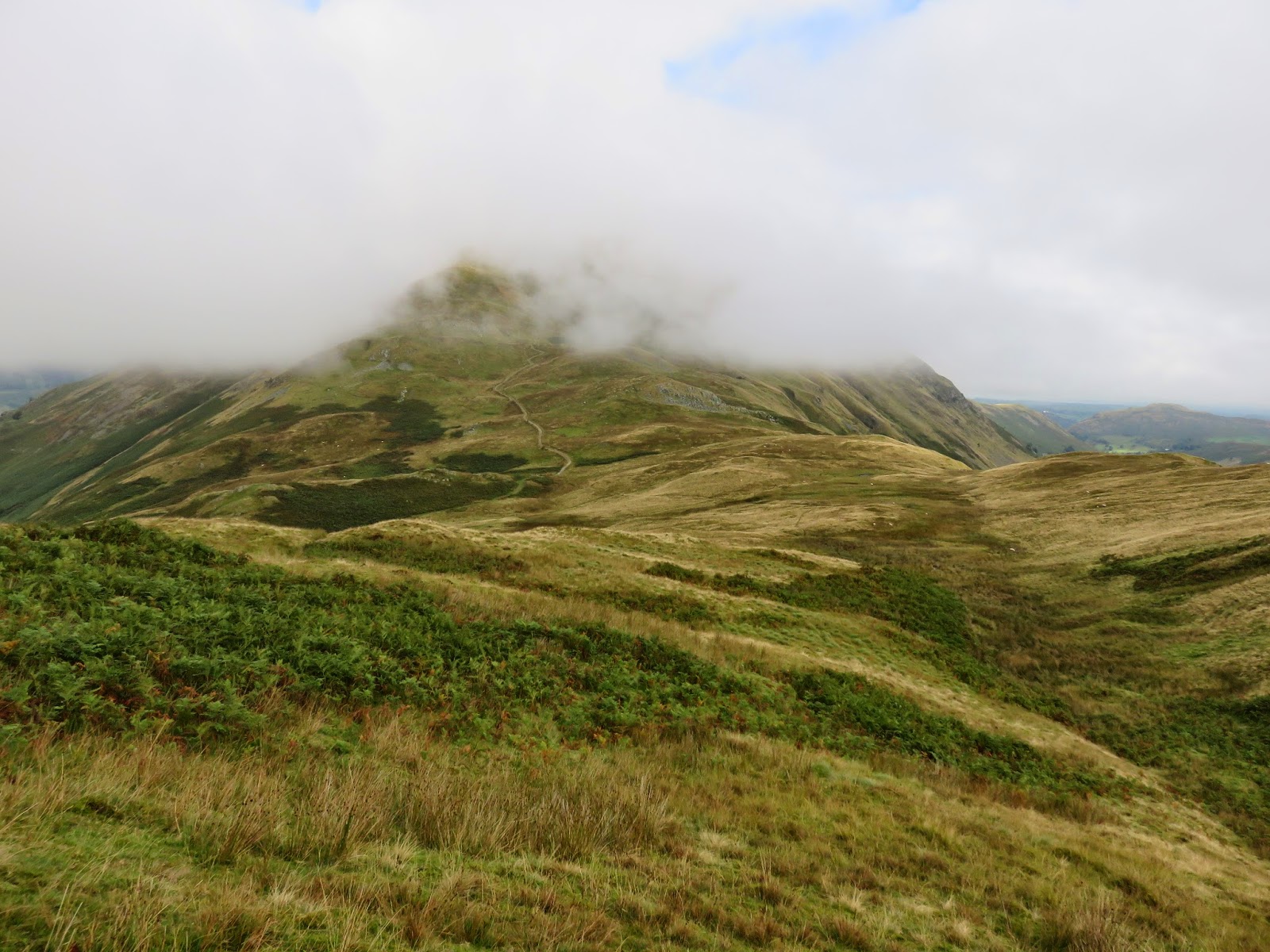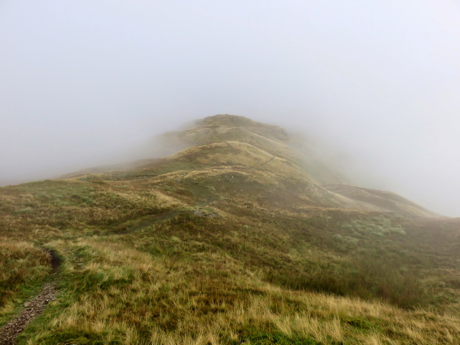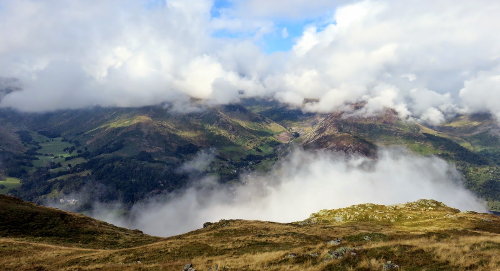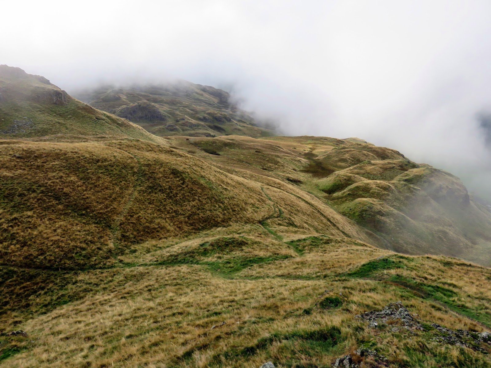 The clouds were well and truly breaking up now creating an arresting scene ahead of me. I spent a while watching them swirl around, hoping to catch a view across to Helvellyn but they held on to their grip of its summit. In fact, one rather large one decided to rise up out of the valley directly towards me, signalling my time to crack on and complete the final section of the walk.