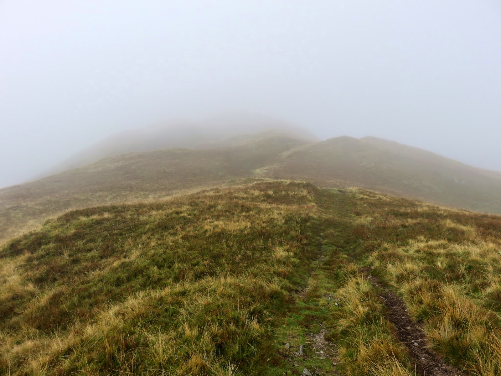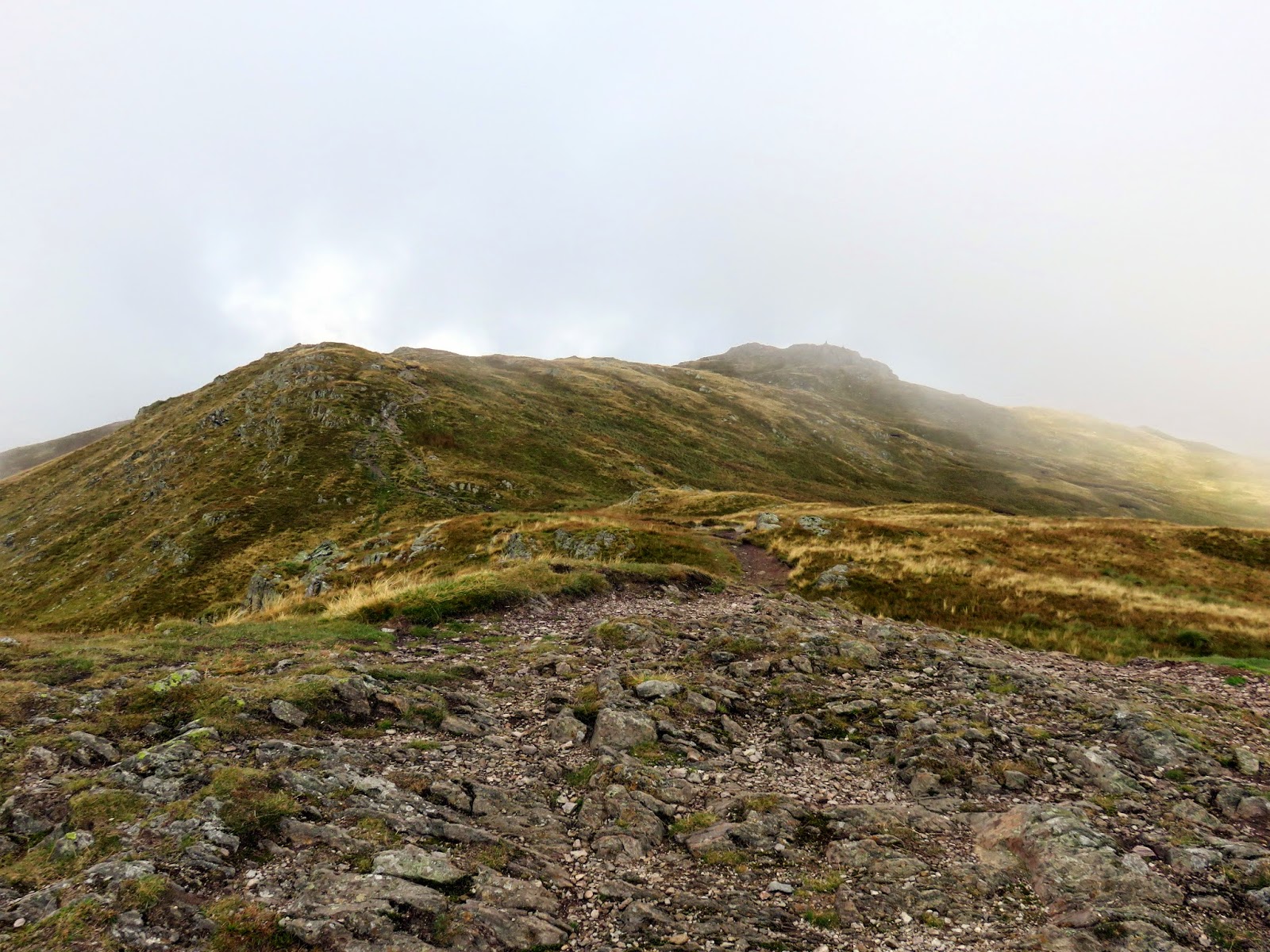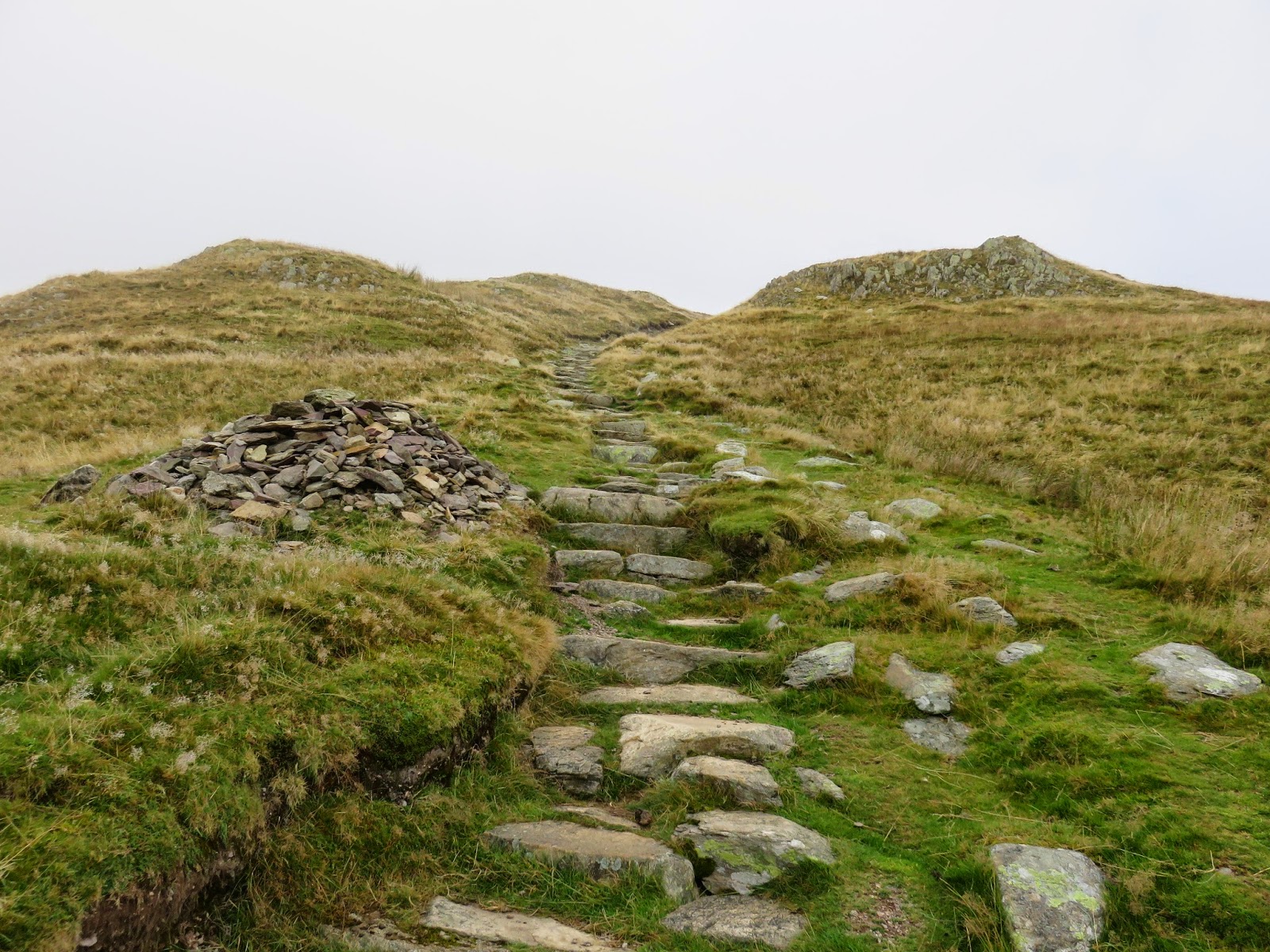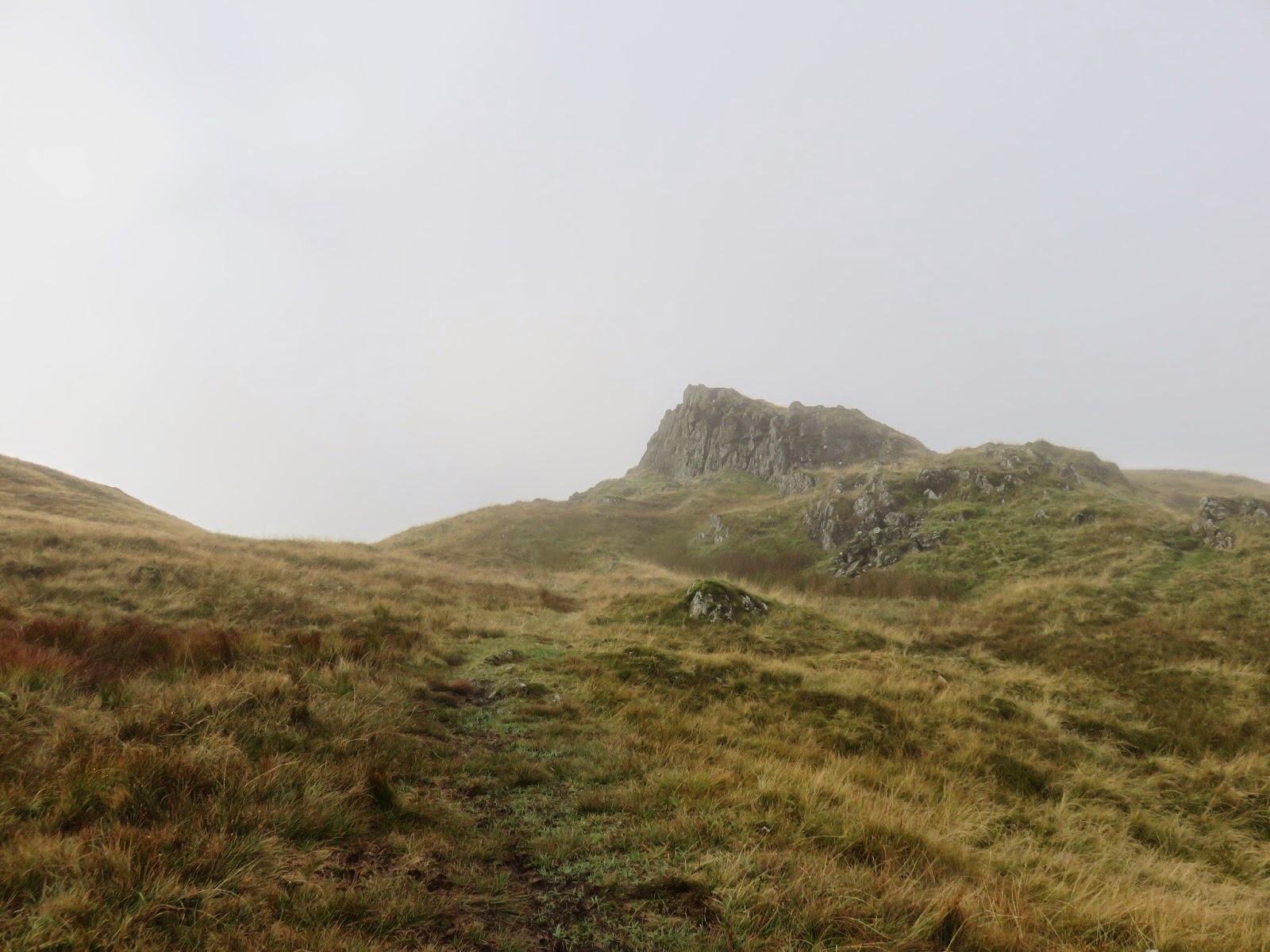 Winter Crag presents the first real obstacle of the day, a tall rocky knoll that climbs onto Howstead Brow. Beyond, the path remains fairly flat for a short distance before it begins climbing again, winding a steep route up into the clouds between Low Brock Crags and Allen Crags.