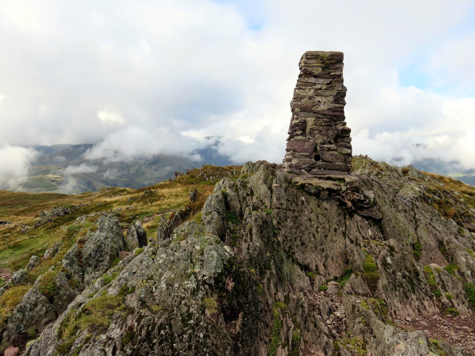 A cairn marks the top though a series of hummocks across the top certainly challenge its authority. From Beda Head, the paths falls some 50m down to Beda Fell before it begins to climb again, this time up towards Angletarn Pikes. The clouds were slowly starting to break up now, forming some eerie silhouettes of the distant crags as well as offering some tantalising views towards the valley bottoms. The ascent to Angletarn Pikes is very easy indeed, a final short scramble reaches the bare summit.