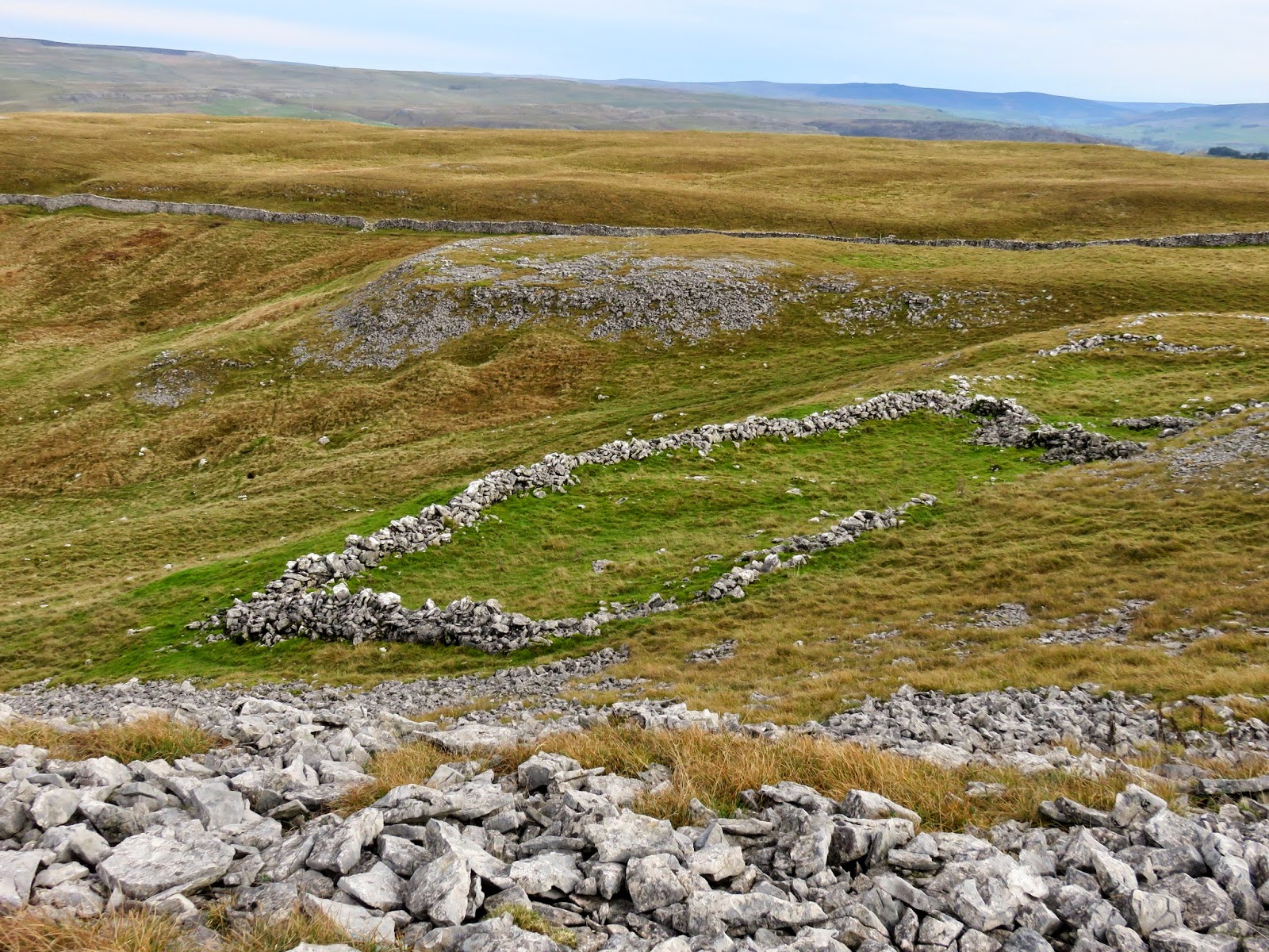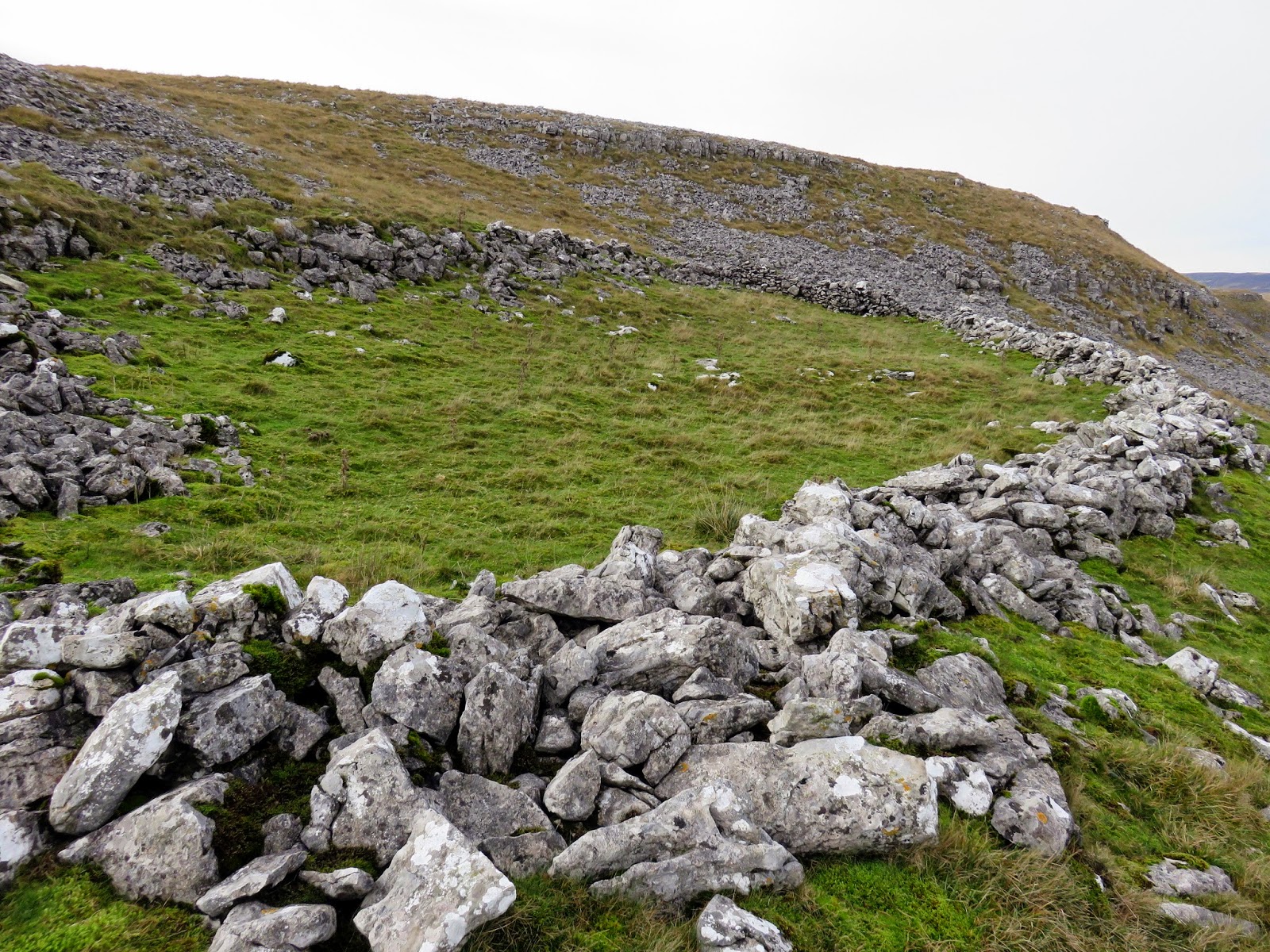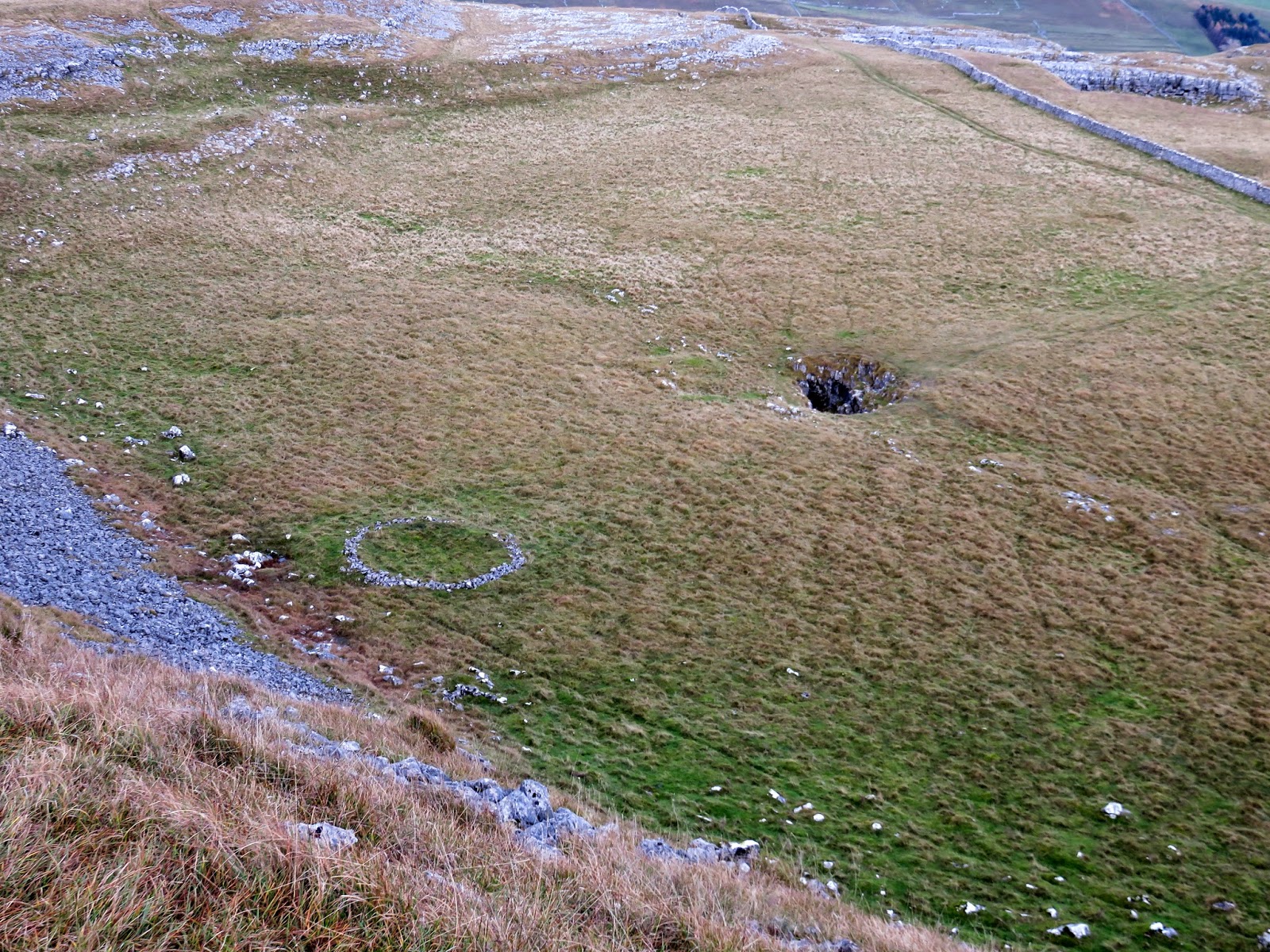From the peak of Dowkabottom, a large bowl stretches out ahead of you, guarded on both sides by a steep limestone escarpment. The limestone hillside holds the remains of several walled enclosures and hut circles, an extensive prehistoric settlement complex. A few of these are quite obvious, especially the remains of a circle hut down in the bottom of the bowl. There’s a clue to the name Dowkabottom held on the 50k maps where the nearby cave is actually called Douky Bottom. It is suspected that douky, meaning ‘damp, wet or misty’, is a north dialect word.