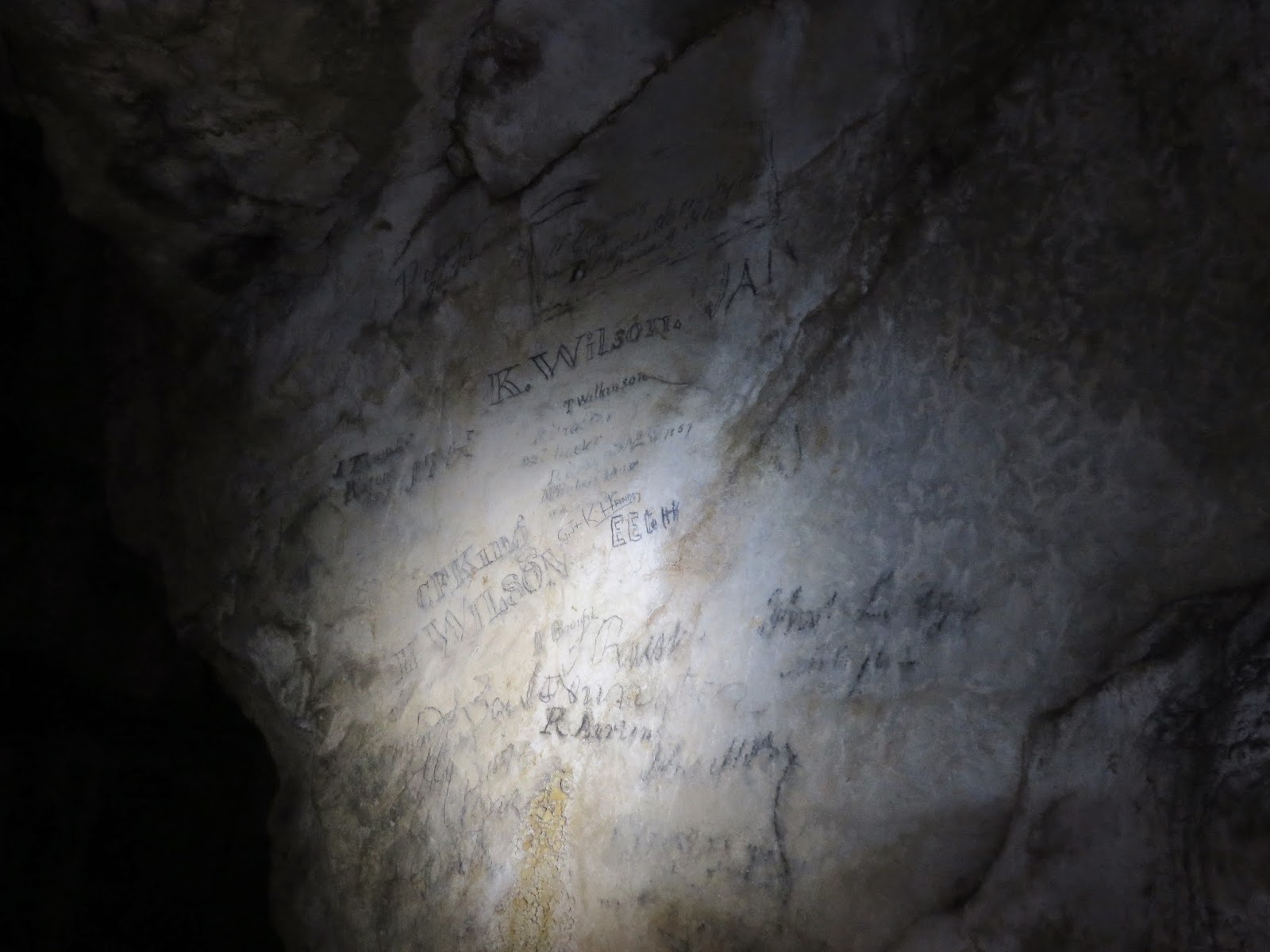 Away from the look out posts, Sara and I headed over to the cave for a quick look inside. It’s an easy scramble down into the first, large cavern which we illuminated with our head torches. The cave was used as a home and place of storage by humans the ancient settlers, a fact discovered in the 19th century when a tiny child’s skeleton was found, hidden in a small grave chipped out of the stalagmite floor and covered in stone slabs. There is also a number of etching on the walls, left by numerous visitors to the cave.