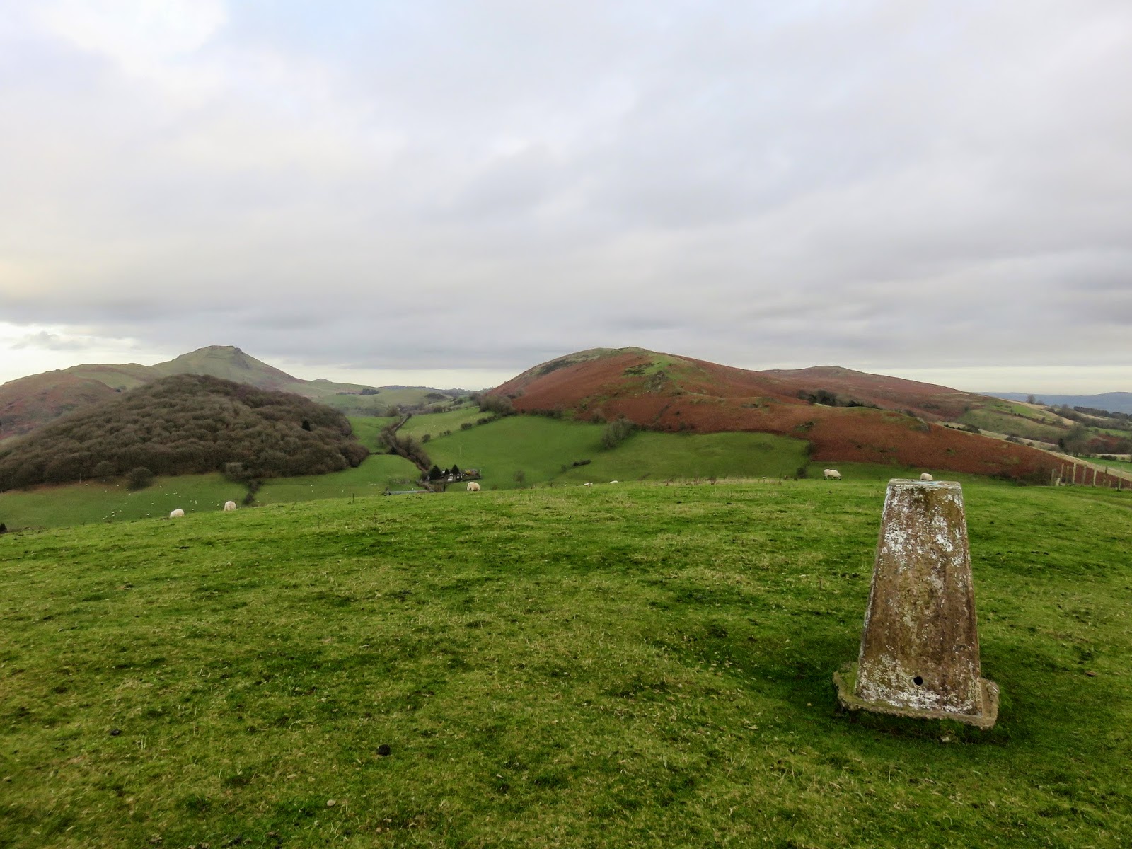 The highest point of Ragleth Hill actually sits almost dead centre along the ridge but has no adornments other than some rocks poking out of the grass. Briaryley, the southern prominence, has the remains of a telegraph pole of sorts. In the short time, we spent crossing the top the clouds had rolled in, hiding the glorious sunshine behind a dark grey blanket.