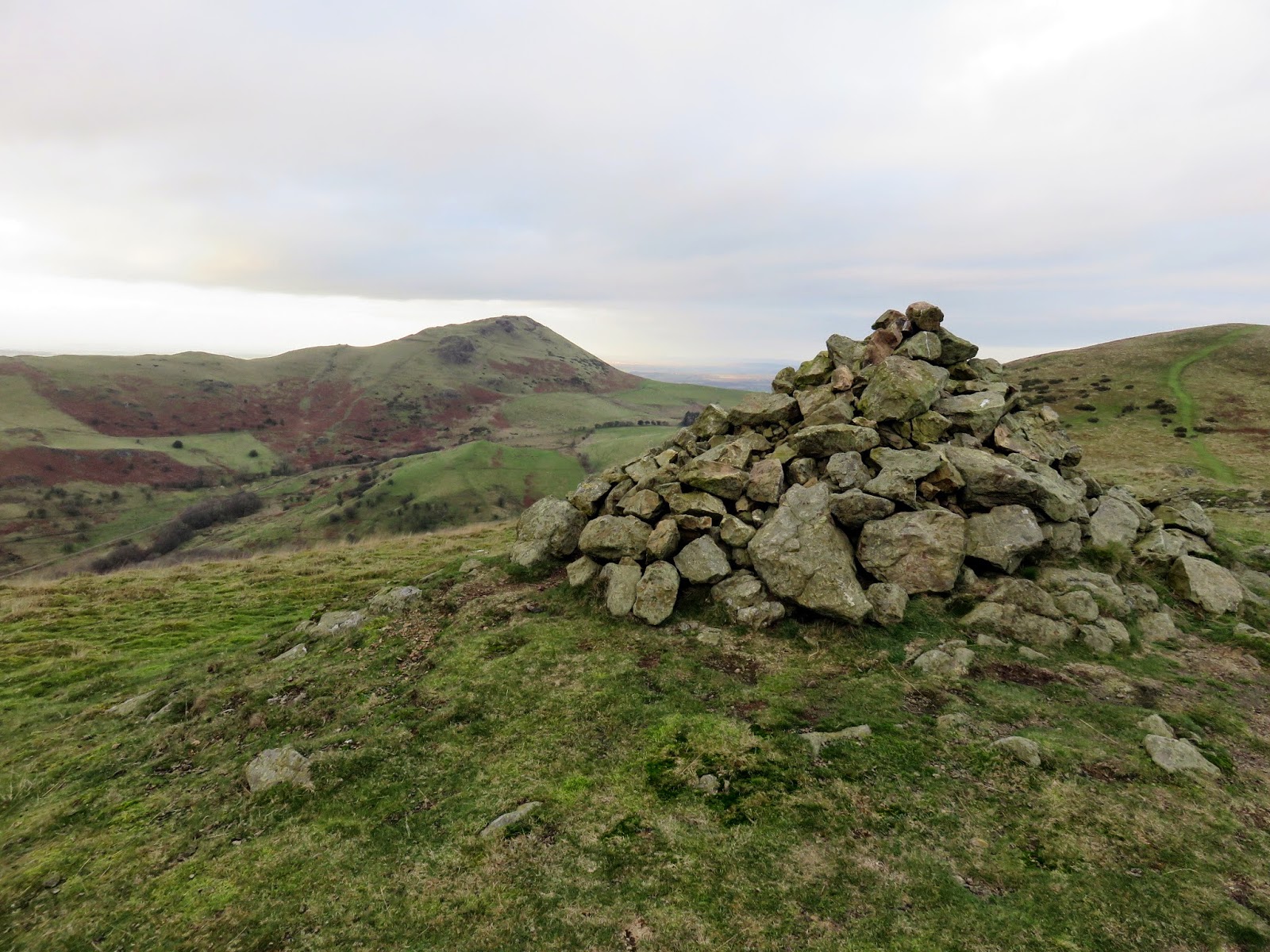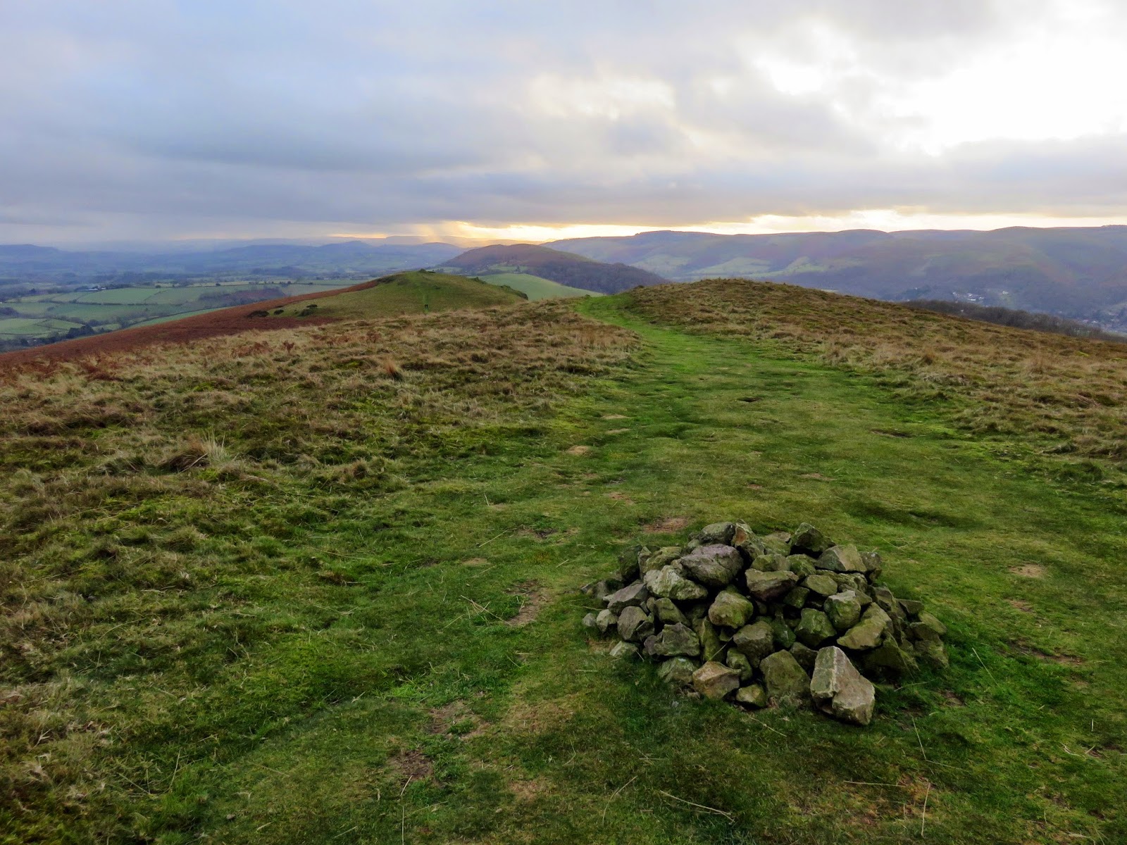 Hope Bowdler Hill has a trio of summits, the highest being the furthest to the north. Strangely, it’s the second highest top that has the most prominent cairn. Perhaps it marks the best view across to the nearby Caer Caradoc or has some other historical meaning. Luckily the sun had slunk beneath the cloud layer by now and was casting a delightful golden light across the hillside ahead of us. This is easily my favourite time of the day as it adds a definition to the hills that’s sorely lacking during the midday hours.