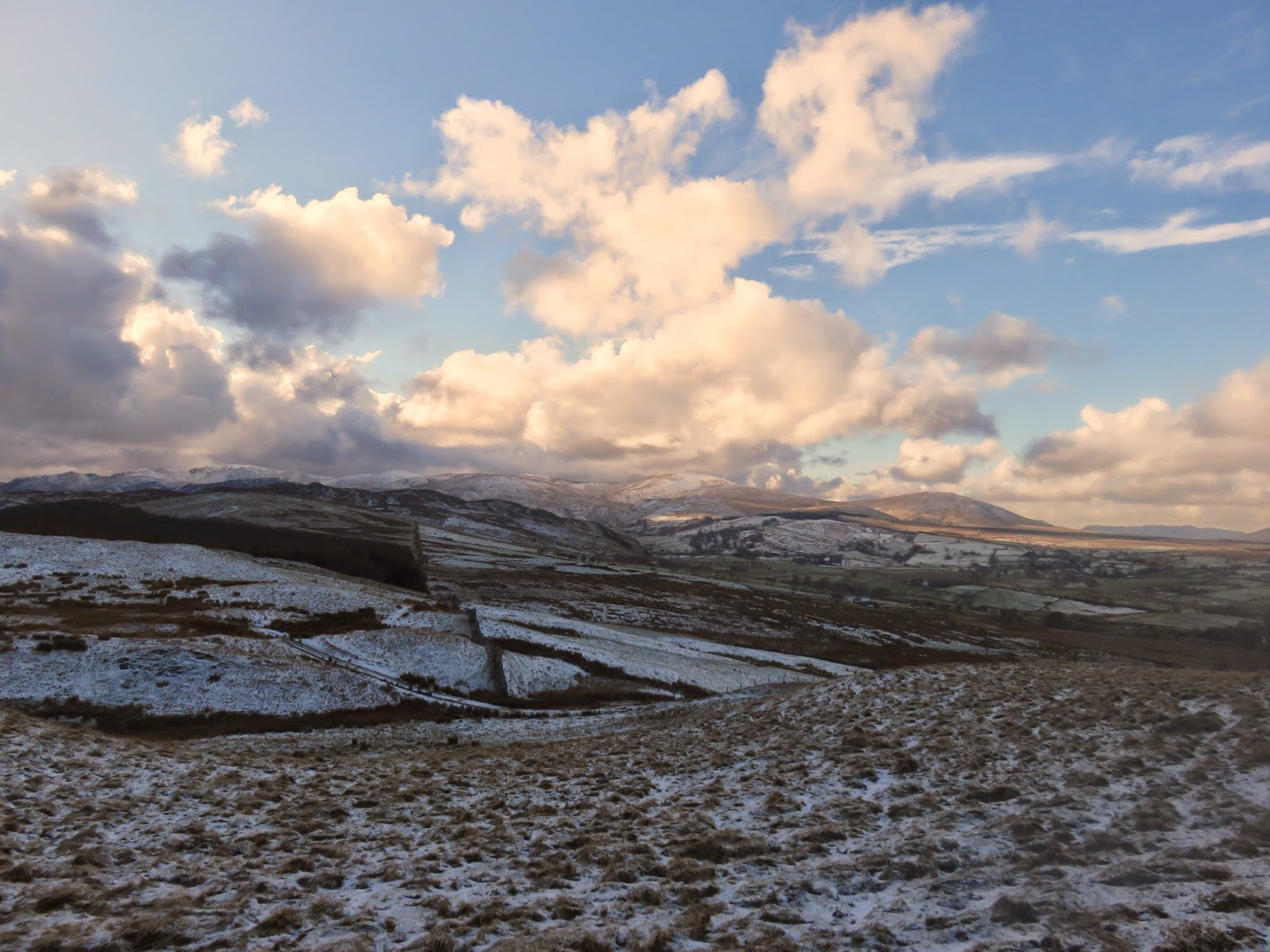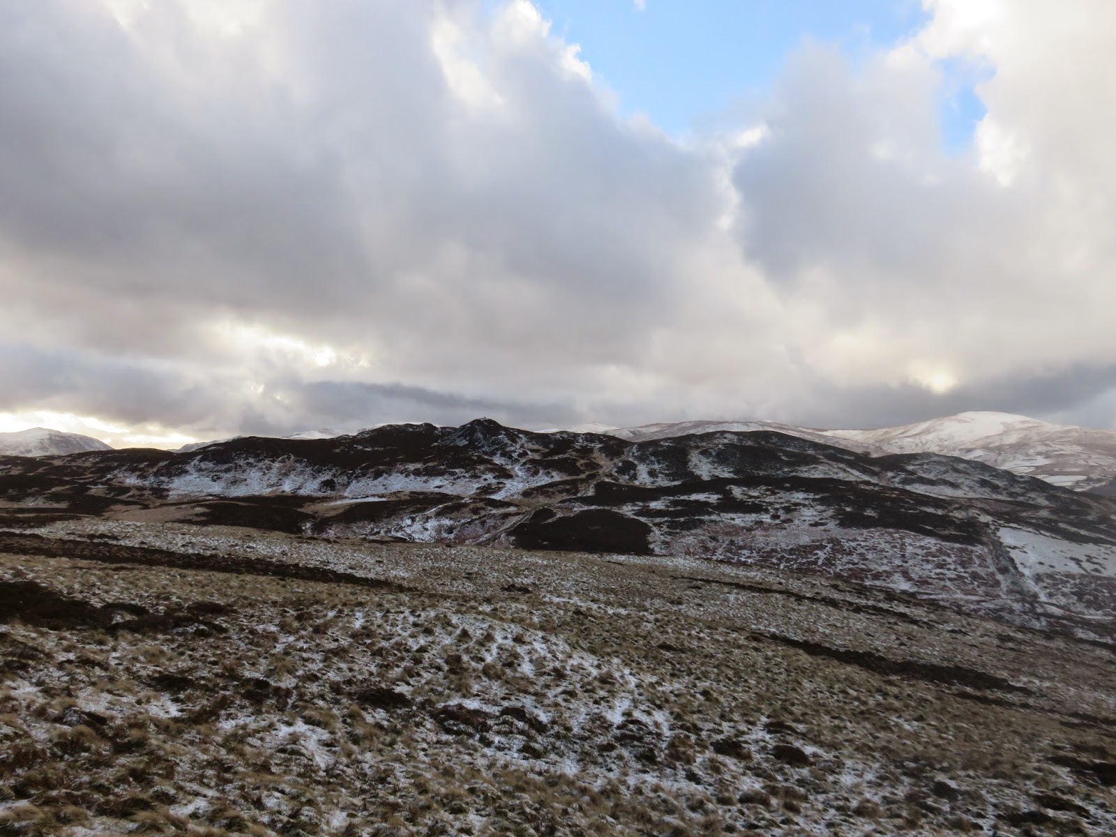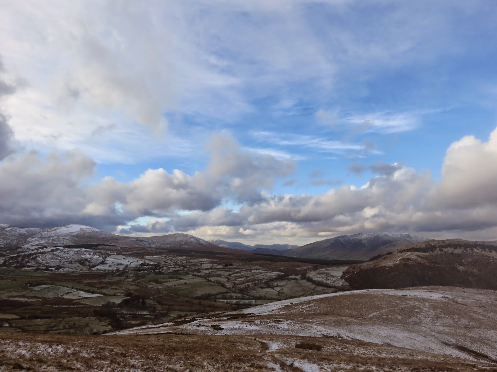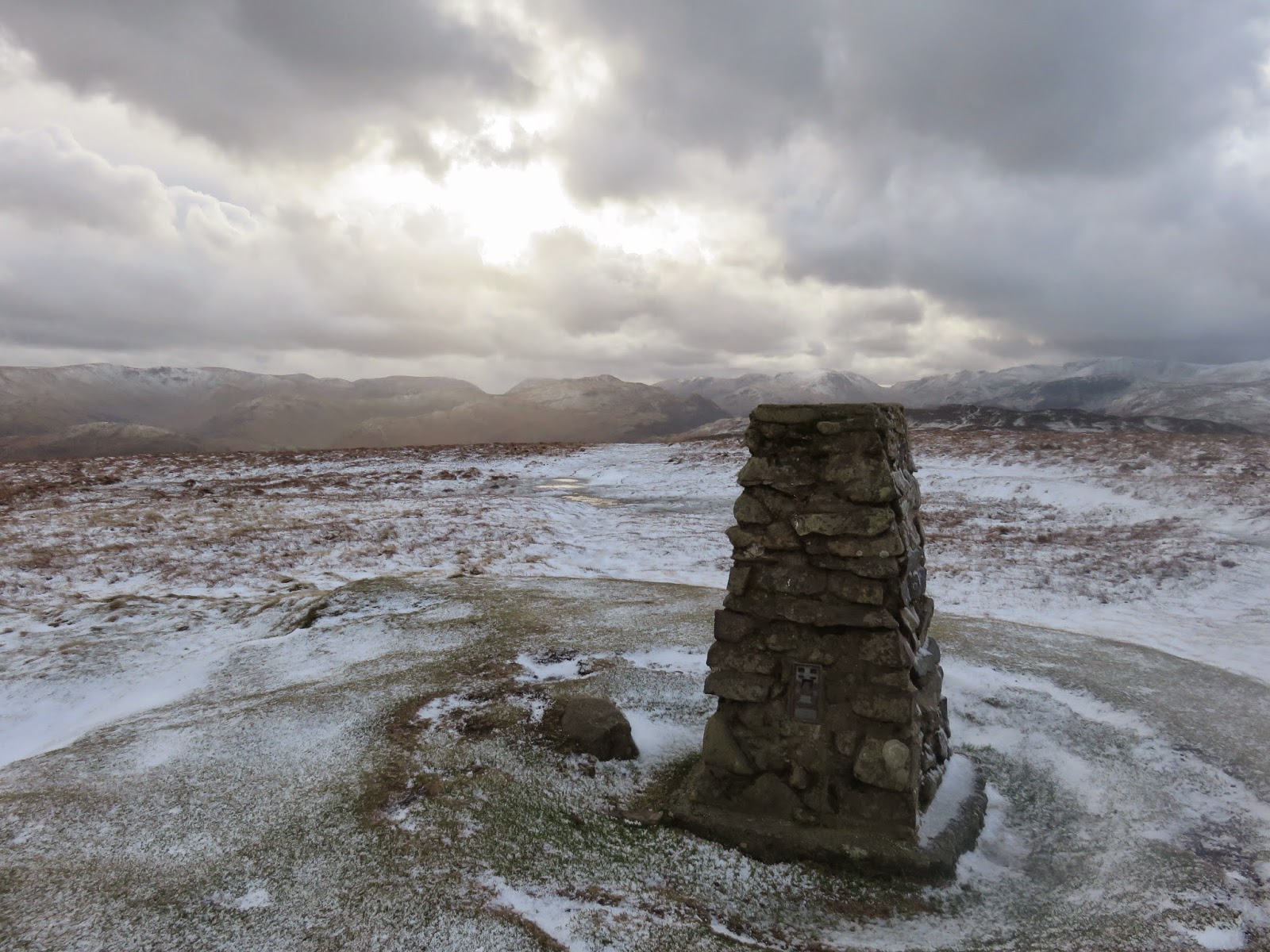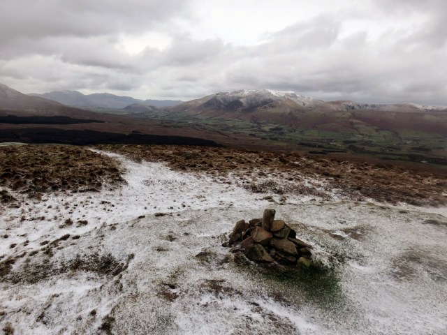 The top is bare with no real cairn or feature though a tumulus is marked on the the OS maps. This is possibly a Bronze Age burial mound. The views in all directions are pretty good, the highlight being Blencathra which, on a day like today, was looking its most mountainous.