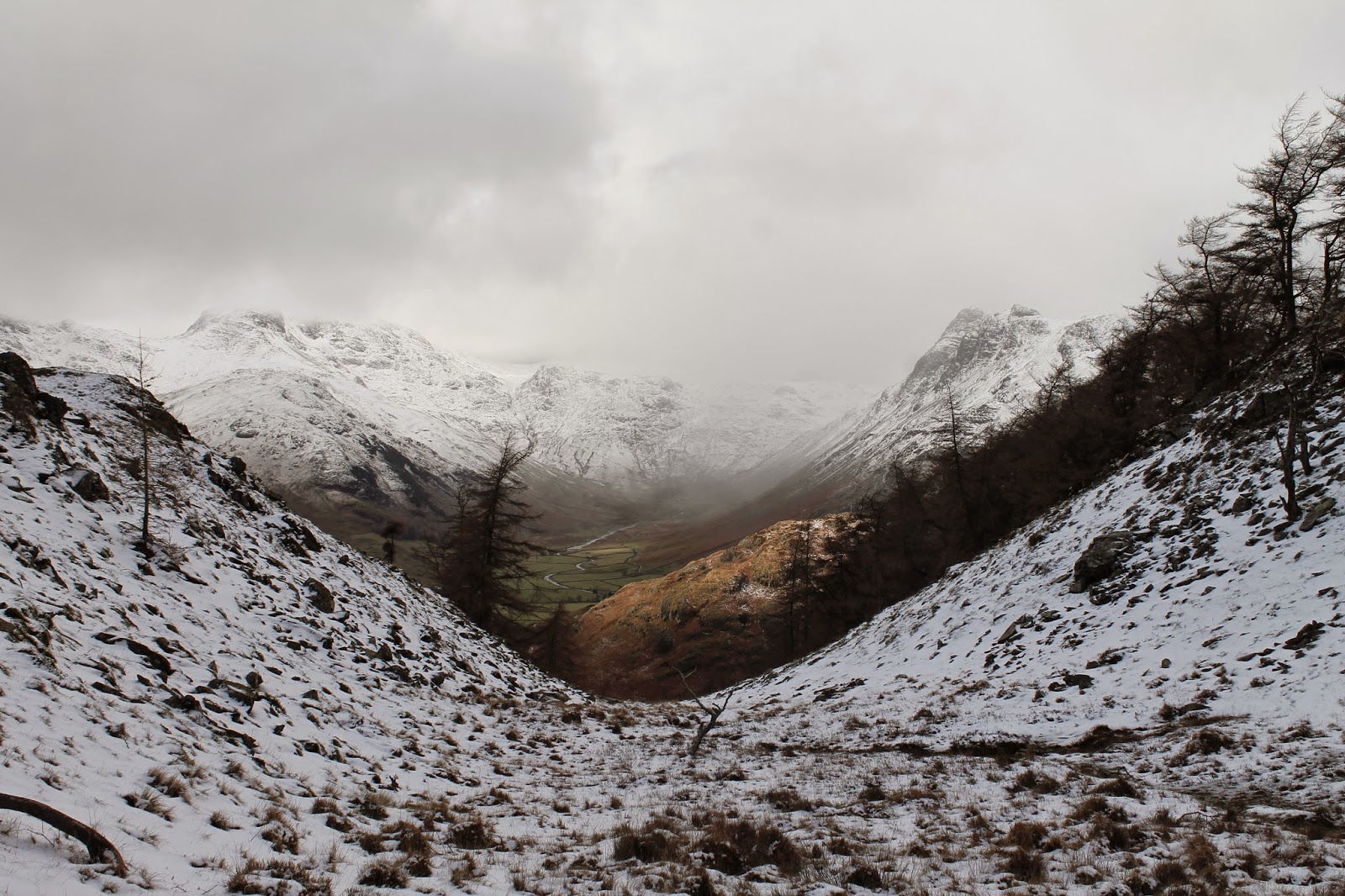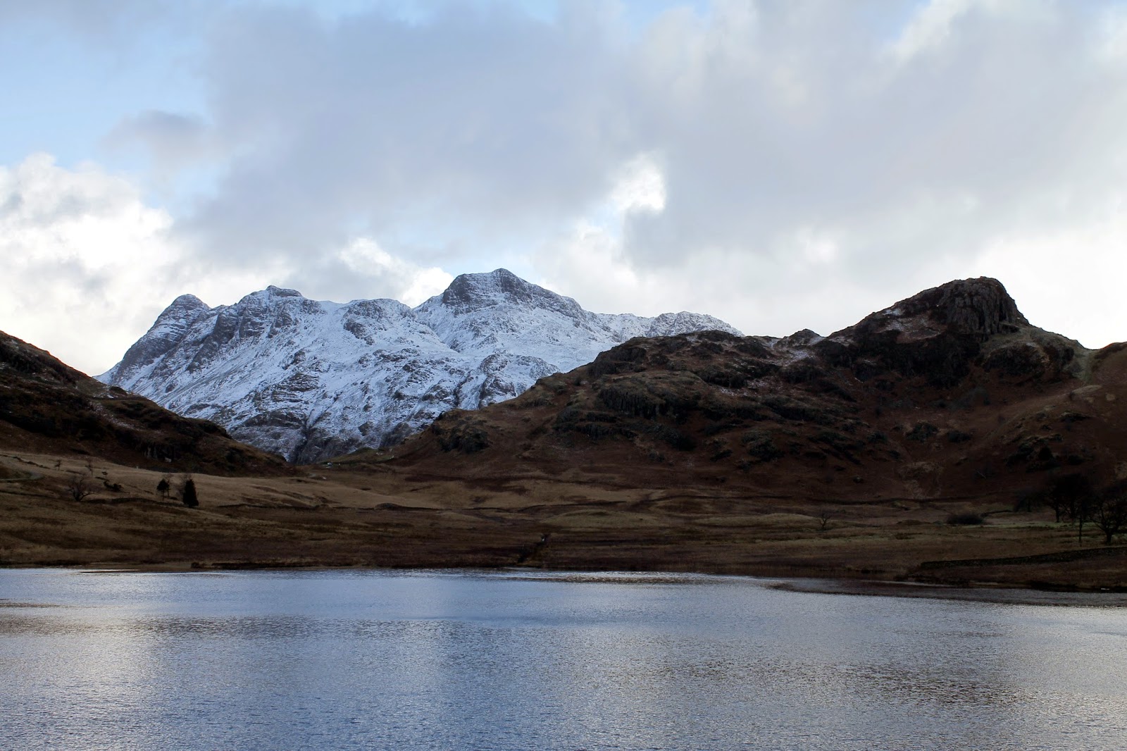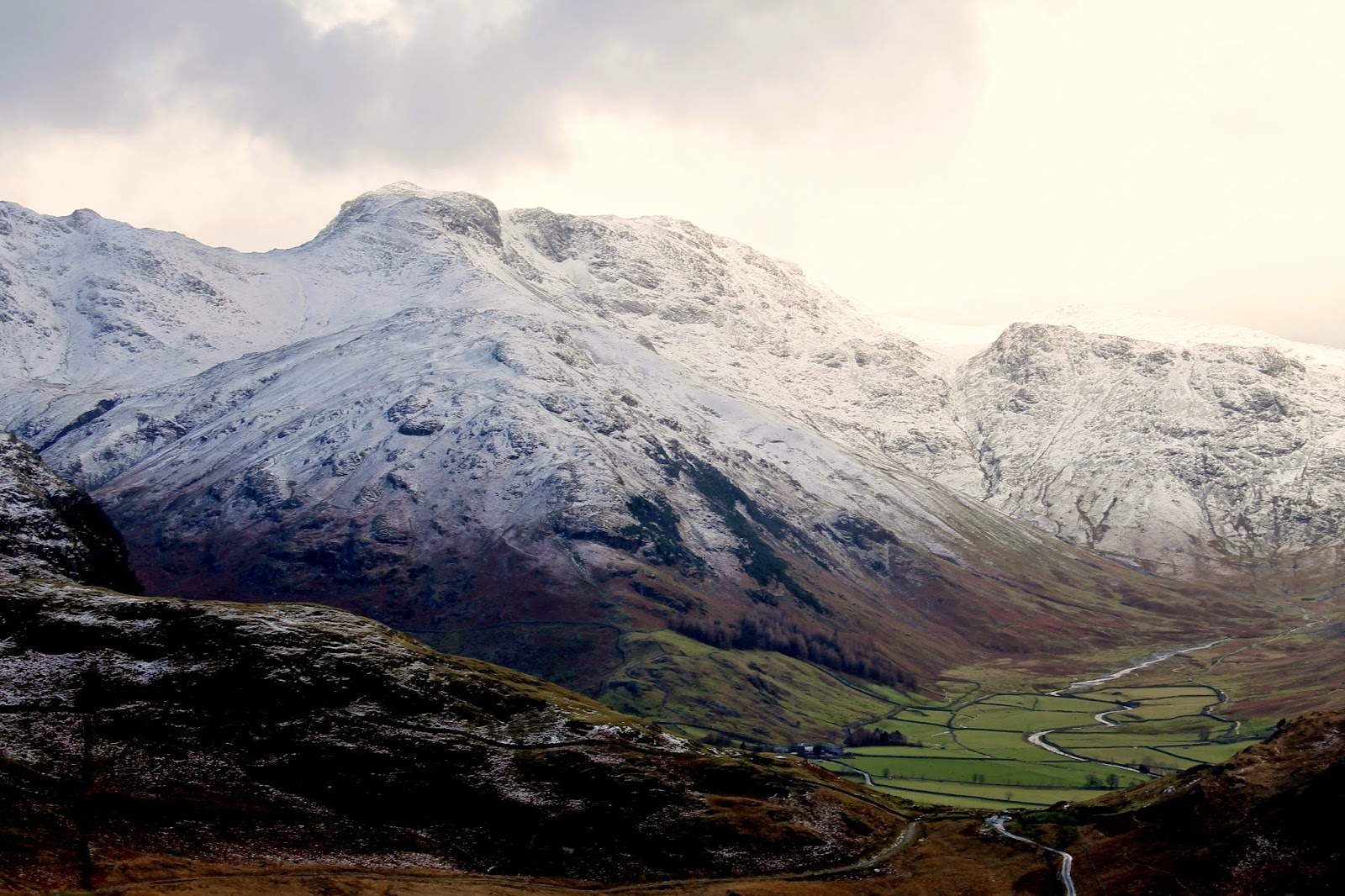 | A subdued but snowy Langdale Pikes |