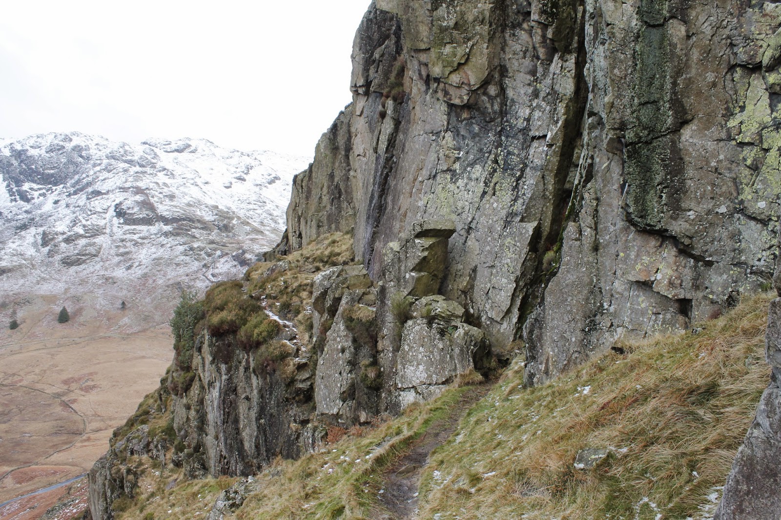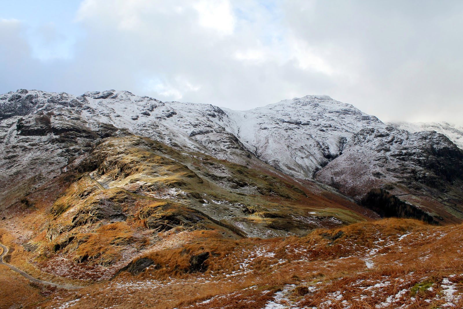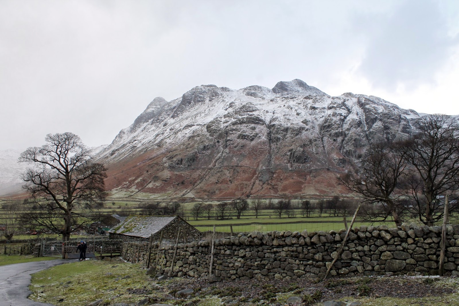 | A subdued but snowy Langdale Pikes |