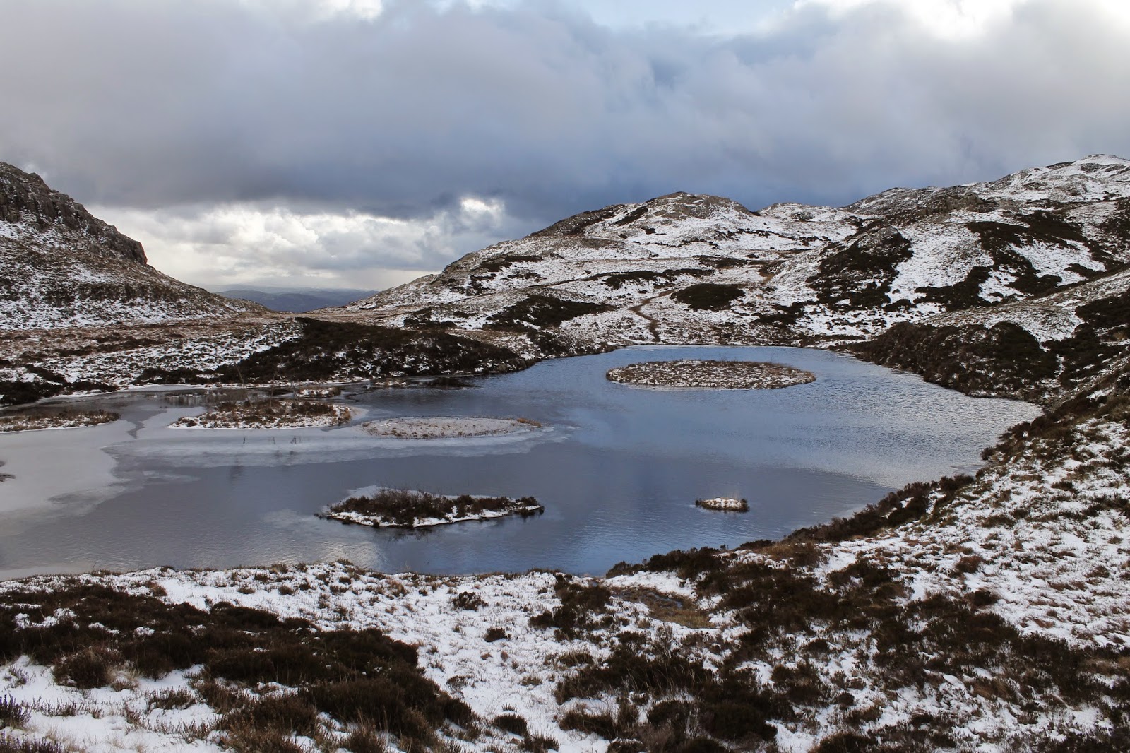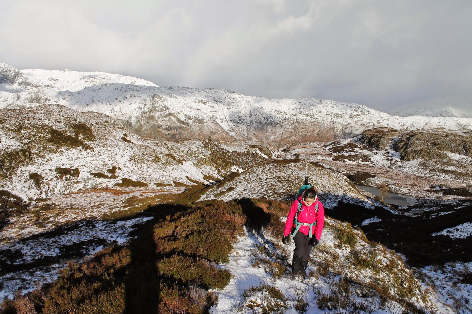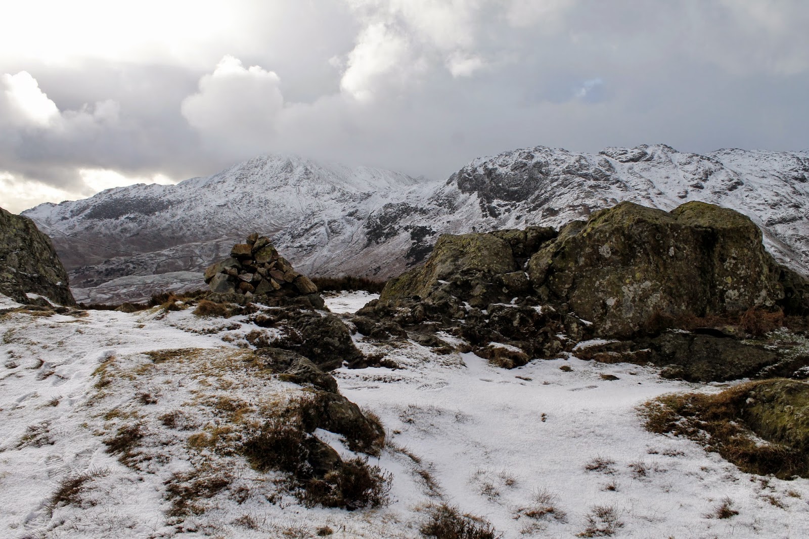We aimed straight up one of the spurs that leads to the main path from Lingmoor Tarn before following the fence to the blustery summit. Once again, the views are excellent and include the Langdale Pikes once again, Wetherlam and across to a distant Windermere, all looking wonderful with a dusting of snow. The fell’s name originates from the Old Norse word lyng meaning “heather covered”.