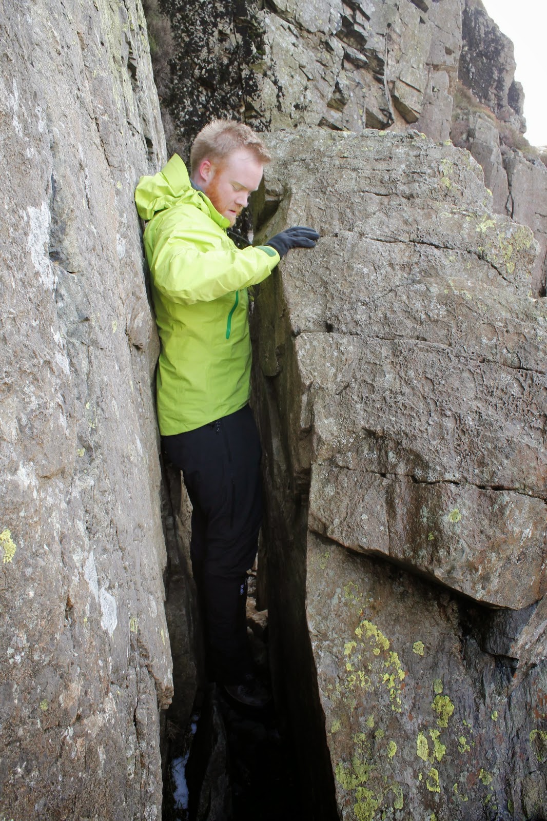 The path passes through a narrow gap between a detached flake of rock and its parent crag. I’m not sure if it has a proper name, I’ve seen it referred to as ‘The Squeeze’, ‘The Squeeze Rock’, ‘Fat Man’s Dilemma’ and ‘Fat Man’s Agony’ (not to be confused with Fat Mans Agony on Broad Stand. Either way, Sara and I managed to shuffle through without obstruction.