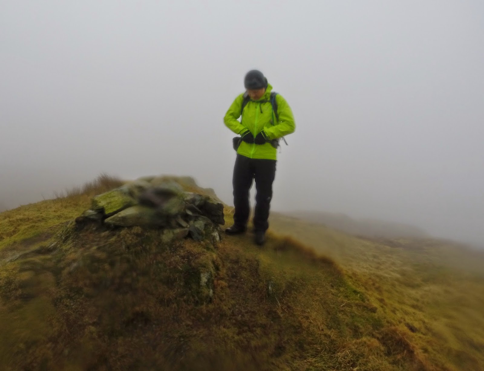 The rain had returned by the time we reached the top, a small cairn marks the spot. We did venture slightly further along the fell top to investigate something in the mist but it turned out to be a tuft of grass rather than anything significant. Job done for the day, we returned to the valley bottom and made our way back to the car some miles away.